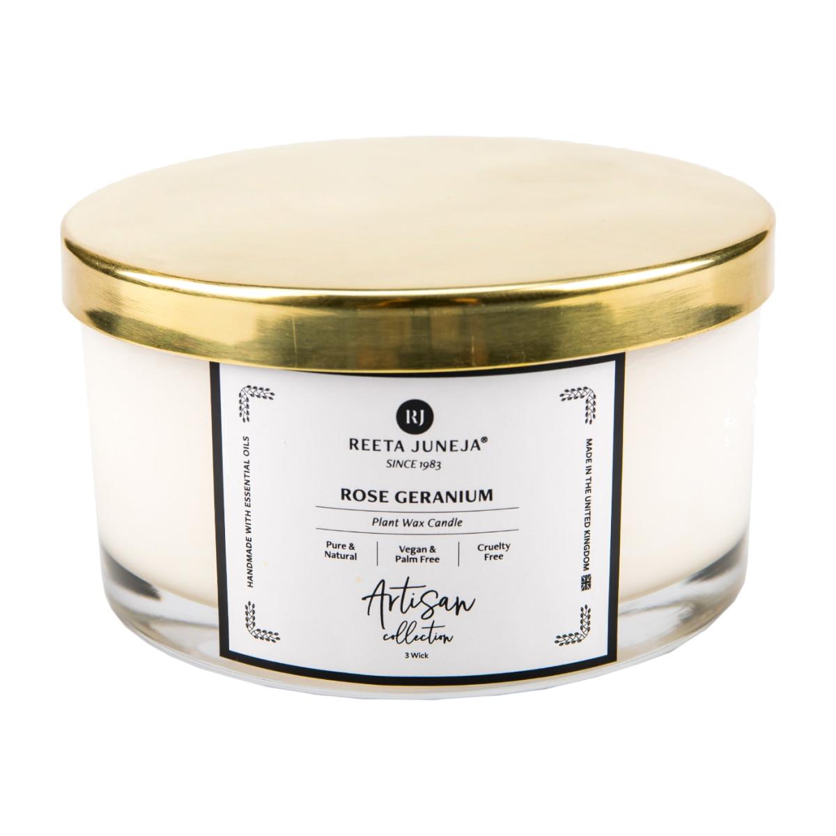 This magnificent 3 wick candle in a luxurious glass bowl with a metal gold lid, is a true aromatherapy experience and makes it a perfect gift for your friends and family. Its enchanting sensual fragrance of rose geranium essential oil makes you feel warm, joyous and relaxed. Burning Instructions:Trim wick to 1/4inch before lighting. Keep candle free of any foreign materials including matches and wick trimmings. only burn the candle on a level, fire resistant surface. Do not burn the candle more than 4 hours at a time. Storage: Store in room temperature. Do not keep in direct sunlight. Do not freeze. What it includes: A gold lid on glass jar with candle and outer packaging is a classic white gift box tied with cream satin ribbon. Caution: Burn candle within sight. Keep away from drafts and vibrations. Keep out of reach of children and pets. Never burn candle on or near anything that can catch fire. If irritation occurs discontinue use.