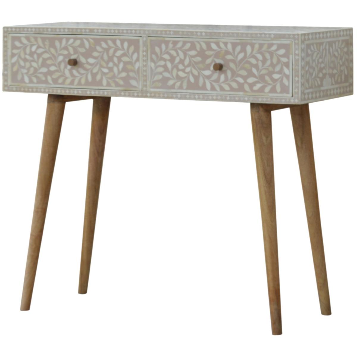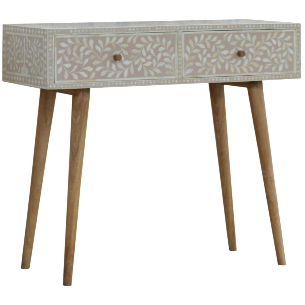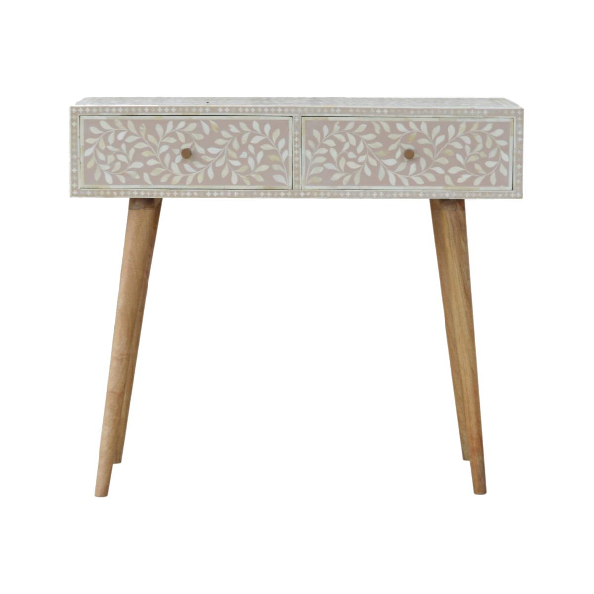 The beautiful console table has been constructed from 100% solid mango wood and features 2 spacious drawers made with a floral bone inlay which has been painted in a light taupe colour and finished with a oak-ish finish base and legs. It can be used as an accent piece in the home or be partnered with the other bone inlay pieces.
