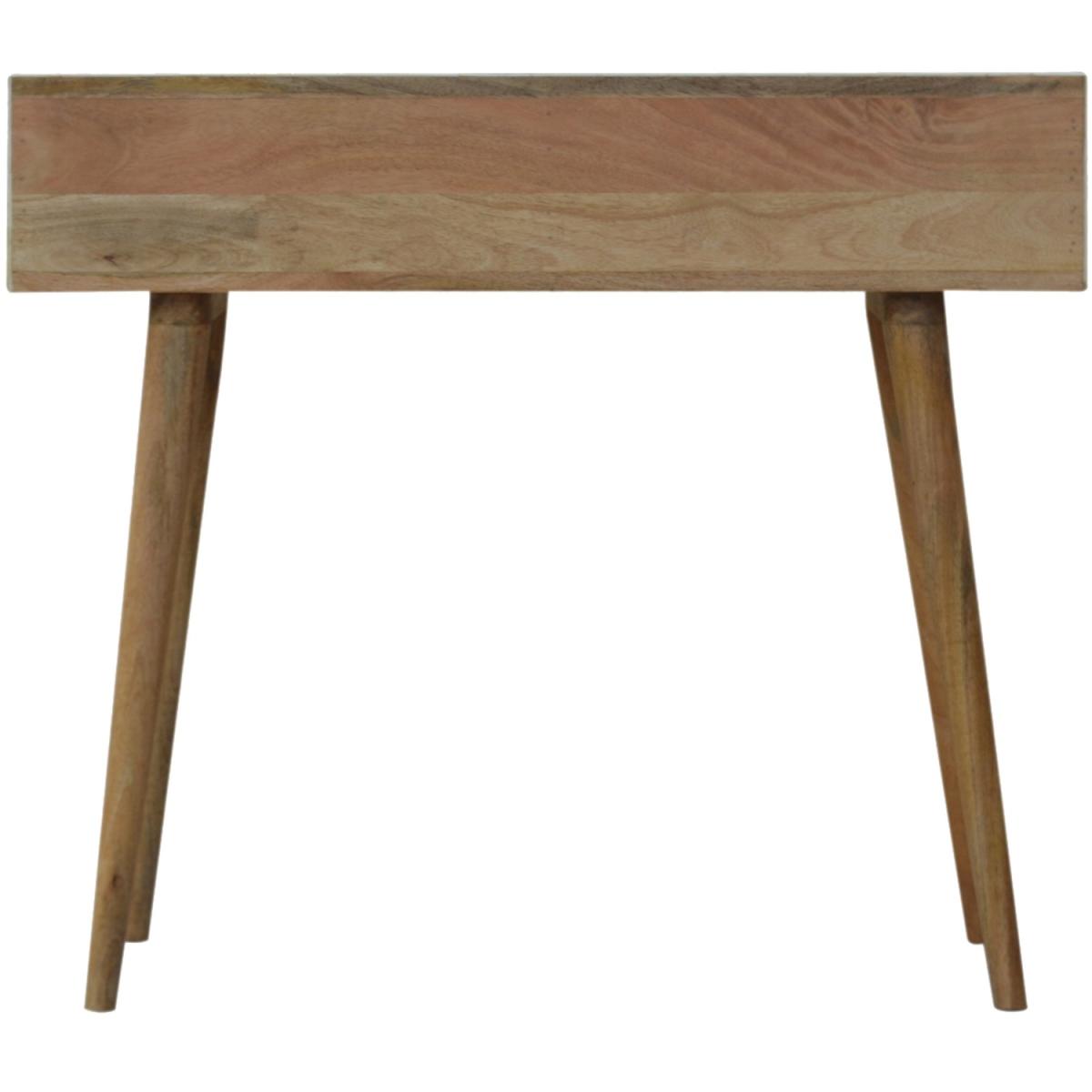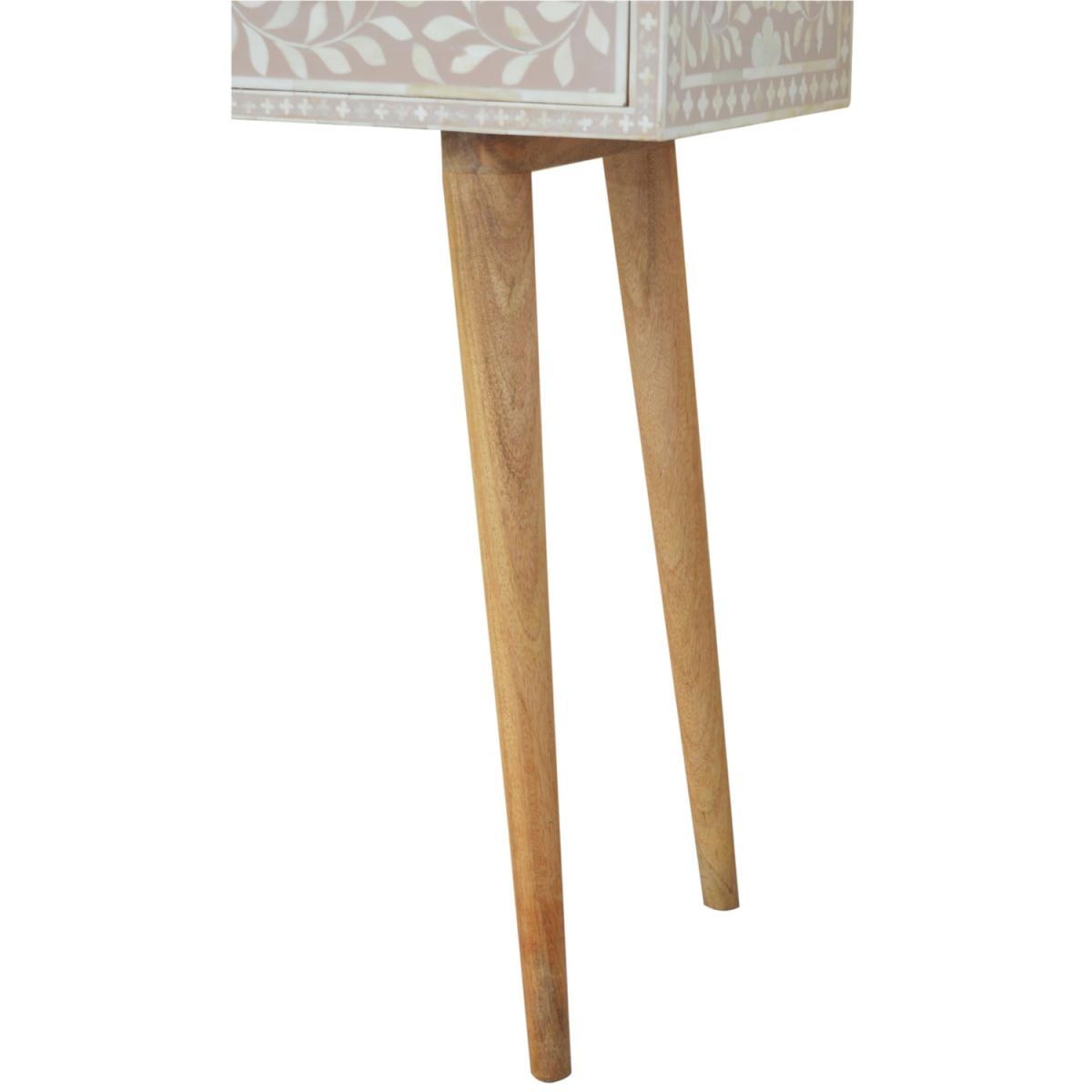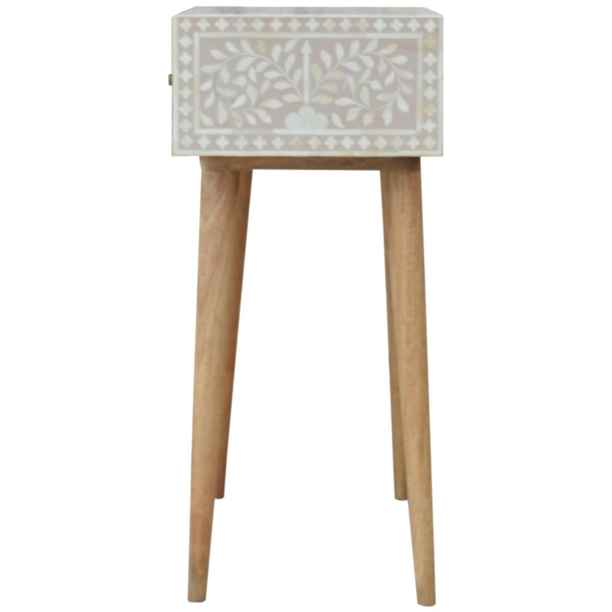 The beautiful console table has been constructed from 100% solid mango wood and features 2 spacious drawers made with a floral bone inlay which has been painted in a light taupe colour and finished with a oak-ish finish base and legs. It can be used as an accent piece in the home or be partnered with the other bone inlay pieces.