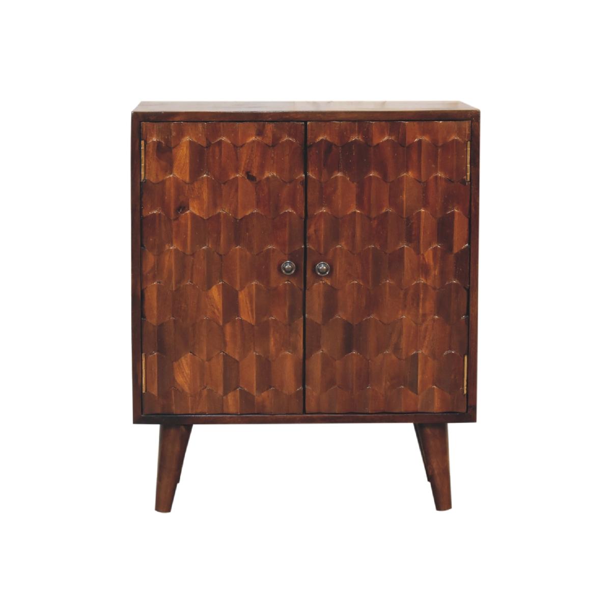 This handy cabinet has been constructed from 100 solid mango wood and has a chestnut finish. Its pineapple carved design gives the product a unique twist and provides enough space with 2 large doors that offer useful storage. Other features include shiny knobs and 4 Nordic style feet. This cabinet is the perfect addition to any home.