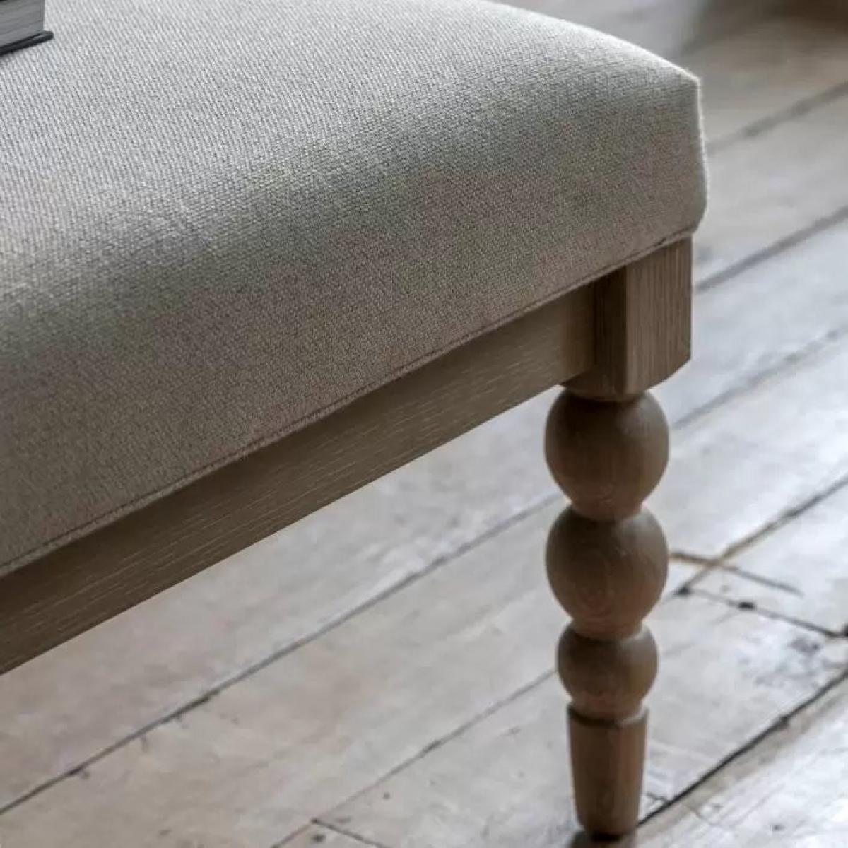 The eye-catching legs on this beautiful coffee table feature hand-crafted bobbin detail which is created by turning the wood on a lathe, a task carried out by the finest craftsmen. The table is made from oak with a very subtle lime wash tone to the finish which is soft and mellow, paired with biscuit coloured fabric for the upholstered seat. Matching pieces are available.