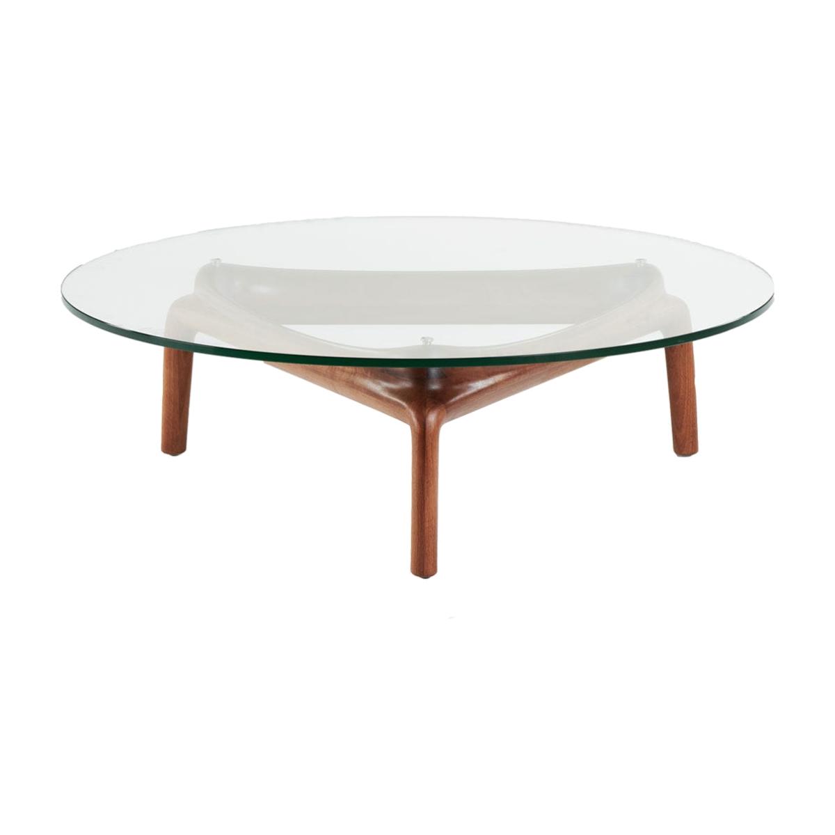 The modern Pascal coffee table was designed by Ado Avdagić for Artisan and makes a beautiful addition to the contemporary home. Elegant and defined, a sleek round glass top sits atop the timber tripod style base design to create a state-of-the-art table that caters to your daily needs. Expertly handcrafted in Europe by skilled artisans, it uses solid wood from renewable resources, environmentally-friendly treatment materials and natural oils and wax that emphasise the organic beauty of the wood.