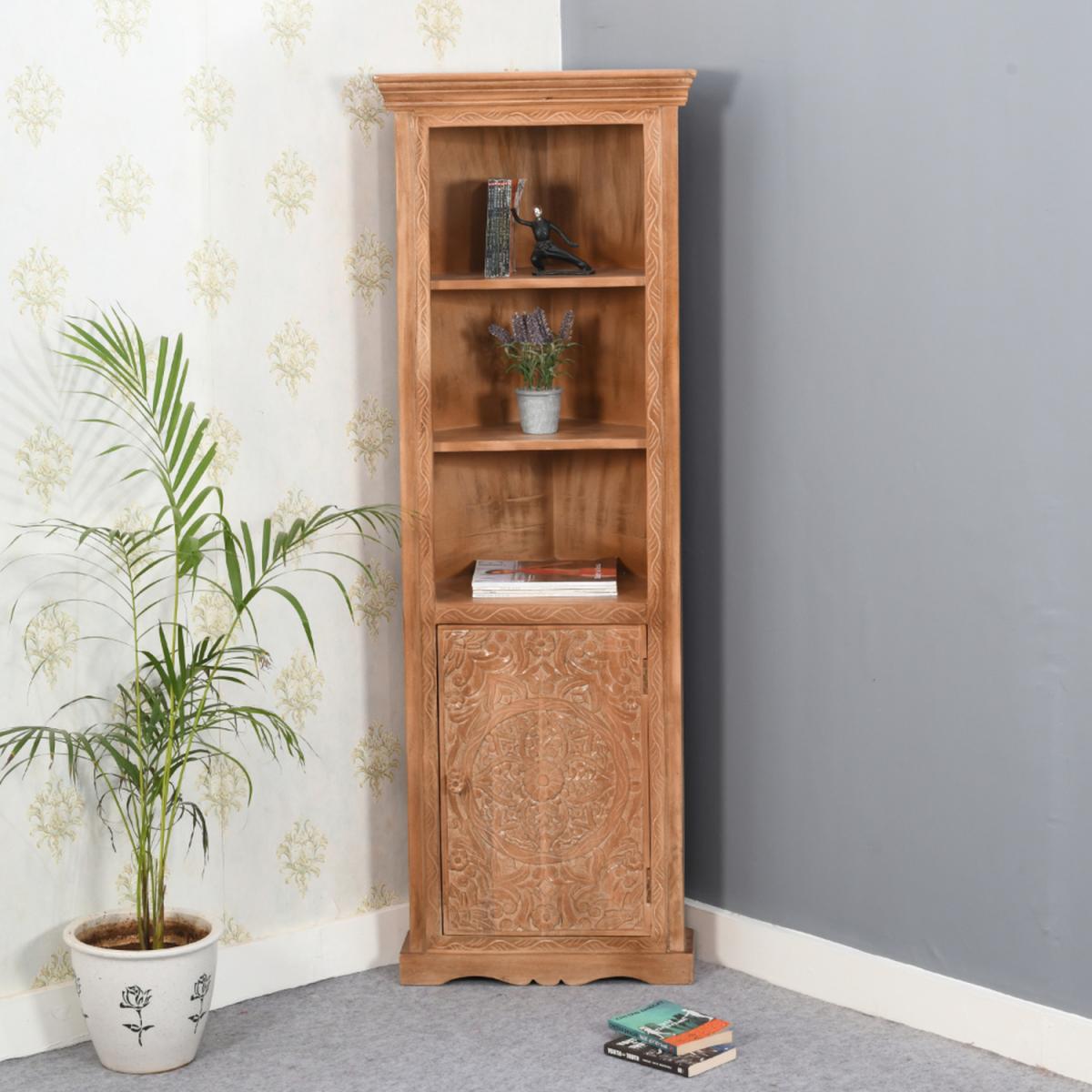 Solid mango wood handcrafted corner bookcase with cupboard. Addition to our new artwork mango range. Beautiful detailing artwork into the 100 eco sourced natural wood.