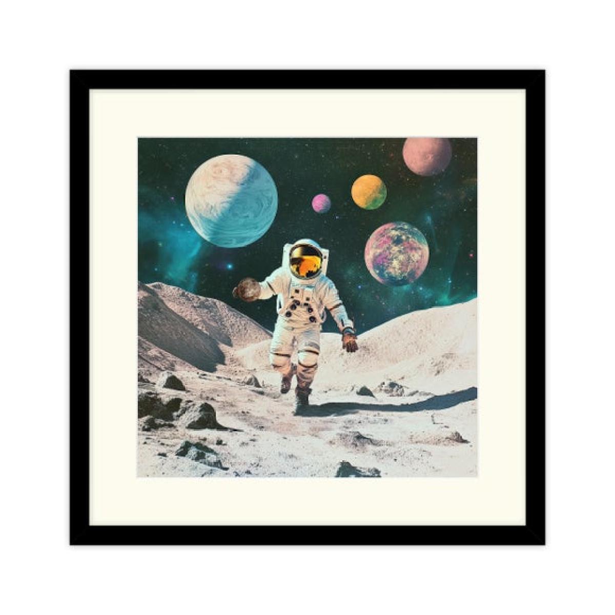 * Outer space artwork * Square black frame * Ready to hang Embark on a surreal outer space adventure with the Artko Planet Chaser Framed Print, a stunning artwork by Raymond Powers. This square-format piece explodes with bold visuals, featuring vivid planetary colours and retro vibes that create a fun sci-fi aesthetic with pop appeal. Mounted with a glass finish and presented in a grained black frame, this art print is ready to hang and transport your room to another dimension.