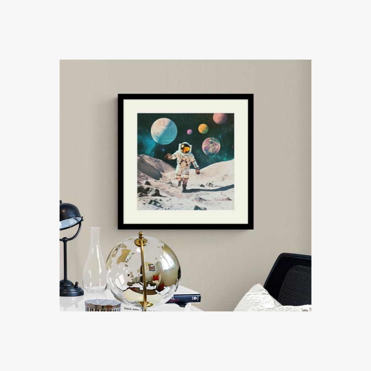 I really like the space-themed print - it adds a touch of fun and curiosity to any room. It works particularly well in modern, minimalist interiors where its bold image can be a focal point. To style it effectively, consider pairing it with neutral tones or subtle textures around the room, allowing the print to stand out without overwhelm. For added impact, display it alongside other contemporary pieces or framed in a sleek, simple frame, like black or white, to keep the focus on the artwork itself. Perfect for a child’s room, creative space, or even a modern lounge, this print brings a playful yet sophisticated vibe.