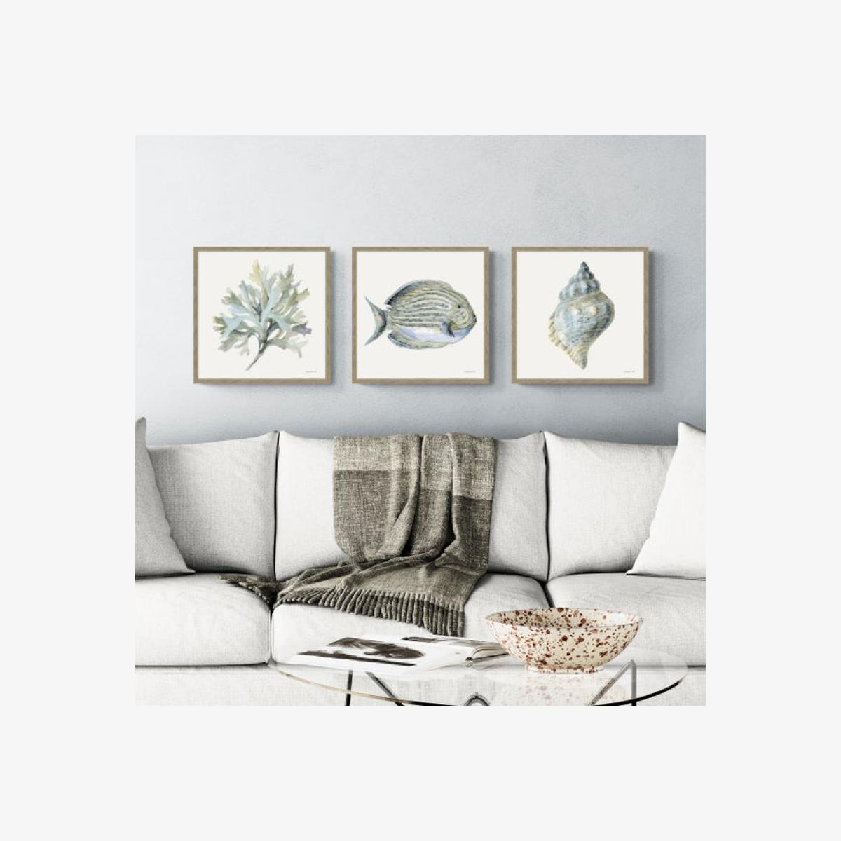 The Artko set of 3 coastal prints is a great addition for adding a calming, seaside vibe to a living space. I love how versatile they are-they work well in both contemporary and rustic interiors, especially in coastal, beach, or nautically themed rooms. To style them effectively, consider placing them above a neutral sofa as shown, which allows the artwork to be the centrepiece, or pair with textured cushions and natural materials like rattan or linen to enhance the relaxed, coastal feel. For a more cohesive look, keep surrounding decor minimal to let the prints stand out, or add a few nautical accessories, such as shells or driftwood, for an extra touch of seaside charm.