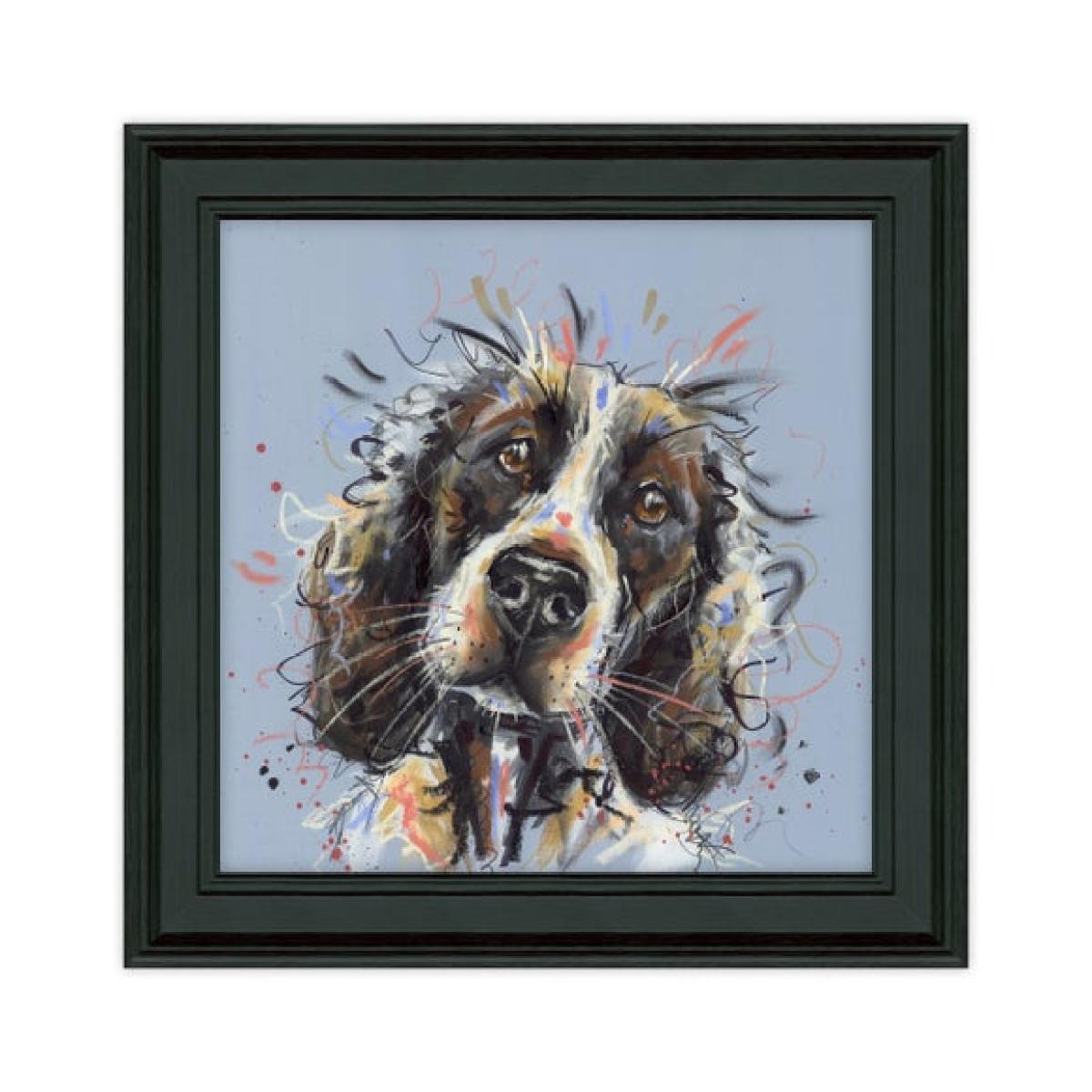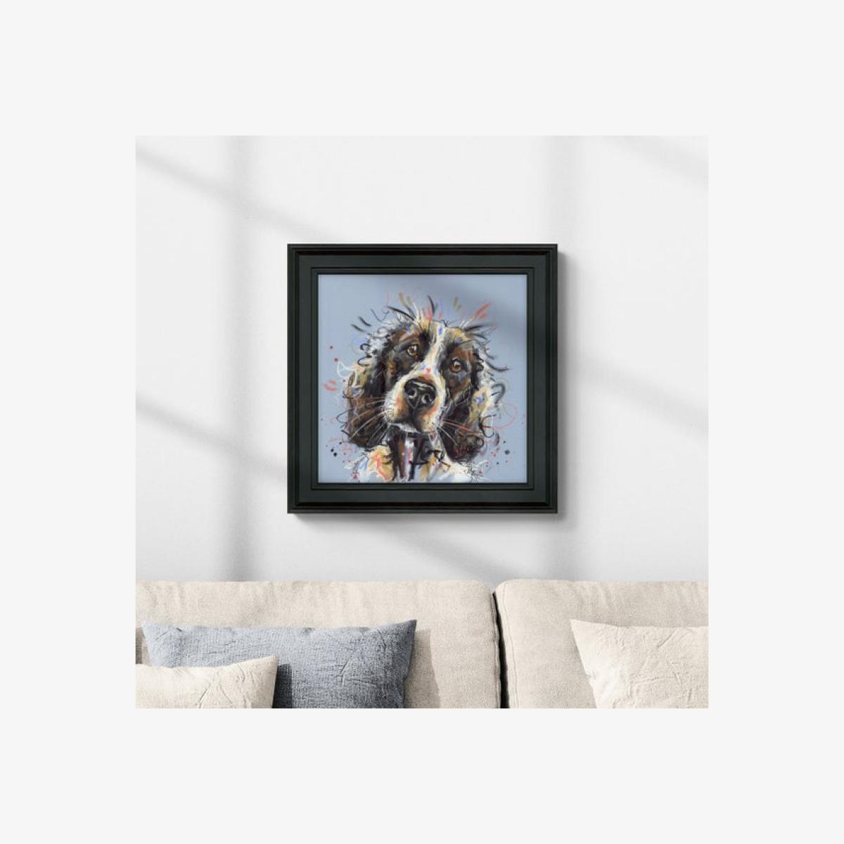 * Framed print * No glass * Colourful style * Dog artwork Bring a heartwarming touch to your home with the Artko Soppy Spaniel Framed Print, a sweet spaniel portrait by artist Lucy Winters. This square-format piece features a light blue background that beautifully complements the energetic brushwork and expressive face of the spaniel. With a unique textured finish on the print (no glass), and presented in a stepped black frame, this charming artwork is ready to hang and is perfect for dog lovers.