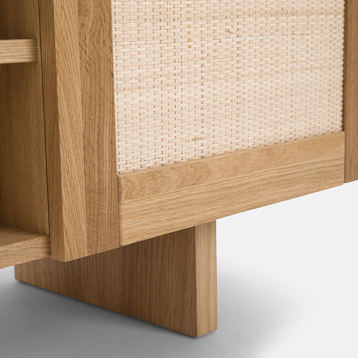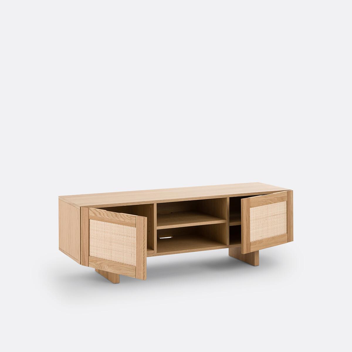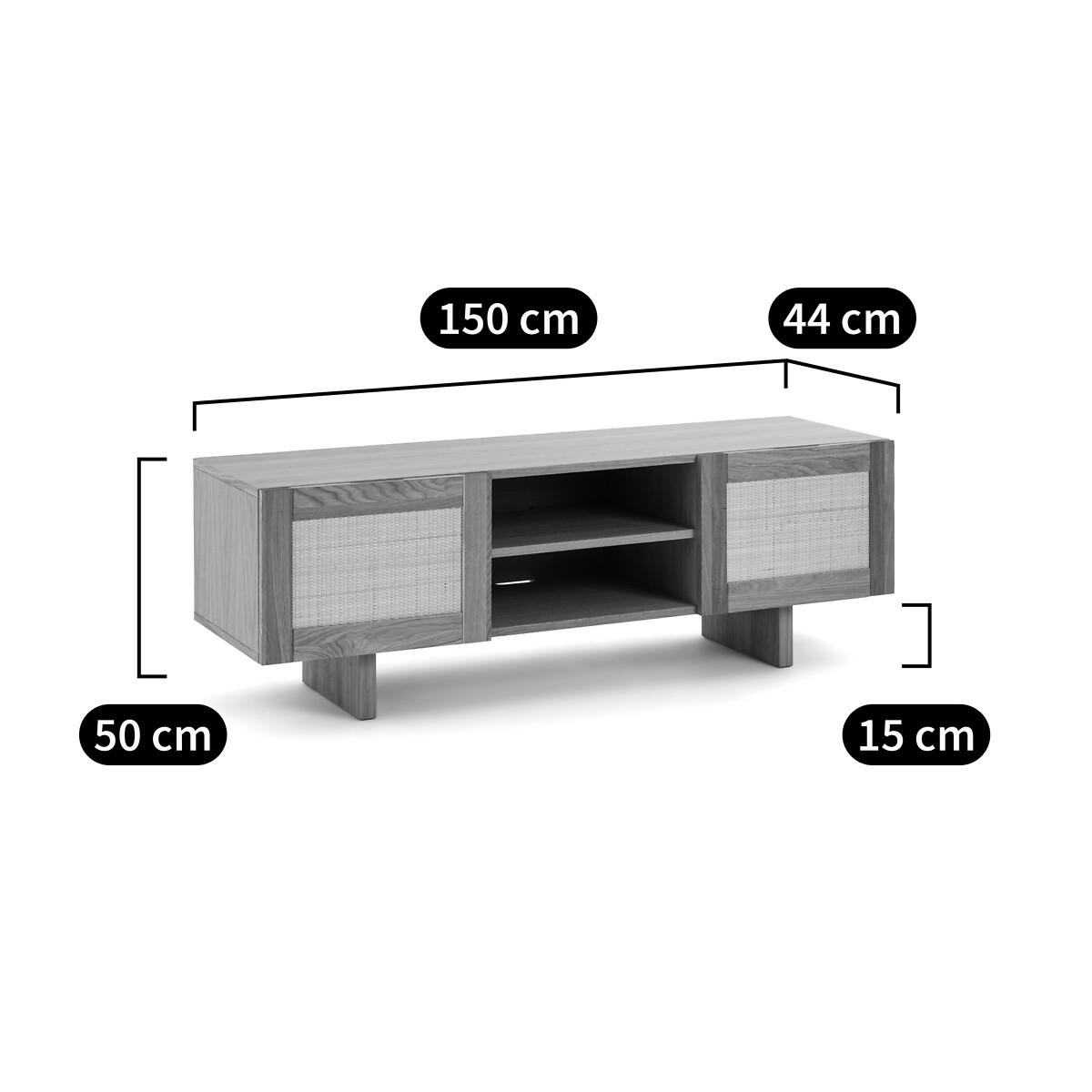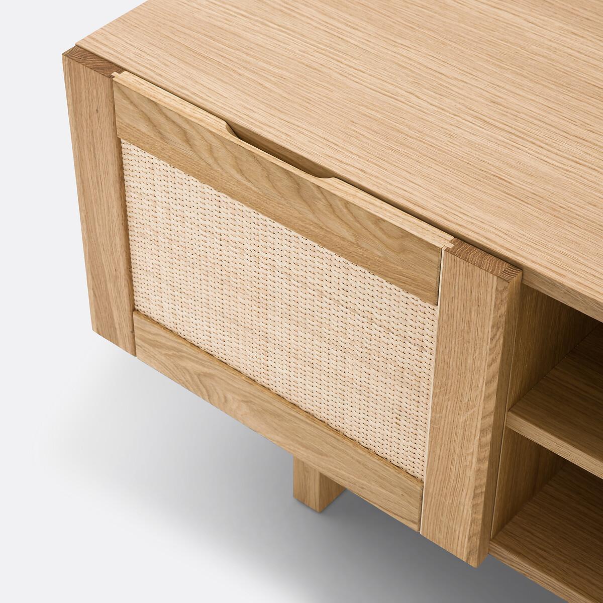 A Scandinavian style with sleek lines: the Arty range combines light tones and canework. Warm furniture, which will find its place in a bohemian style interior. Created by La Redoute Interiors. Made in Europe. Product Details • Unit, legs in oak veneered particle board and door frame in solid oak wood, central door panel in MDF veneered with natural canework, colourless polyurethane varnish finish • 2 veneered doors with canework, 1 removable and adjustable shelf behind each door, 4 compartments • Soft closing hinges • Knockout handles on the top of the doors • 1 compartment in the centre with removable shelf • Cable management hole • Polyethylene feetDimensions. Overall • Width: 150cm • Height: 50cm • Depth: 44cm • Height of legs : 15cm. Usable space • Compartment (without shelf): L46.4 x H30.5 x D40cm • Compartments behind doors (top W50 x H14 x D40.5cm, bottom W50 x H14.5 x D40.5cm)Delivery:This product is sold ready to assemble. • Made in Europe. Dimensions and weight of parcel2 parcels • L71 x H15 x D46cm. 16.7kg • L164 x H8 x D50cm. 25.5kg