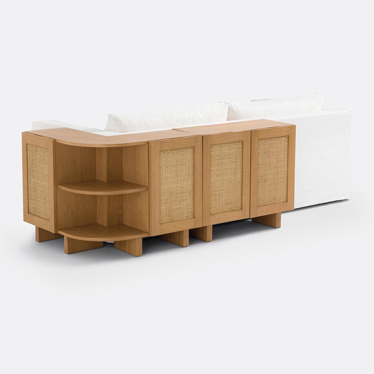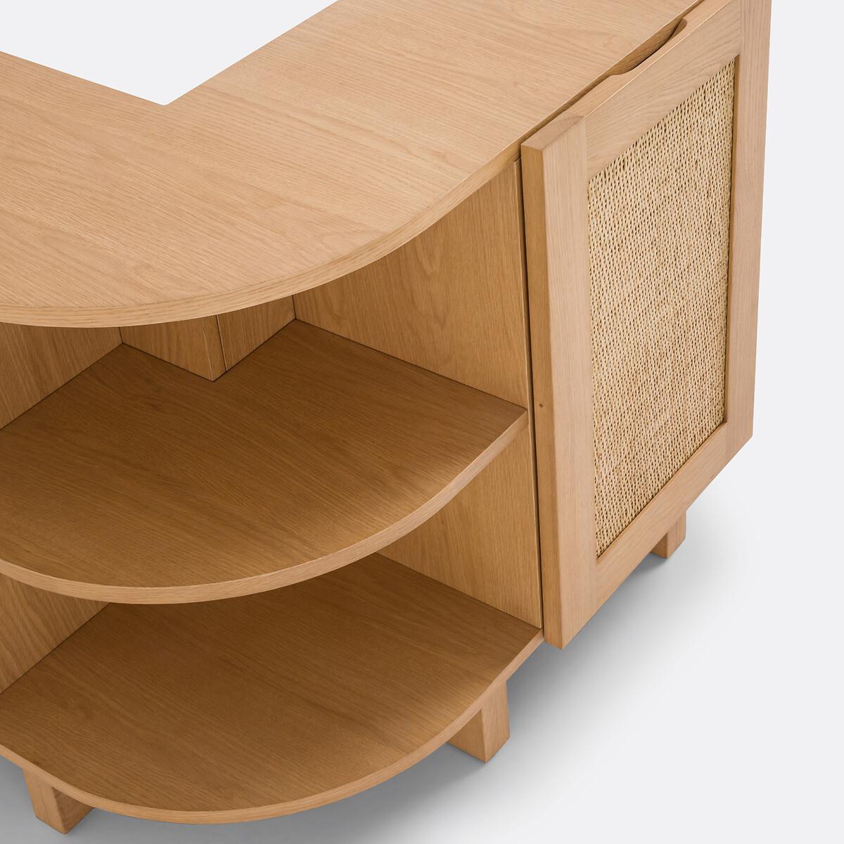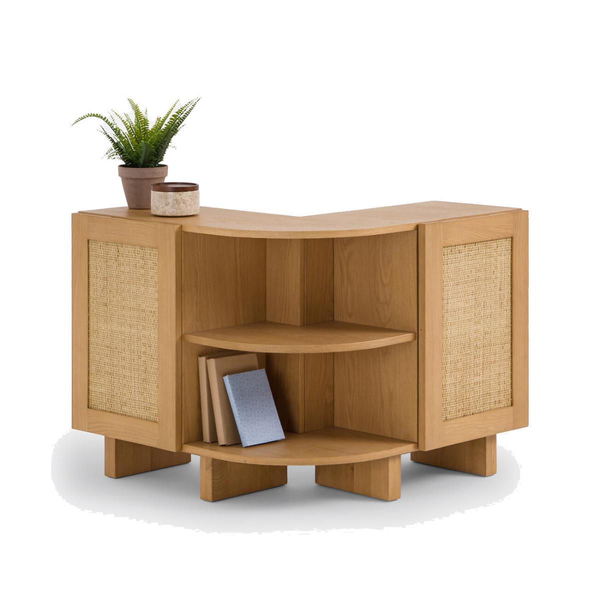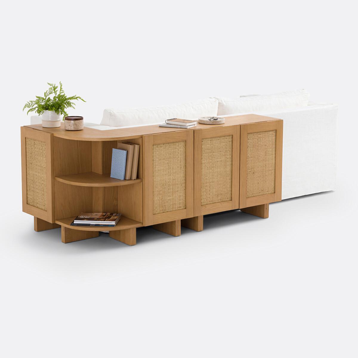 A Scandinavian style with sleek lines: the Arty range combines light tones and canework. Warm furniture, which will find its place in a bohemian style interior. Well thought out, this storage shelf allows you to upgrade the back of a corner sofa and display books and other decorative objects. A creation by our La Redoute Interiors designers, made in Europe. Product Details • Structure in solid oak with nitrocellulose varnish finish • Panels and legs in oak veneered MDF, nitrocellulose varnish finish • 2 doors with rattan canework, nitrocellulose varnish finish • FSC® certified wood • Soft closing hinges • Knockout handles on the top of the doors • 4 closed compartments with 2 removable and adjustable shelves • 1 open compartment in the corner with removable shelf • Combine with the Arty sideboard (sold on our site) for more storage. Quality Info • Soft-closing : soft, silent door closing system, also preventing fingers from being trapped. Dimensions Overall • Width: 82.2cm • Height: 70cm • Depth: 82.2cm • Height of legs: 12cm. Usable space • Compartment upper part (interior box with shelf at intermediate height): L36.2 x H26 x D28cm • Compartment lower part (inside box with shelf at intermediate height): L36.2 x H26 x D26cm • Corner compartments (with intermediate height shelf): L56.6 x H26.1 x D28cm • This product requires assembly. • Made in Europe. • WOOD FROM SUSTAINABLY MANAGED FORESTS. FSC® certified wood comes from forests that are environmentally, socially and economically well managed. Dimensions and weight of parcel1 parcel • L97.3 x H18.5 x D90.8cm. 49kg