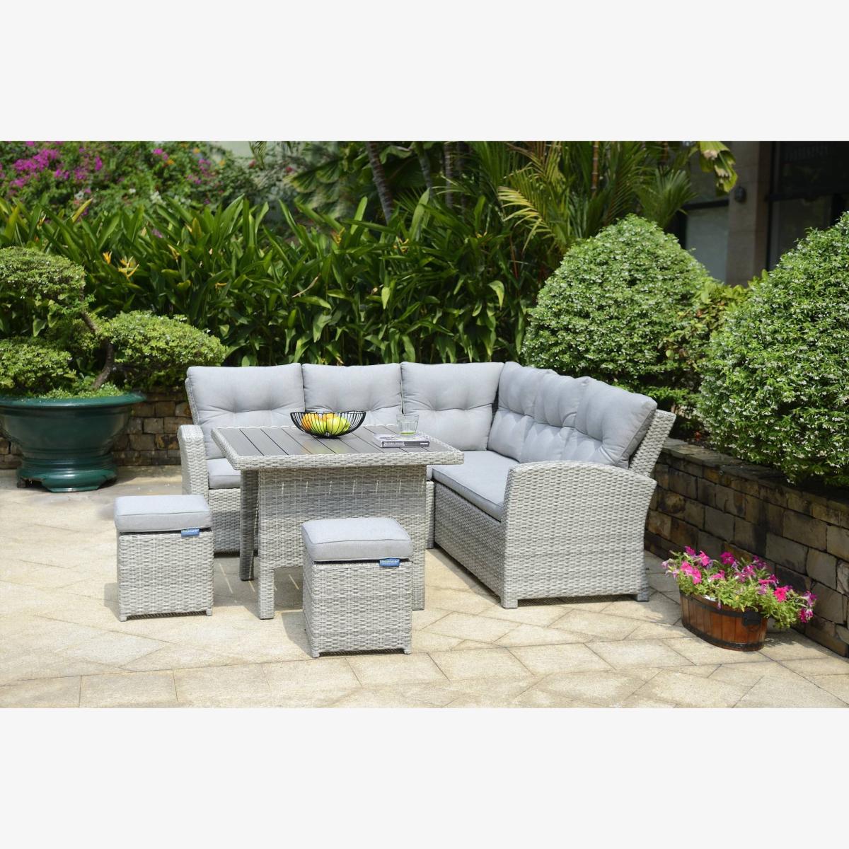 The Aruba range features Duraboard table tops, Petan synthetic wicker and polyester cushions to create a stunning yet hard-wearing product for use for years to come Featuring a weather resistant, maintenance free, environmentally friendly table top that is built to stand the rest of time. The Aruba's table top is highly UV-resistant and comes with a hard wearing unique surface finish. This Aruba range from Lifestyle Garden features Petan wicker, which is a weather resistant, maintenance free, 100% recyclable handwoven synthetic wicker that has excellent colour fastness. Petan is made from a combination of raw polyethylene and eco-friendly colourants to ensure a hard wearing & stylish weave. The Aruba Lite Corner Casual Dining Set consists of the following: 1 x LHF Lite Corner Sofa - W 122cm x D 73cm x H 80cm 1 x RHF Lite Corner Sofa - W181cm x D 73cm x H 80cm Corner Footprint - W181cm x D 195cm x H 80cm 1 x Square Coffee Table - W 90cm x D 90cm x H 66cm 2 x Lite Footstools - W 35cm x D 35cm x H38cm Additional Information: Cushion's should be stored indoors. Clean table and chairs with warm soapy water. This product is very low maintenance. 5 Year Manufacturers Warranty on the frame & wicker 3 Year Manufacturers Warranty on the Duraboard table top 2 Year Manufacturers Warranty on the cushions Please note, all screens vary in colour reproduction and whilst every effort has been made to display the colour as accurately as possible it is for guidance only.