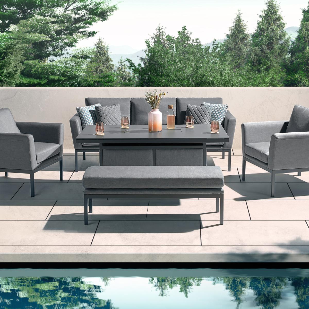 Enjoy entertaining outdoors this season with the Aruba 3-Seater and 2 Armchairs Set with Fire Pit Table and Bench. Create the best environment for Summer BBQs, cosy gatherings with friends and family or even just a place for you to relax and unwind with a good book at the end of the day. Thick, quick-dry foam and the weather-resistant fabric is used to help you make the most our British weather has to offer. Easy to light fire pit table includes cast iron grill plates, perfect for Raclette dinner parties or outdoor cooking.