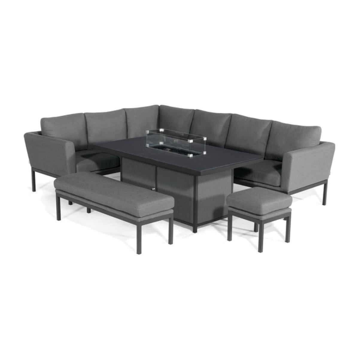 A stunning large fire pit built into the rectangular garden table completes this luxury outdoor furniture set. Available to use as a normal dining area during the day by placing the included cover over the fire pit area or alternatively use as a fire pit area with the beautiful glass firestones. Meanwhile, the comfortable corner sofa, bench and stool are made from the unique Sunbrella fabric, a material often used on yachts. The material contains UV and water-resistant properties, with quick-dry foam, allowing you to leave the furniture outside all year round and use it quickly after showers. You can also simply jet wash the furniture clean or use lukewarm water.