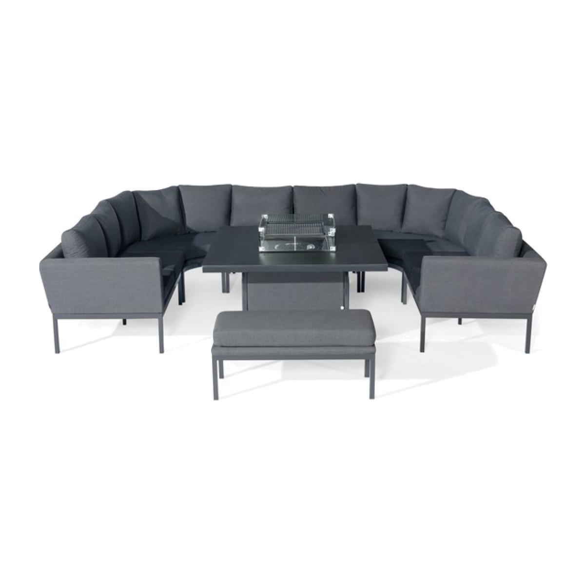 Outdoor entertaining has never been easier than with the Aruba Outdoor Fabric U-Shaped Garden Sofa with Fire Pit Table and Bench. Perfect for big families, large outdoor gatherings, and just for ample outdoor seating. You can seat up to 10 or 12 people comfortably. Easy to light fire pit table includes cast iron grill plates, perfect for Raclette dinner parties or outdoor cooking. Alternatively, you can hide the fire pit away completely to extend your surface area size to use as a lovely casual area. Sunbrella patio furniture is the best garden furniture for our British weather.