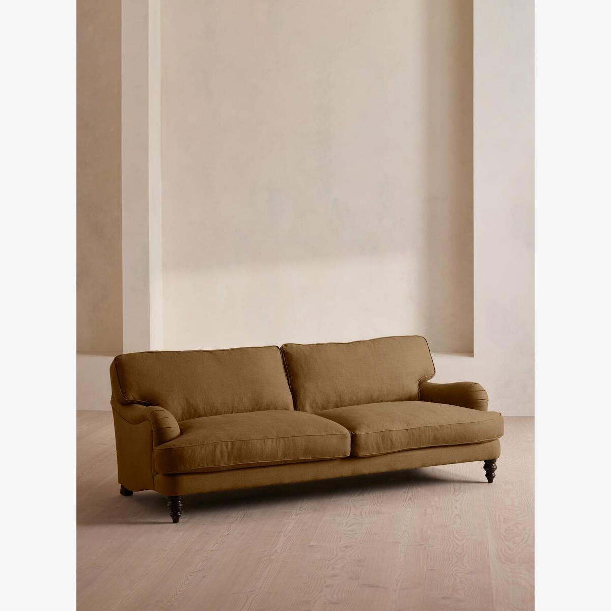 Inspired by the country interiors of Soho Farmhouse, our four-seater Arundel sofa is cut from linen and shows our take on a traditional English roll arm. The feather-wrapped foam seat cushions enhance the deep-sit lounger shape, while an elongated back offers additional comfort and support. Soho House take on a traditional English roll arm Deep-sit lounge style High back for extra comfort Feather-wrapped foam linen cushions Solid wood turned legs Inspired by Soho Farmhouse