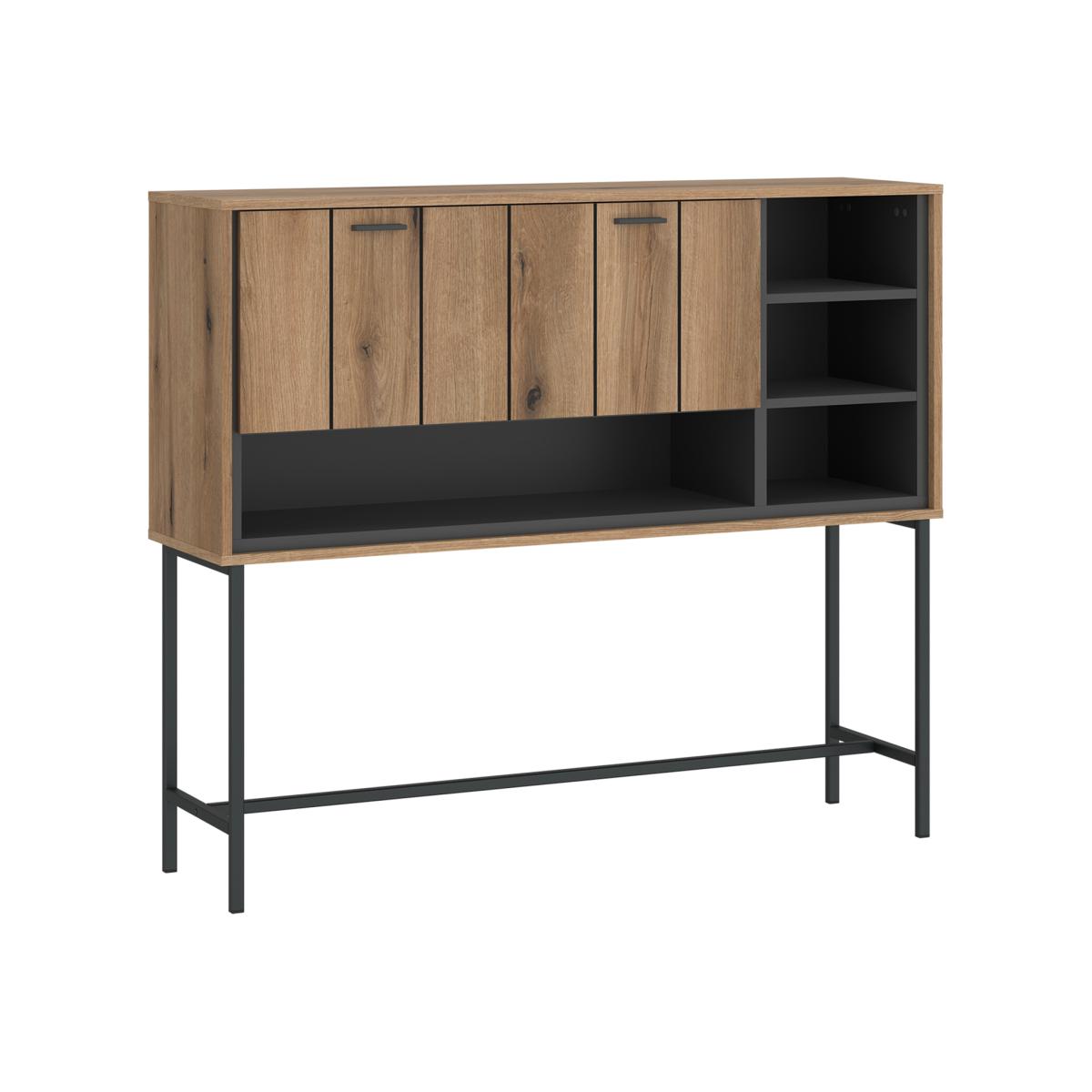 Transform your living or dining area with the stunning Arundel Single Flap Bar Table. This piece seamlessly blends modern sophistication with industrial charm, featuring an elegant colourway adorned with sleek anthracite accents. Its sleek metal base provides stability, while the practical top flap opens to reveal spacious open shelves, perfect for displaying your favourite glassware, plates, bows and more. Crafted from laminated chipboard and MDF, this sturdy bar table complements a variety of interior styles, be it contemporary, vintage, industrial, or an eclectic mix. Its versatility makes it an ideal addition to your home, enhancing functionality without compromising on style. Pair it with other furniture from the Arundel collection to create a cohesive look that captures attention.