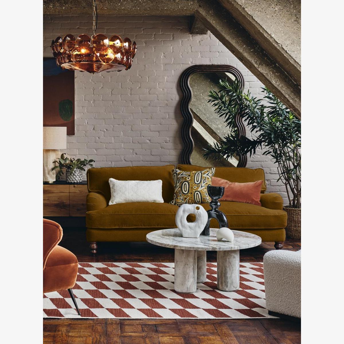 I love the mustard velvet sofa for its bold colour and luxurious texture, making it a statement piece that can elevate a variety of interiors. It works beautifully in eclectic, modern, or retro-inspired spaces, especially when paired with warm neutral tones or complementary jewel hues. Practical styling tips include balancing the vibrant mustard with textured cushions or throws in softer shades, and pairing it with both brass and wood accents for warmth. To keep it looking fresh, avoid overly busy patterns nearby, allowing the sofa's rich hue and plush material to stand out and anchor the room.