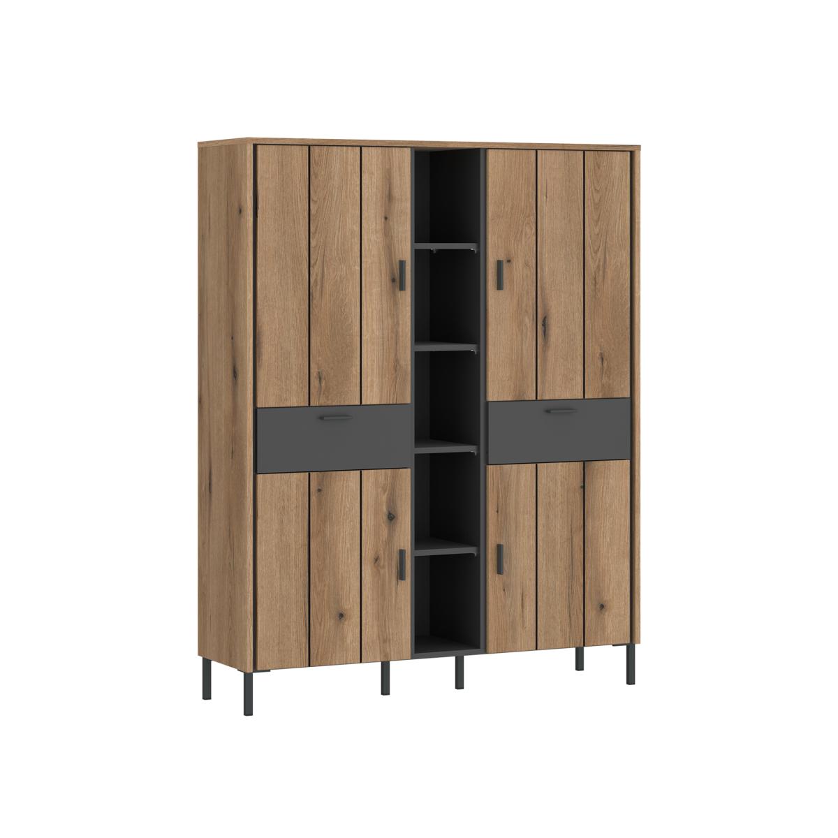 Upgrade your living or dining room into a stylish haven with the Arundel Wardrobe, a perfect blend of contemporary design and functional storage. Its chic oak shade effect, paired with sophisticated anthracite accents, brings a touch of elegance to any space. This wardrobe features four doors and two spacious drawers, providing ample storage for both clothing and other essentials. Constructed from durable laminated chipboard and MDF, it ensures longevity while maintaining its sleek appearance. The spacious shelves ensure easy organising, while the soft-close hinges and smooth ball-bearing drawers add to the wardrobe's quality and user-friendly design. Finished with sleek handles and high metal legs, this wardrobe is a statement of modern living that enhances the aesthetic and functionality of your home.