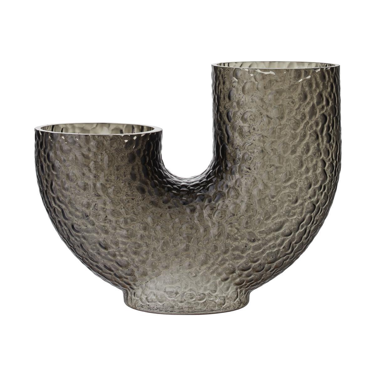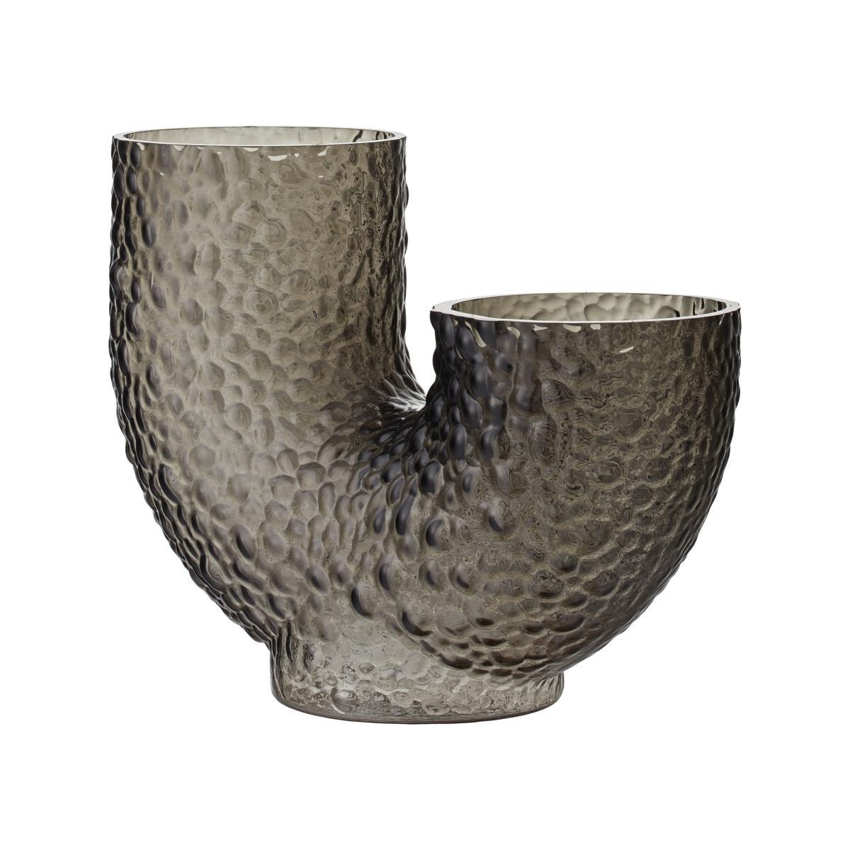 Arura vases are made of hand-blown glass, which makes each piece unique. Eccentric and mysterious, they feature strange, curved shapes that irresistibly catch the eye and stimulate the imagination. The double opening suggests a new way of arranging flowers. The textured glass is decorated with embossed patterns. This incredibly tactile surface is reminiscent of reptile scales or the rough, bumpy surface of animal skin. Both refined and wild, these vases embody an organic sensibility and arouse poetic sensations. It’s the grain of the material, its roughness, its irregularities that give it its character. Arura vases dress your room with their graphic presence.