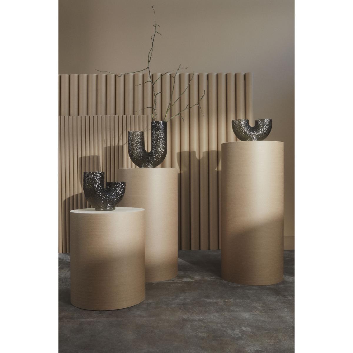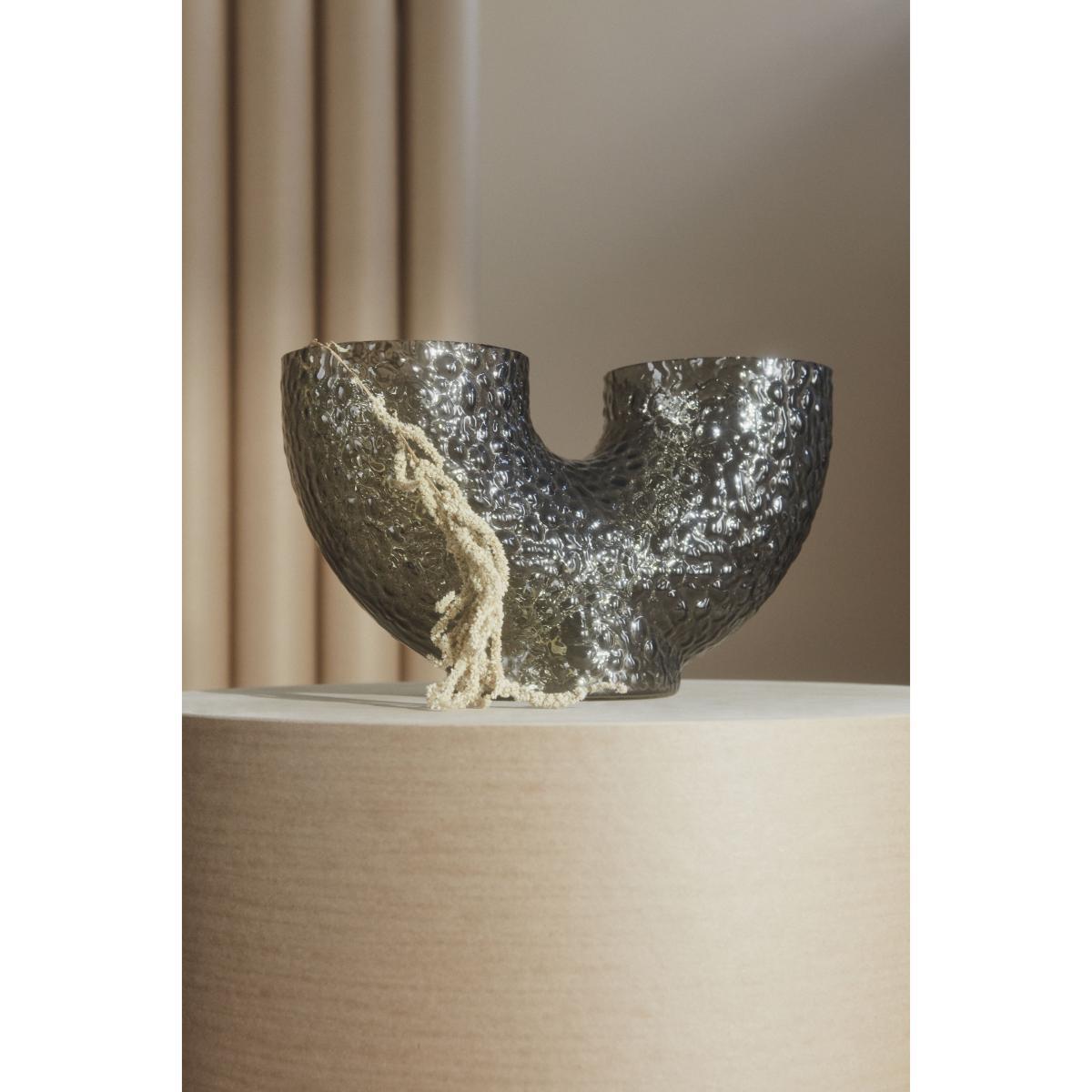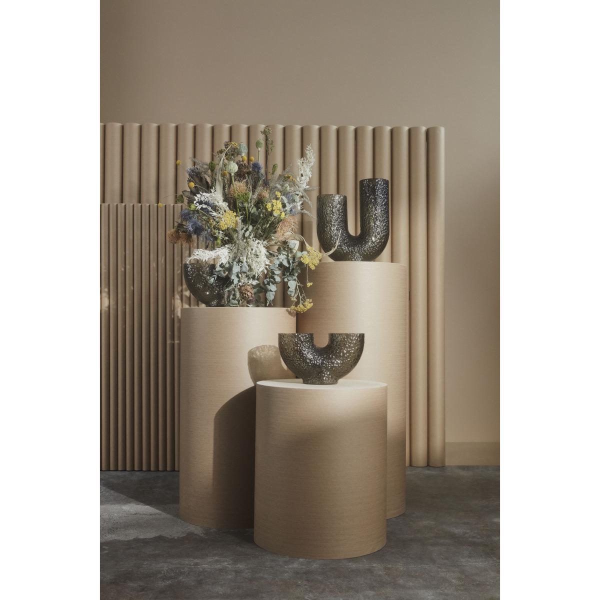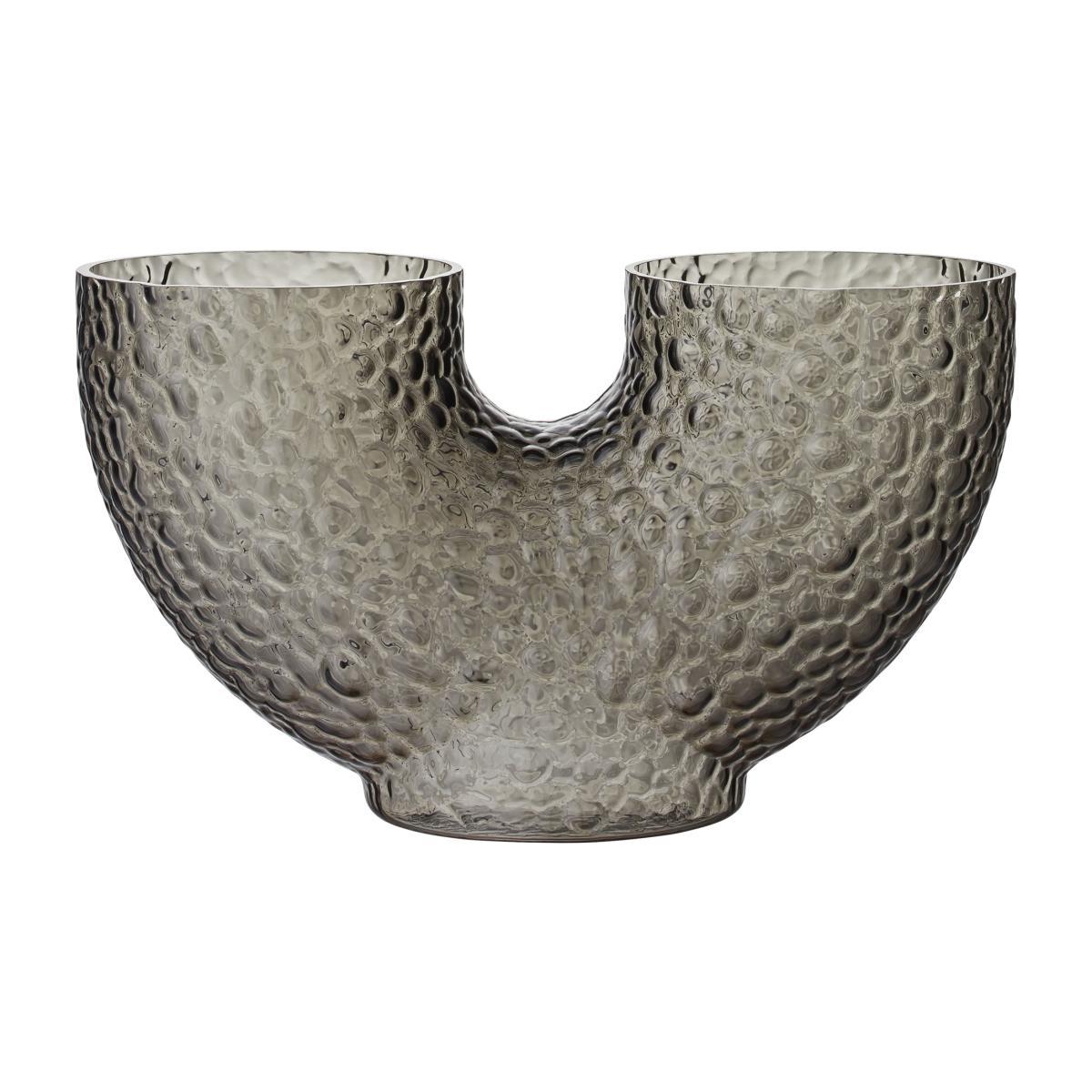 Arura vases are made of hand-blown glass, which makes each piece unique. Eccentric and mysterious, they feature strange, curved shapes that irresistibly catch the eye and stimulate the imagination. The double opening suggests a new way of arranging flowers. The textured glass is decorated with embossed patterns. This incredibly tactile surface is reminiscent of reptile scales or the rough, bumpy surface of animal skin. Both refined and wild, these vases embody an organic sensibility and arouse poetic sensations. It’s the grain of the material, its roughness, its irregularities that give it its character. Arura vases dress your room with their graphic presence.