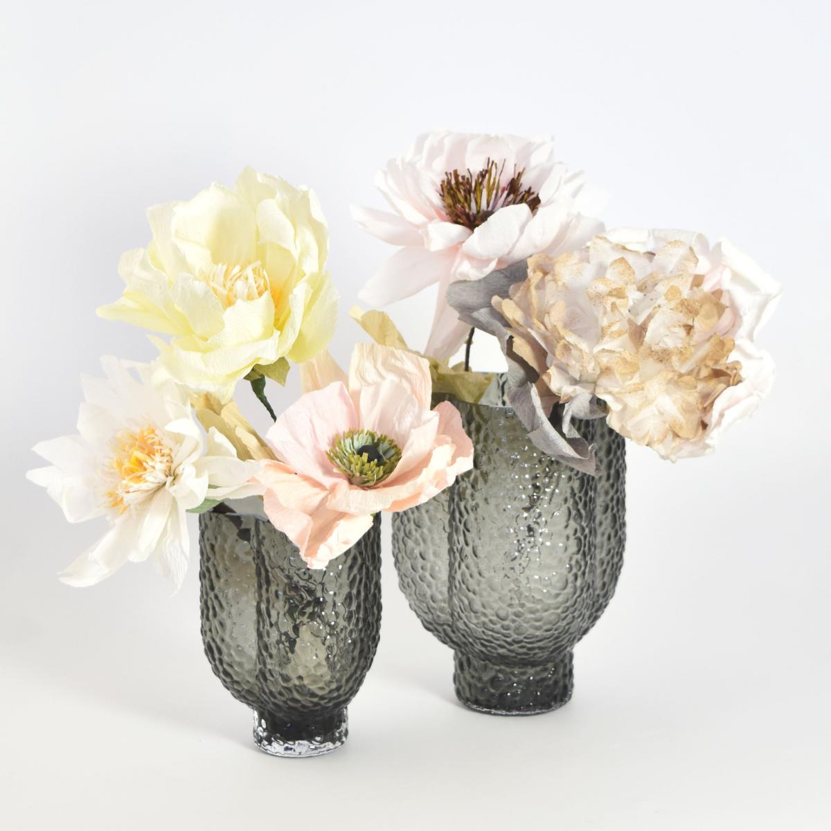 The Arura vases are made with hand-blown glass, making each piece unique. Eccentric and mysterious, they feature strange, curving shapes that irresistibly captivate the attention and stimulate the imagination. The undulating shape suggests a new way of organising flowers. The textured glass is decorated with 3D patterns. This incredibly tactile surface is sure to evoke thought of reptile scales or the bumpy, rugged surface of animal skin. Elegant with a wild edge, these vases embody an organic sensibility that evokes poetic sensations. Its the grain of the material, along with its asperities and irregularities that make the character of this piece so unique. The Arura vases will enhance any space with their graphical presence.
