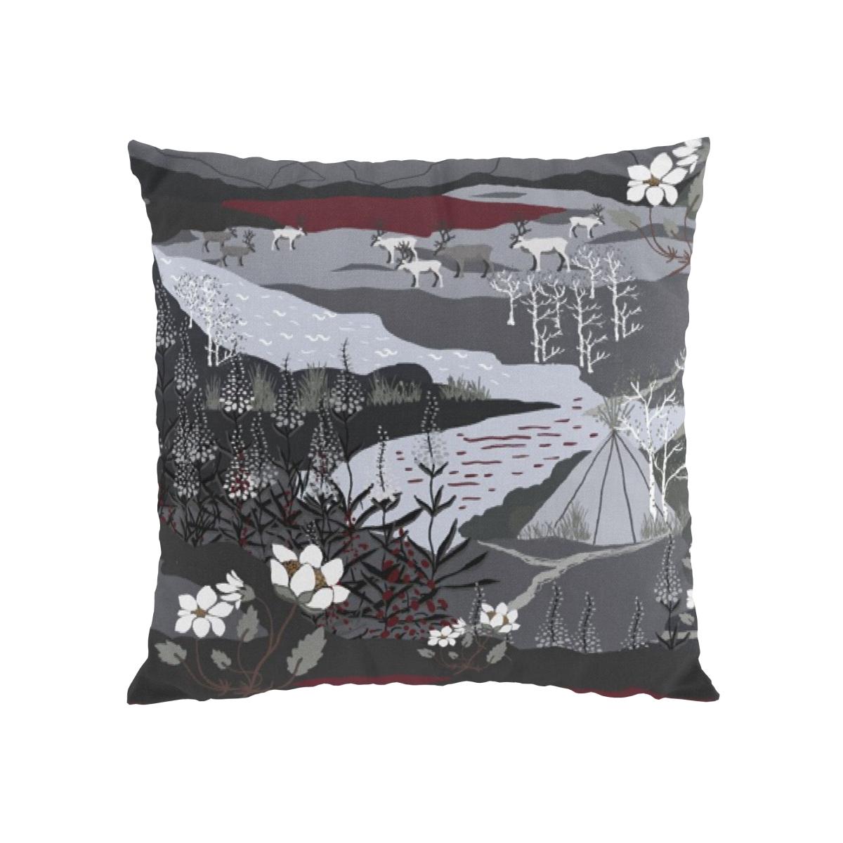 Fjällvandring cushion cover 47x47 cm from Arvidssons Textil has a beautiful mountain-inspired pattern that is printed on 100% cotton. It would do nicely on a stool in the hall, for instance, or on the sofa in the sitting room. The pattern with mountains, reindeer and flowers is designed by Louise Videlyck.