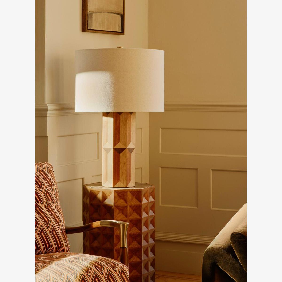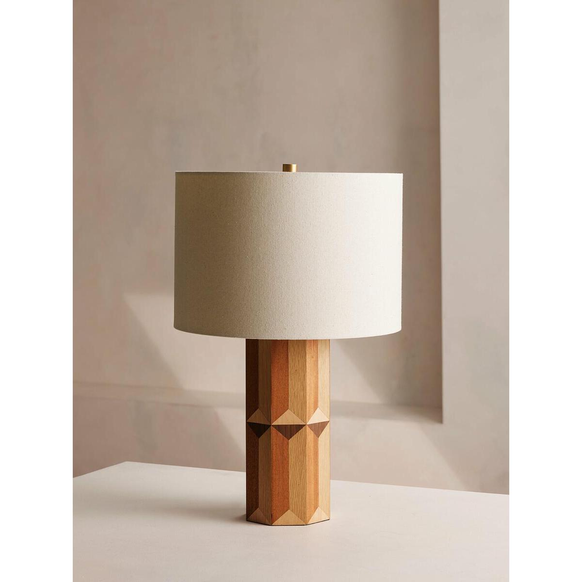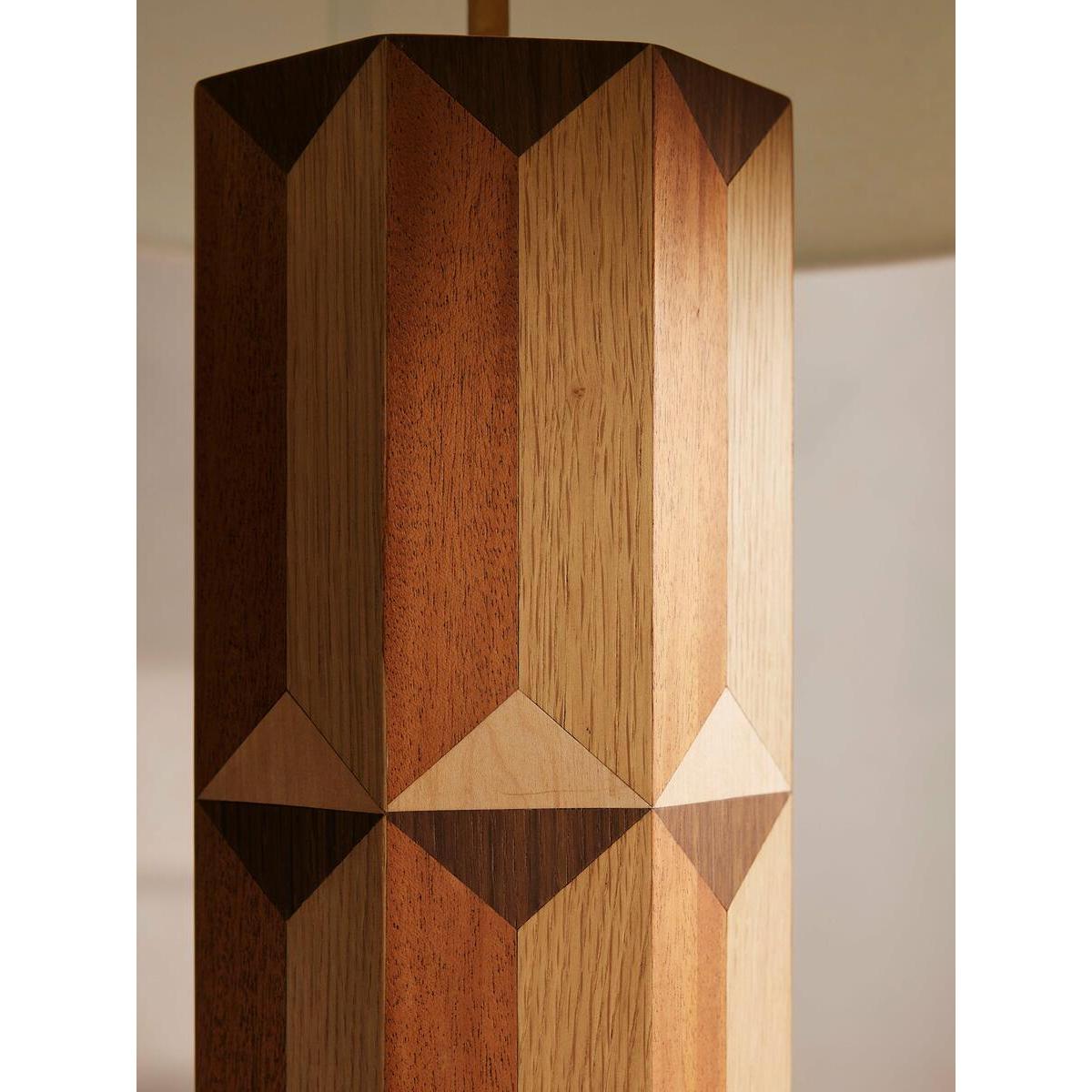 Showcasing our love of bold marquetry finishes, the Arwen table lamp adds character and dimension to a side table or desk. A handmade base of cherry wood and oak veneer panels have been arranged to form a two-tone geometric design with a three-dimensional look. Complemented with a neutral linen drum shade, this unique piece takes inspiration from White City House. Wooden table lamp Handcrafted marquetry design Cherry wood and oak veneer 3D geometric design Hexagonal base Natural linen drum shade Inspired by White City House