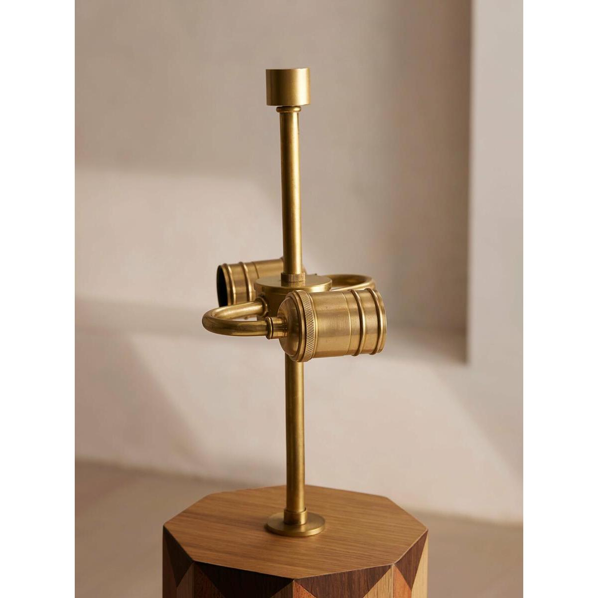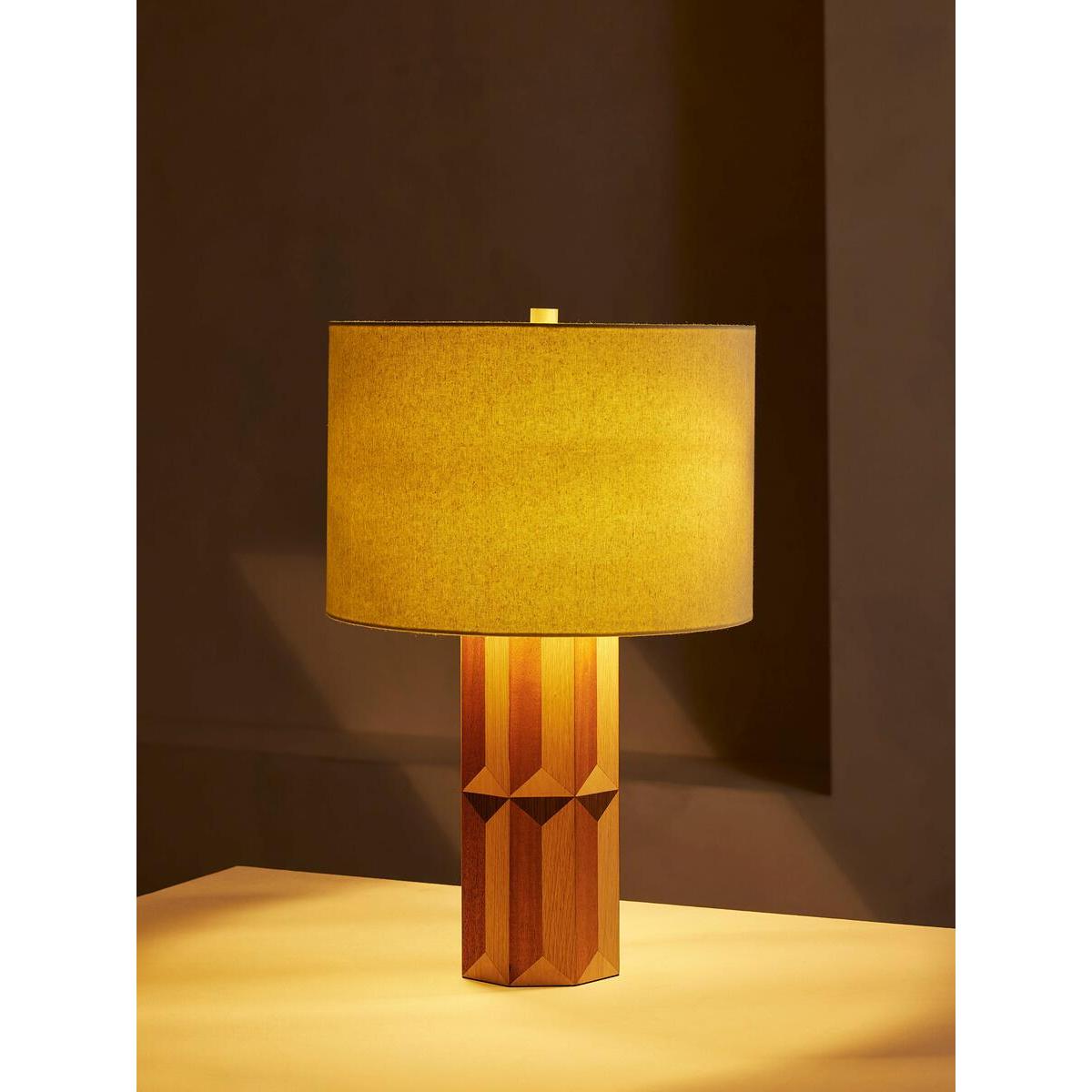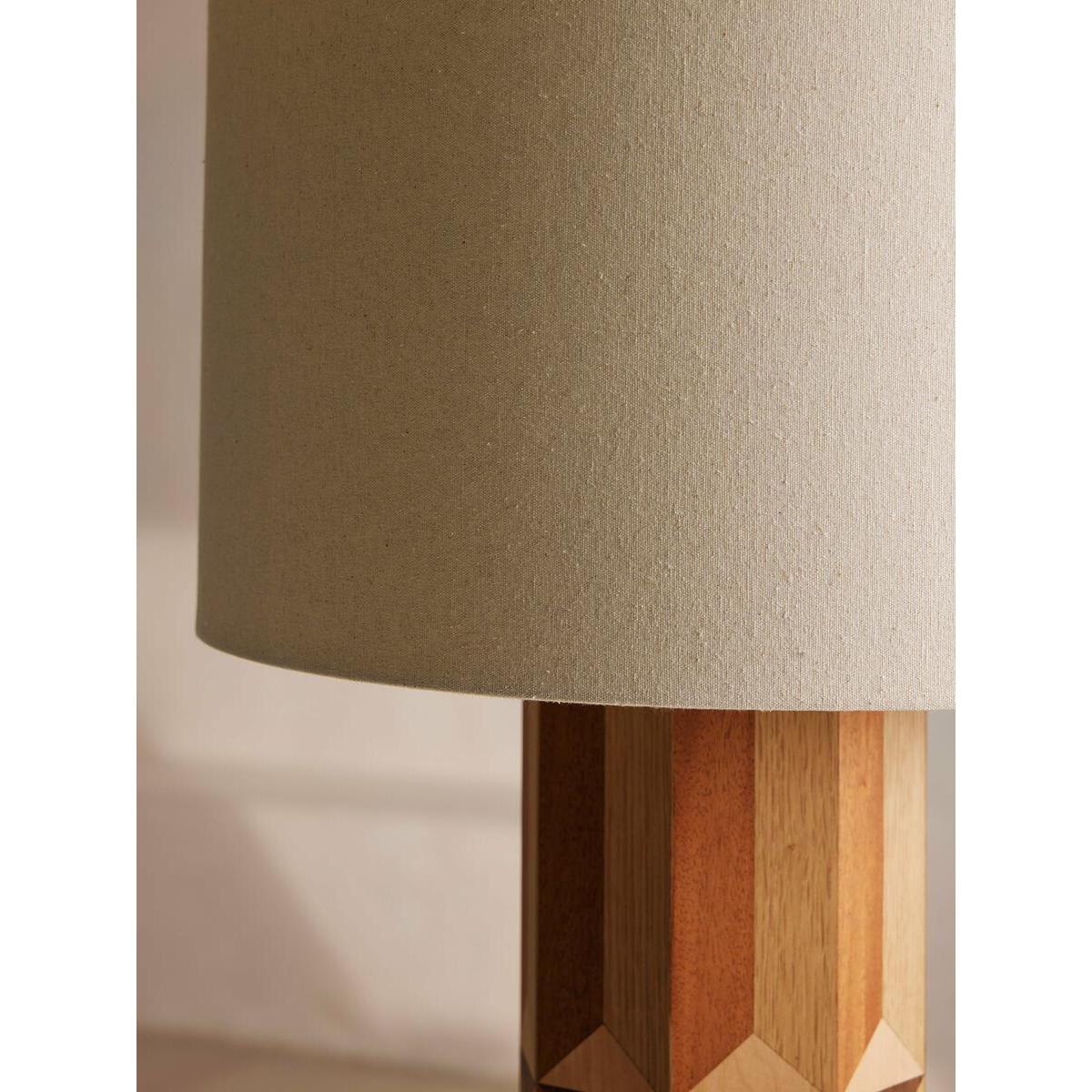 Showcasing our love of bold marquetry finishes, the Arwen table lamp adds character and dimension to a side table or desk. A handmade base of cherry wood and oak veneer panels have been arranged to form a two-tone geometric design with a three-dimensional look. Complemented with a neutral linen drum shade, this unique piece takes inspiration from White City House. Wooden table lamp Handcrafted marquetry design Cherry wood and oak veneer 3D geometric design Hexagonal base Natural linen drum shade Inspired by White City House