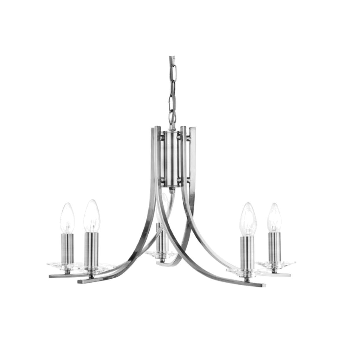 The Ascona Ceiling Light from Searchlight is sleek and contemporary, with a smooth satin silver finish. Just add standard candle bulbs for this light fitting and go!  This modern ceiling light with its sleek, unfussy chandalier style will make a fantastic addition to contemporary living rooms, dining rooms or bedrooms, especially when paired with the matching wall light from the same collection. Dimensions - 62cm W x 62cm D x 36cm-90cm H Requires 5 standard candle bulbs (not included) Maximum Wattage - 60w