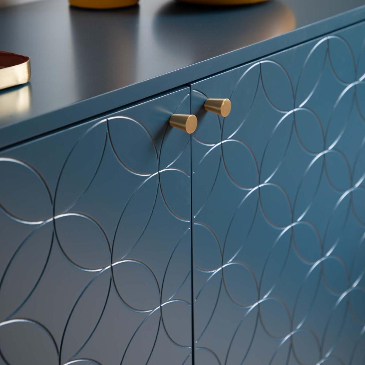 Add an eye-catching feature piece to any room with this striking blue two door cabinet. With a routed geometric circular pattern on the doors, this unit demonstrates a hint of Bauhaus influence. Brass handles are complemented by brass 'socks' on the painted solid oak legs, which showcases the combination of colour and shape for maximum impact. The cabinet is also available in three other colours to fit any space.