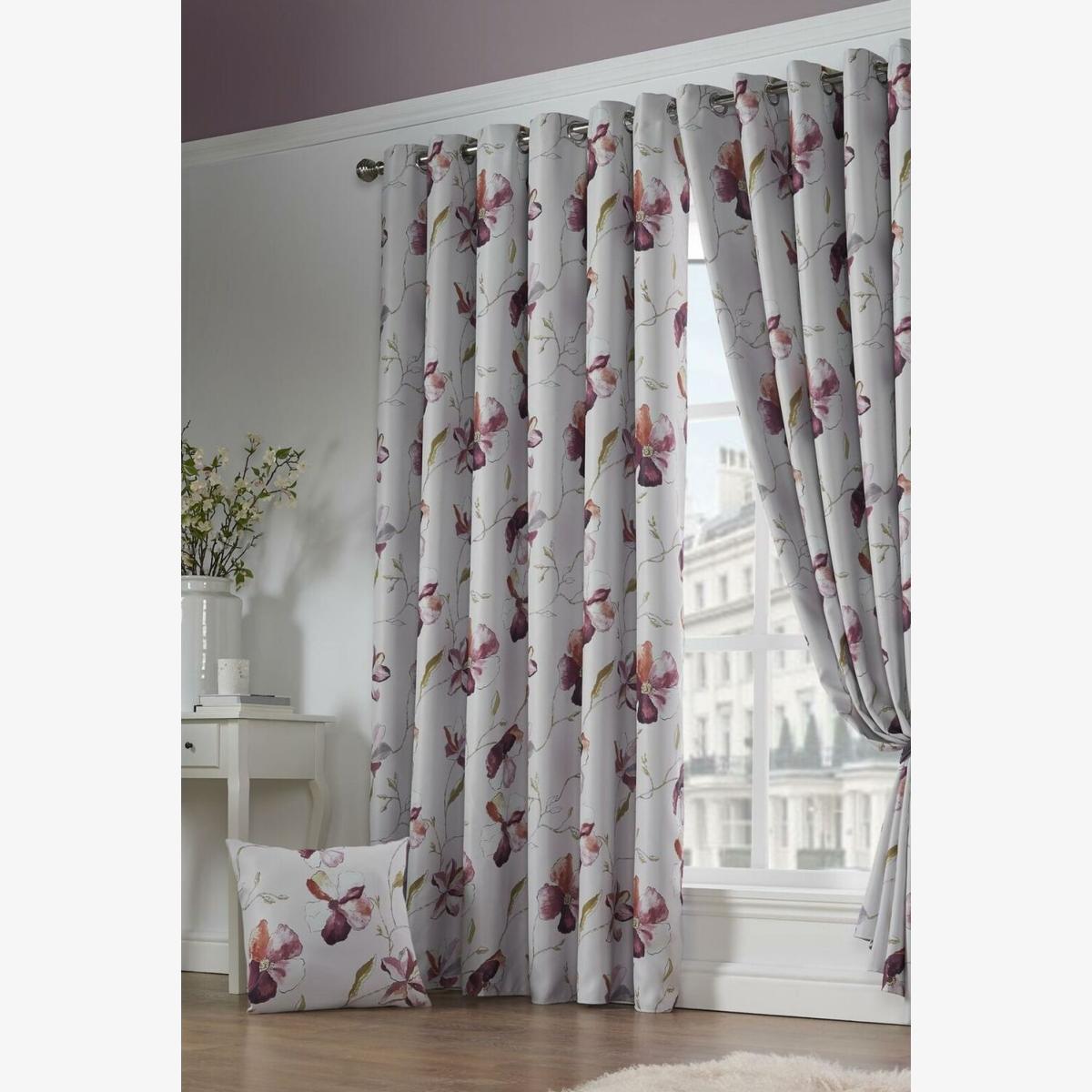 Ascot are printed blockout light, thermally efficient curtains, finished with an eyelet ring top header. This elegant drape features a stunning assortment of warm-coloured flowers over an off-whitebeige backdrop. Complete your bedroom look with these beautiful on-trend curtains, perfect for a spring look, and use them to blockout any light as well as reduce noise.