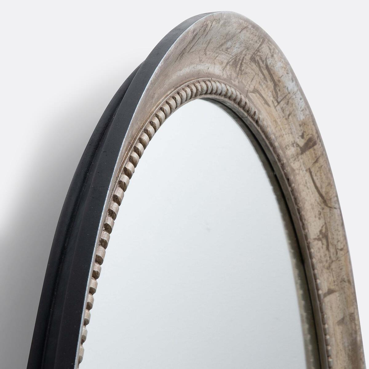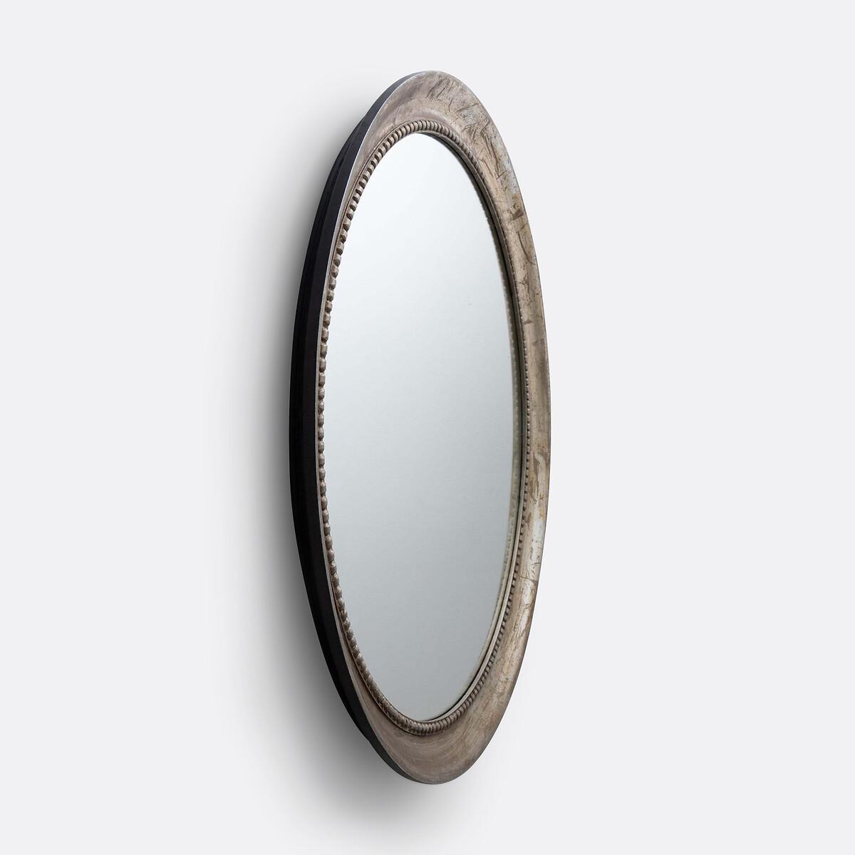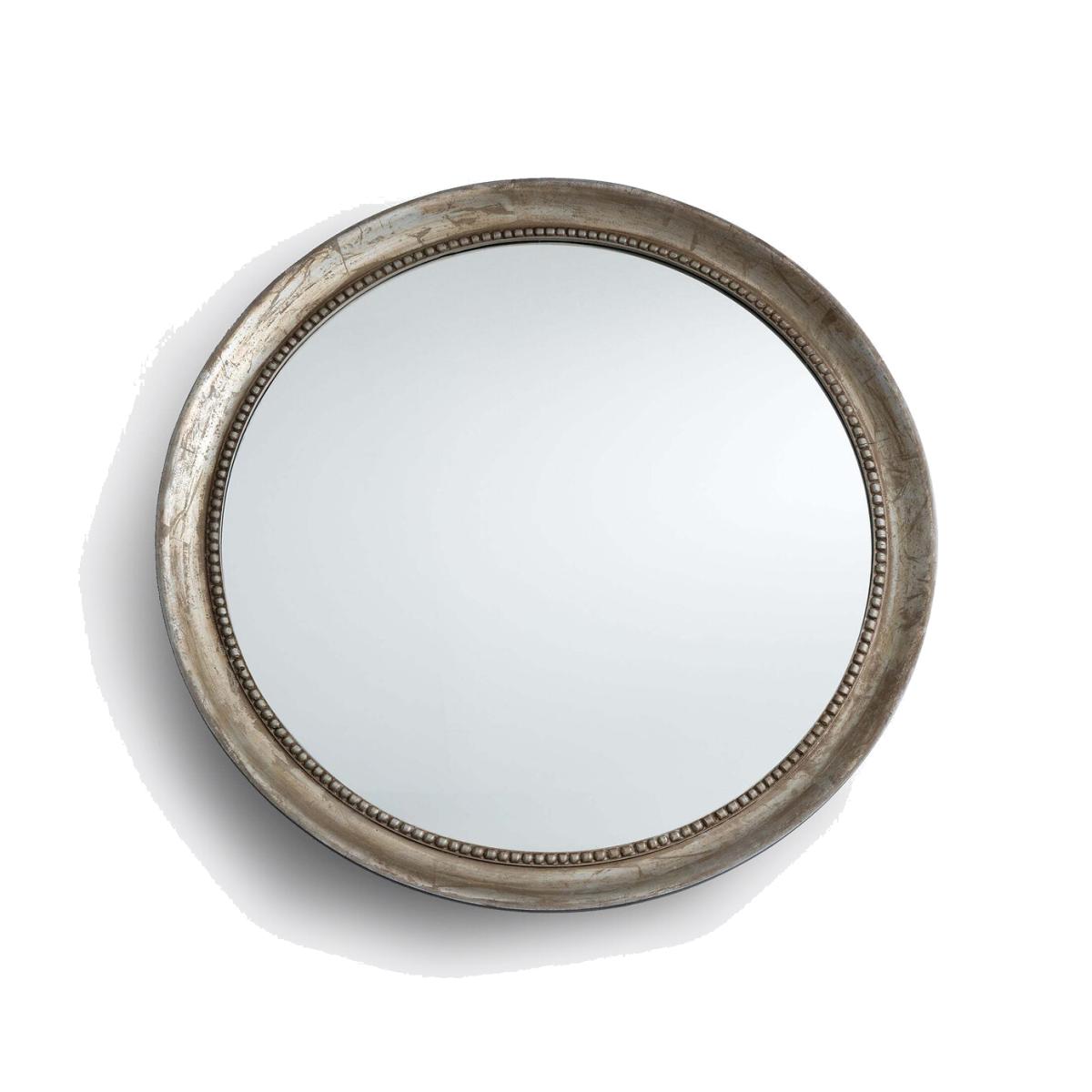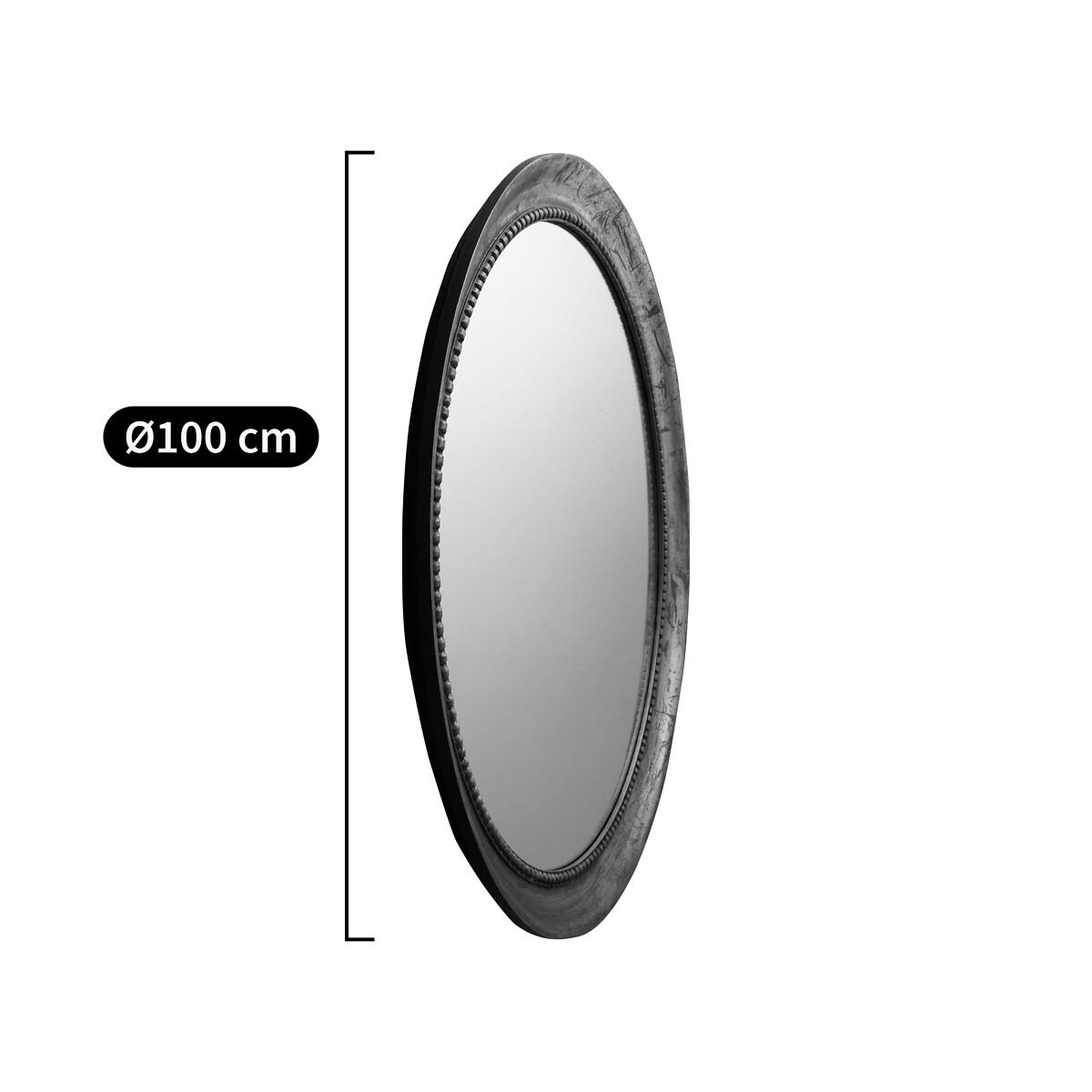 Afsan round mirror. Full of vintage charm, this antique style mirror has a pearlised finish that recalls aged metal pieces, and a delicate beaded trim. Product Details • Solid mango wood painted for the aged golden color • Black painted MDF • Beaded trim • 1 hook for wall mounting (screws and plugs not supplied)Dimensions • Diameter: 100cm • Thickness: 5cm/2"Parcel Dimensions1 parcel • 112 x 112 x 12cm • 1.7kg