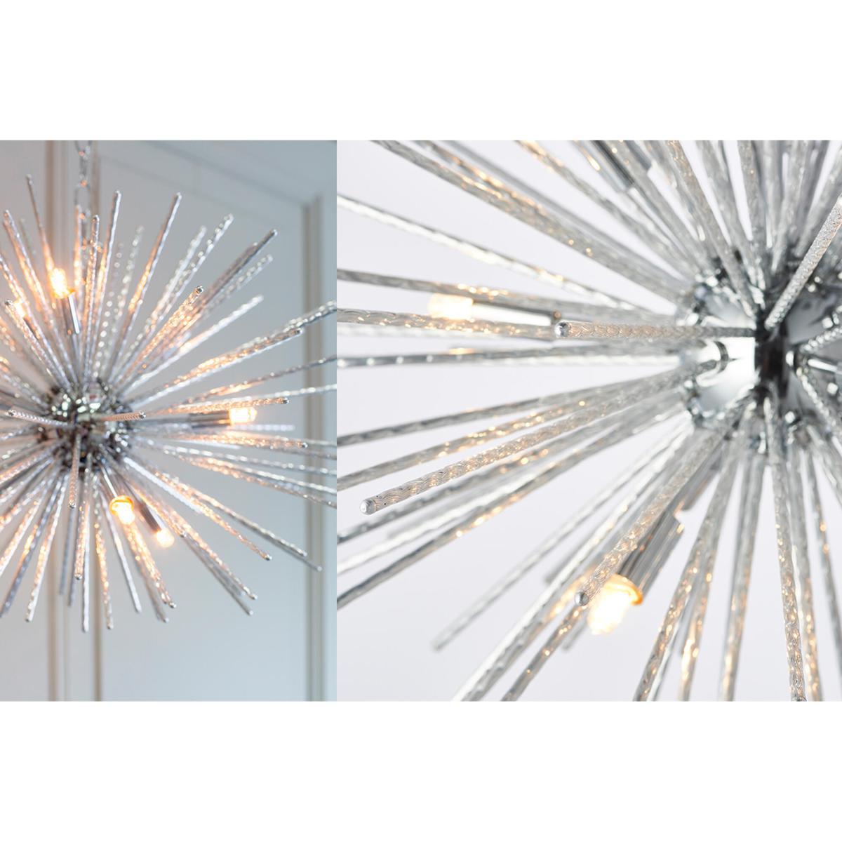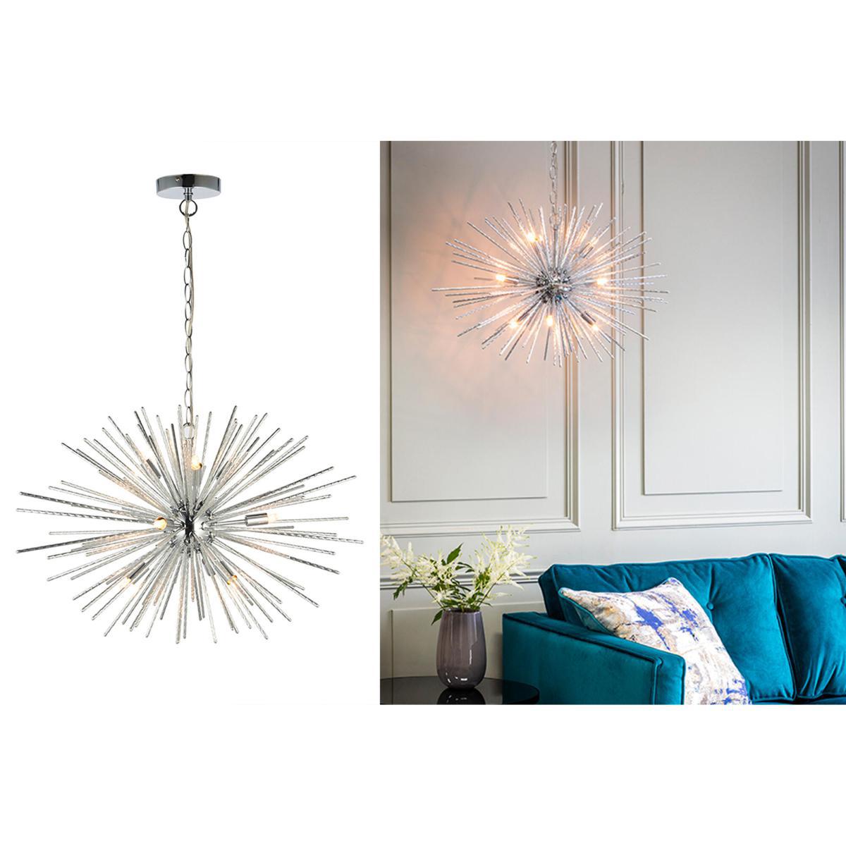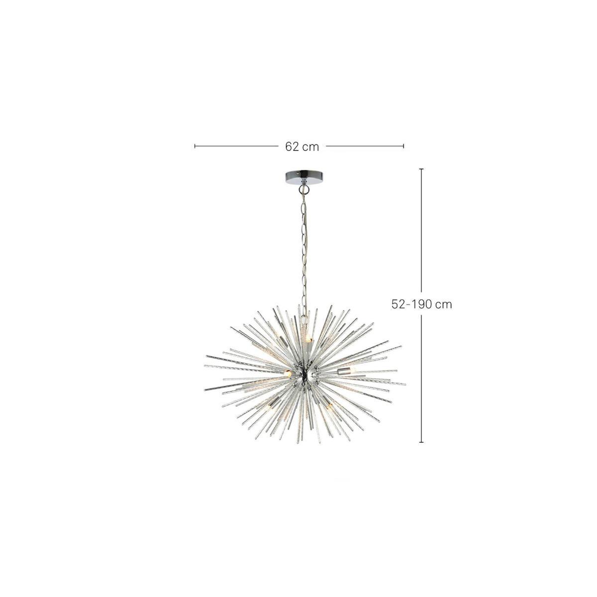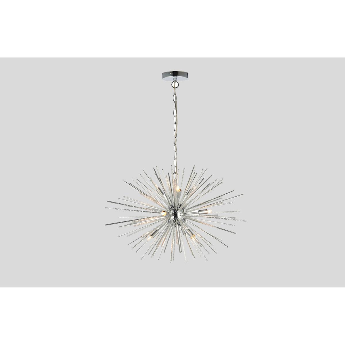 An explosive statement of design. The Asgard Pendant Light is a modern version of a timeless classic from the past, finished in polished chrome featuring an 'explosion' of textured rods that create dramatic light patterns. Suspended from a height adjustable chain with clear flex and dimmable capabilities.