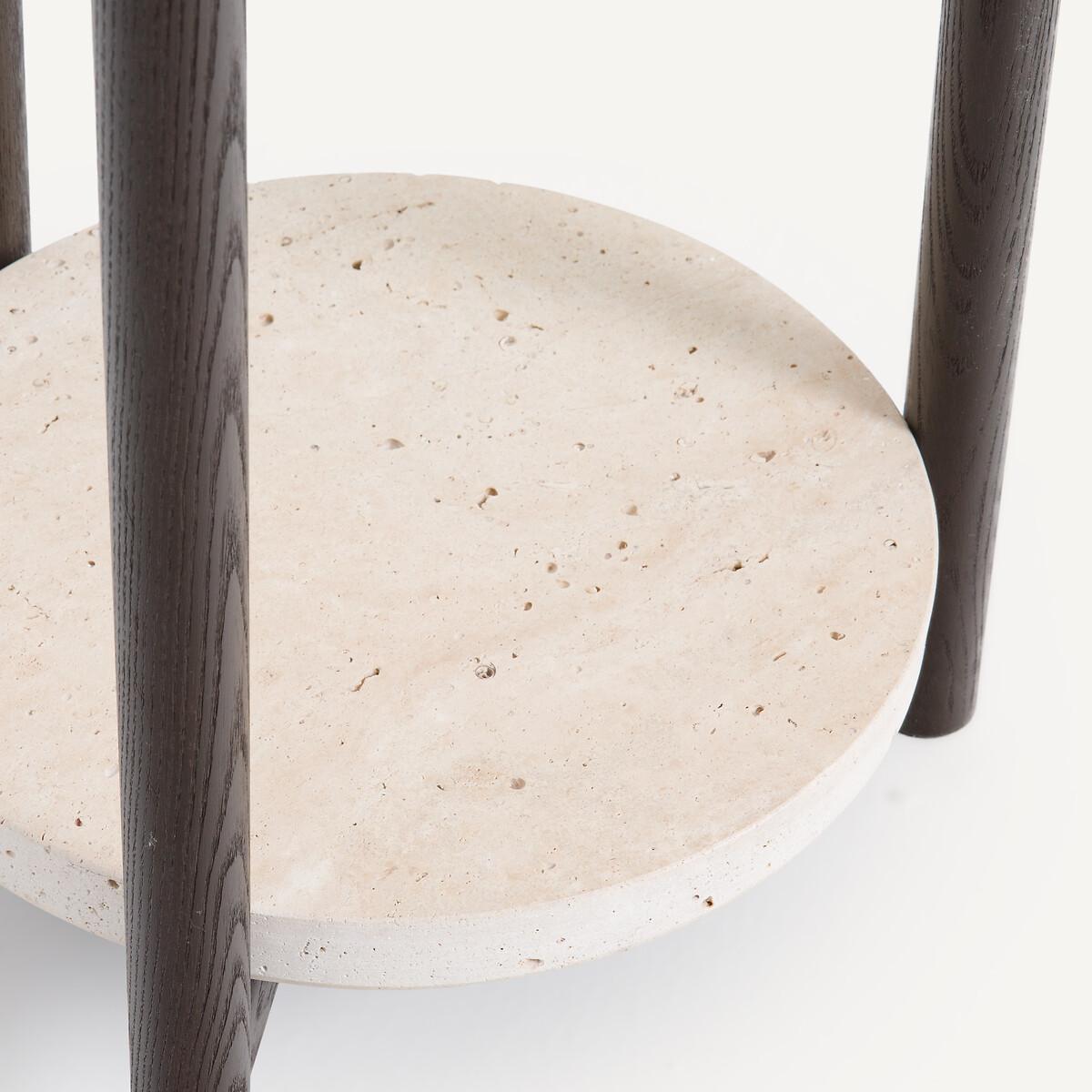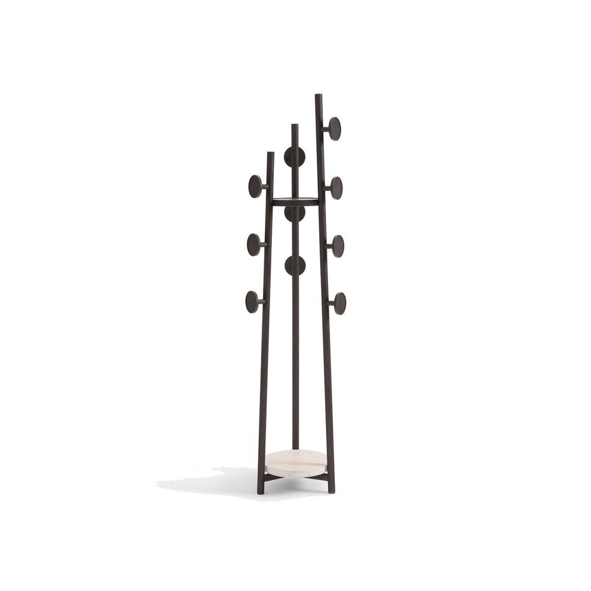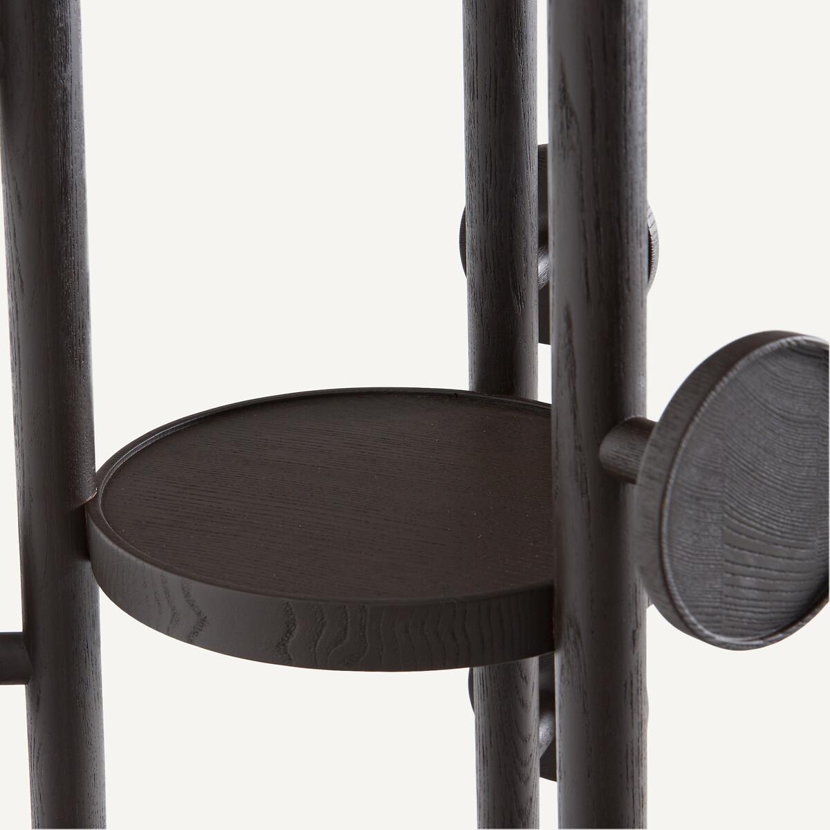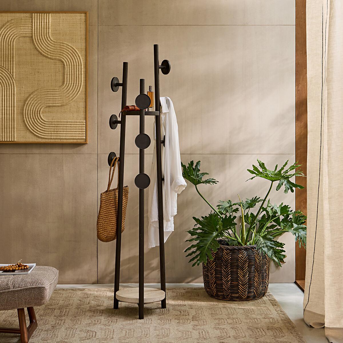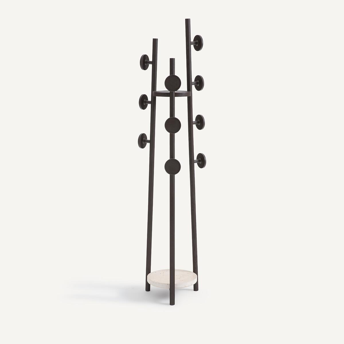 Inspired by modern art, the Madilgo coat rack is a sculptural object in itself, in solid ash stained with roasted coffee and travertine. In addition to its coat hooks, Madilgo has two free shelves. A decorative and functional piece with the AMPM signature. Product Details • 3 poles and 10 pegs • Frame, branches and Coat Hooks, in coffee-grilled stained solid ash • Top Tray in solid ash stained toasted coffee • FSC® certified wood • Nitrocellulose finish • Lower level in travertine, each piece is unique. Quality Info • Wood is a living material. The differences in shades, grains and knots reinforce its character and authenticity.. Over time it may crack slightly. It is a process caused by variations in temperature and humidity. Care Advice • Travertine is a porous and heat sensitive material. Care information: Immediately wipe up any spilled liquid with a white cloth dipped in lukewarm water and wrung out. Dimensions • Diameter: 42cm • Height: 176cm • Sold pre-assembled. • WOOD FROM SUSTAINABLY MANAGED FORESTS. FSC® certified wood comes from forests that are environmentally, socially and economically well managed. Dimensions and weight of parcel1 parcel • W54 x H185 x D49 cm, 22.4 kg