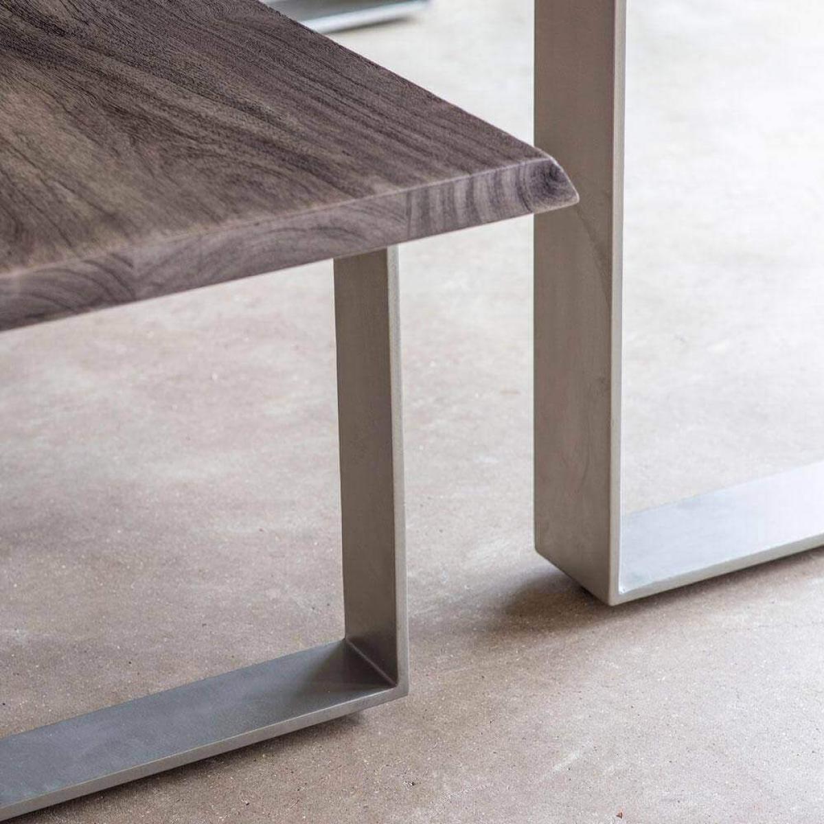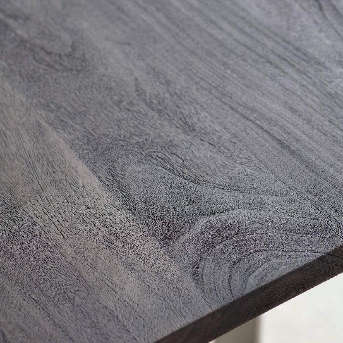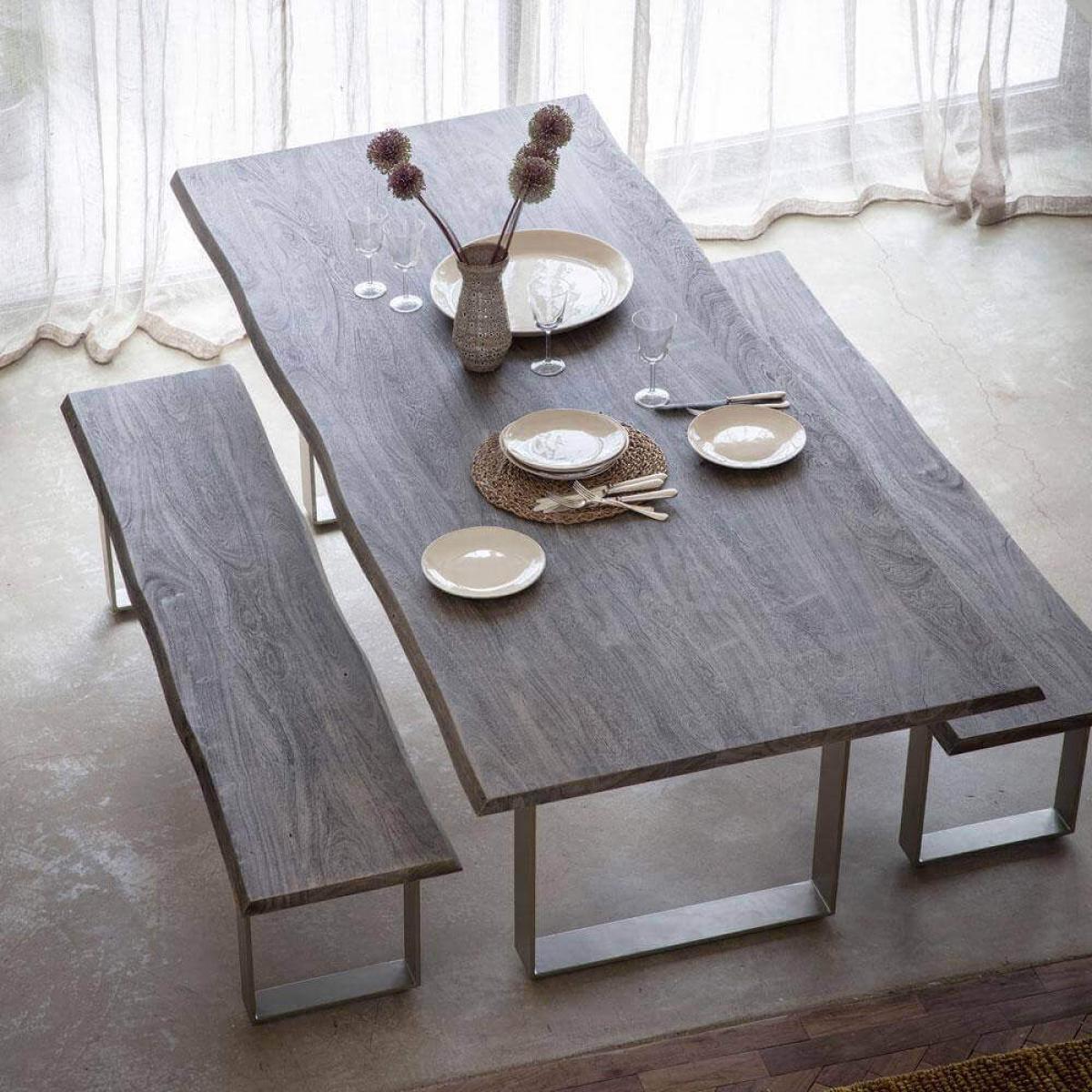 The Ash Grain Dining Table 2 metre will swiftly become the centrepiece of a dining room or kitchen. Unique style is blended with hand crafted Acacia wood to form this extremely sleek looking table. The strong table legs are constructed from a sturdy brushed metal, but remain slender in keeping with its interior design style. Key to this Acacia table are the appealing and artistic table edges, carved in a curved wane style, expect compliments from guests. The ash-grey wash given to the wood handsomely allows the wood grain to be brought to the fore. This washed patina creates a timeless piece of dining furniture suitable for many décor plans. It is best paired with the Ash Grain Bench.