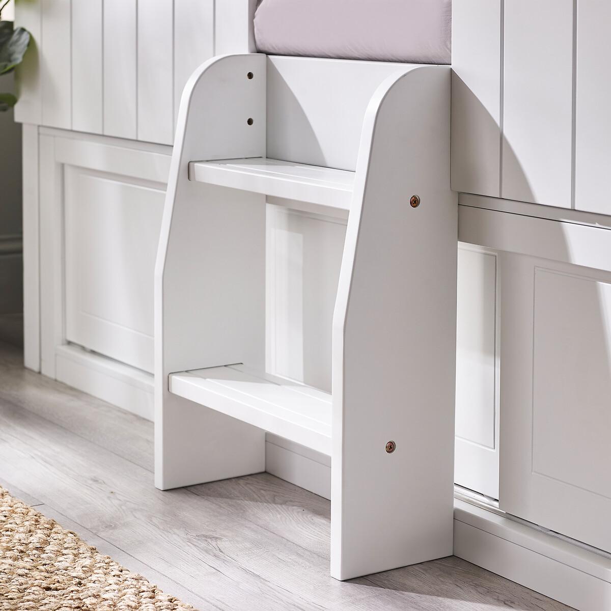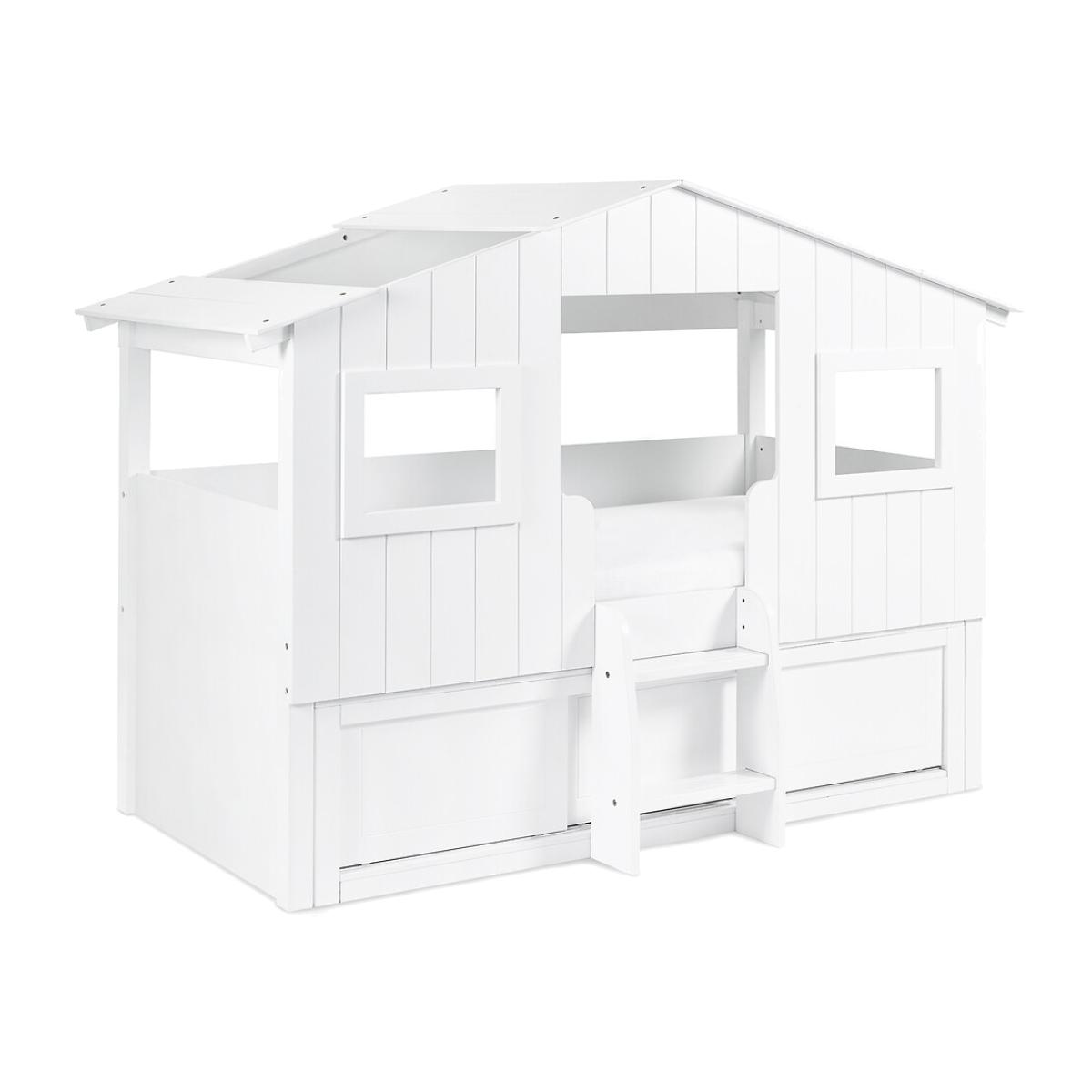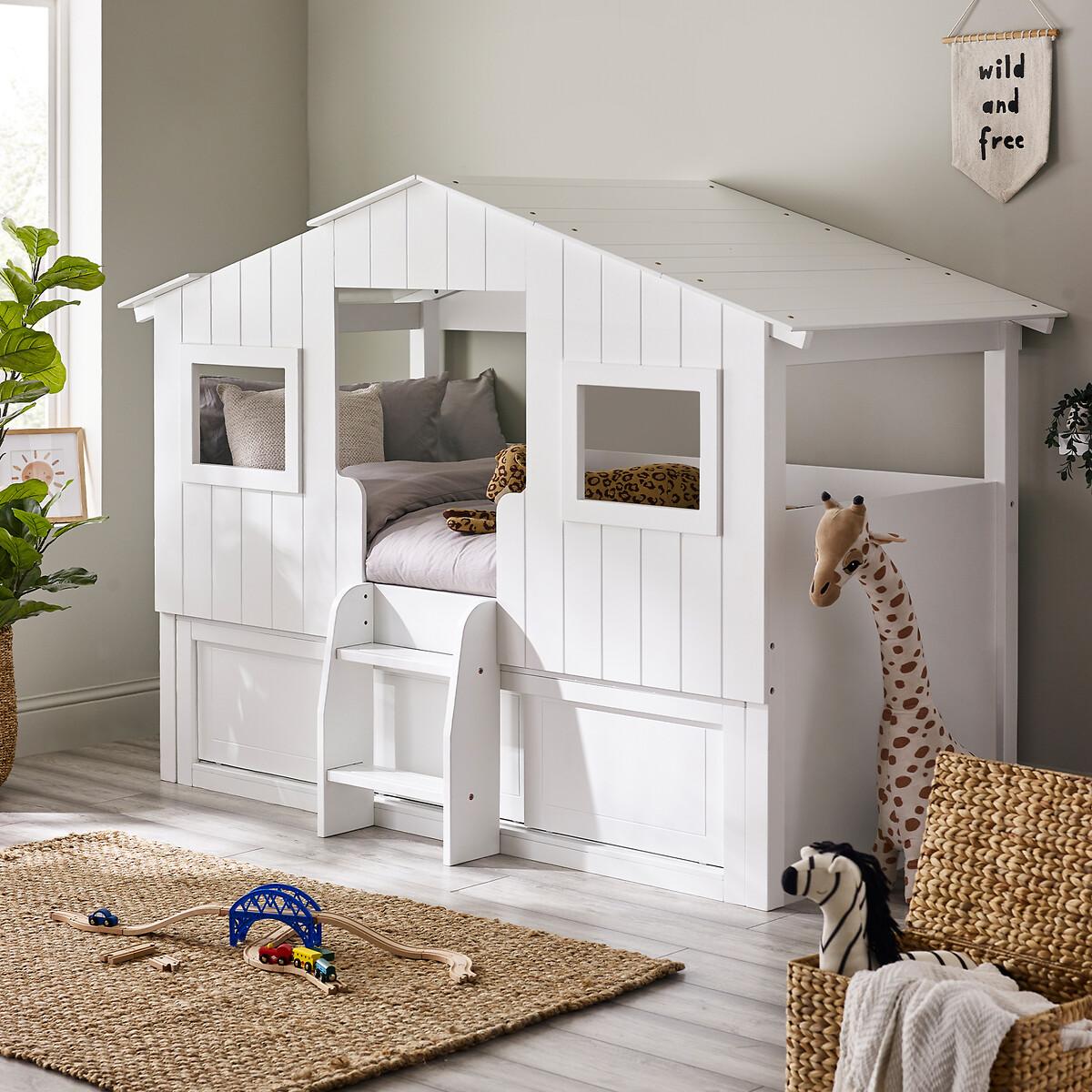 Transform your child's bedroom into a whimsical woodland wonderland with the Asha Treehouse Midsleeper Bed. This enchanting treehouse-style bed features a charming white panelled front and rooftop canopy with two square windows, sure to inspire imaginative adventures. Your little explorer can easily climb into bed using the sturdy step ladder. Below, a slide-door storage unit offers the perfect hideaway for stowing books and toys, ensuring a tidy and organised space. Product Details • Shiplap style frontage • Cutout door and windows • Underbed storage compartments with sliding doors • Two step sturdy ladder • Lacquered MDF frame • Solid wood slats • Sprung slatted base • Full assembly required • Fixings supplied • 12 Months manufacturers warranty • Care advice: Wipe clean with a soft cloth • Minimum recommended age of sleeper 6+Product Composition - 99% Wood, 1% Metal. Product Dimensions Single - 221 cm x 122.9 cm x 158.9 cm , Weight - 151.8 KGPackaged Dimensions. Single: Parcel 1 Packaged Dimensions - 209 cm x 48 cm x 11 cm, Weight 40.8 kg Parcel 2 Packaged Dimensions - 111 cm x 85 cm x 13 cm, Weight 39.1 kg Parcel 3 Packaged Dimensions - 133 cm x 46 cm x 16 cm,Weight 39.1 kg Parcel 4 Packaged Dimensions - 196 cm x 47 cm x 12 cmcm, Weight 36.8 kg. This product will be dispatched by one of our trusted suppliers. You’ll be contacted by their selected courier about your delivery. Please note: this product cannot be delivered to all Offshore Islands, Northern Ireland or Republic of Ireland.