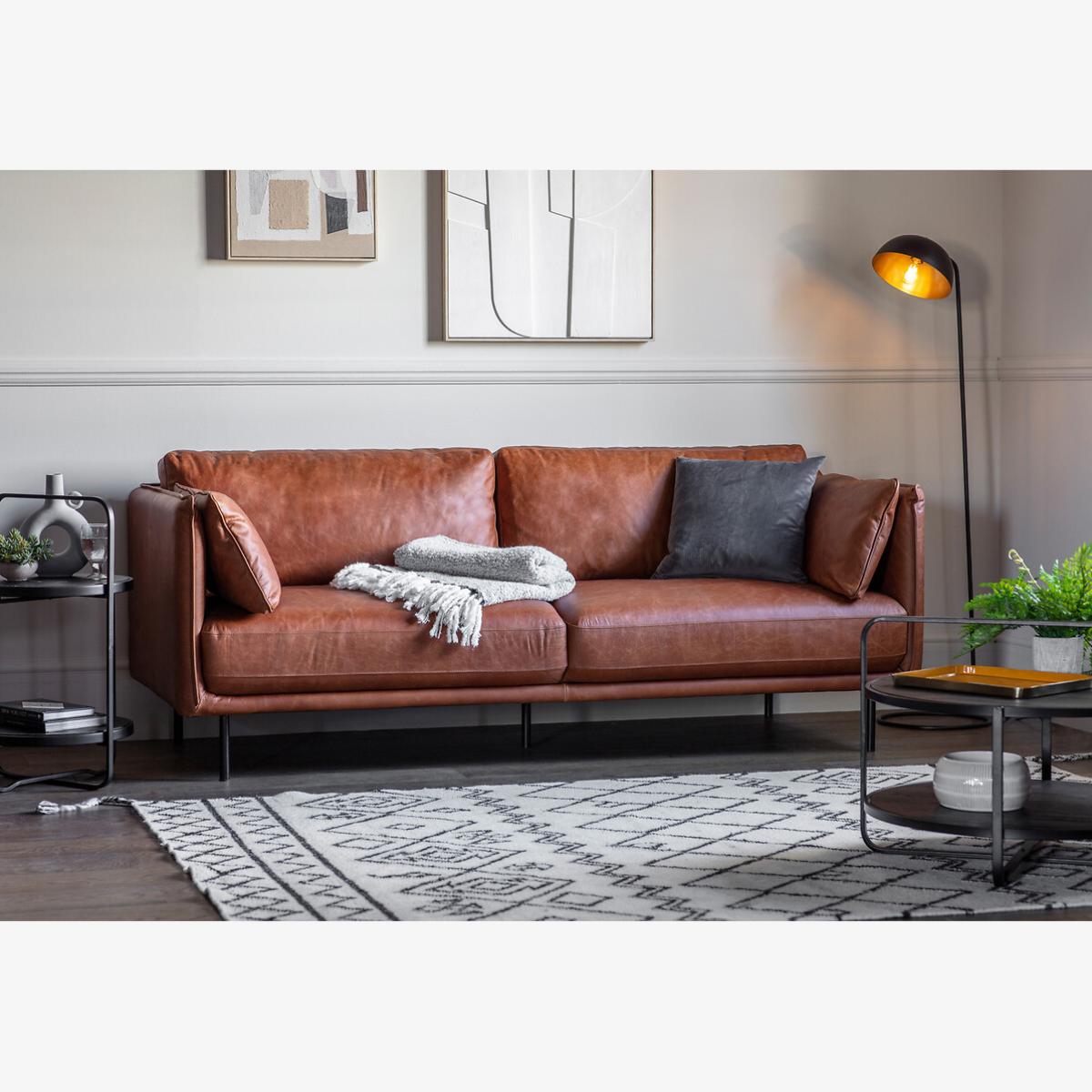 Sleek and contemporary, this stylish sofa is fully upholstered in a lovely warm brown leather, with black metal legs perfectly complementing the design - perfect for industrial inspired living rooms. The slim arms feature stitch seam detailing which is echoed on the side cushions. Product details • Upholstered in smooth comfortable leather with a distressed, aged effect, and finished with beautiful stitch detail • Envelope-style finished arms with decorative piping create a clean, streamlined look • A foam and pocket spring base creates a supportive sit which maintains its shape without needing to plump • Fibre and foam fillings ensure maximum comfort and support • Streamlined metal legs • Two leather bolster cushions included (fibre filled) • Removable back and seat cushions • Partial assembly required - legs/feet only. Composition: Leather. Product Dimensions: 72.5 cmx200.5 cmx90 cm. Seat height: 44 cm. Seat width between the arms: 152 cm. Seat depth 57 cm. Back height: 28.5 cm. Please remember to measure your available space before ordering. Packaged Dimensions: 203 cm x 92 cm x 58 cm, Weight: 60.9 kg. Please remember to measure your available space before ordering. This product will be dispatched by one of our trusted suppliers. You’ll be contacted by their selected courier about your delivery. Please note: this product cannot be delivered to all Offshore Islands, Northern Ireland or Republic of Ireland. GALLE01