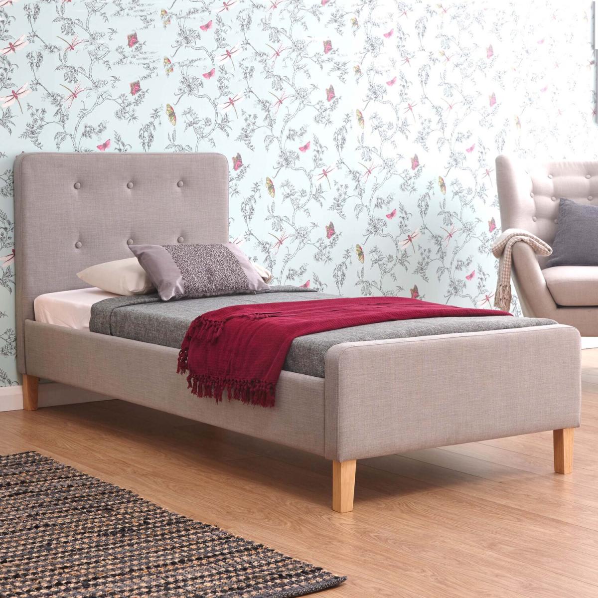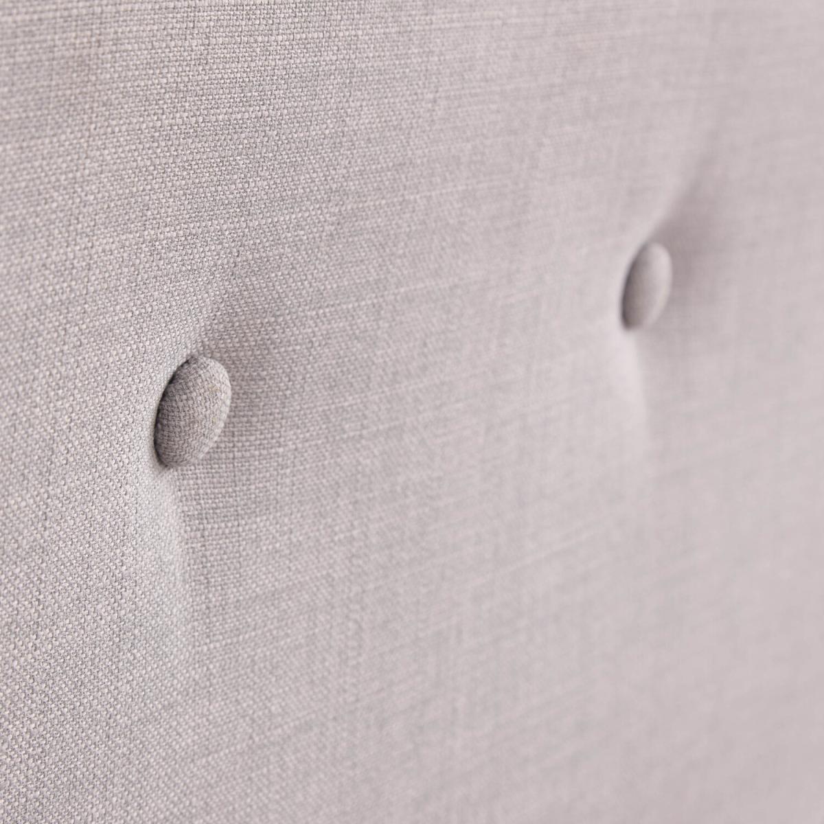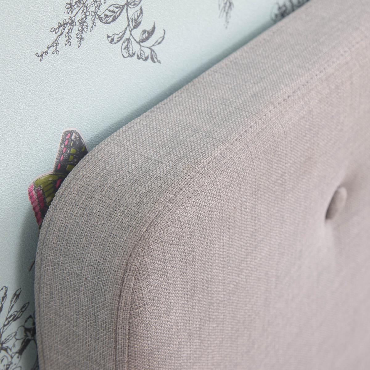 The perfect choice for a contemporary home, this retro-inspired bedframe personifies effortless chic. The simple padded frame is supported on pale wooden legs and covered with a smart grey hopsack. A neat, buttoned headboard showcases restrained modern style. A great match for a no-fuss, minimalist setting and can be accessorized with colourful fabrics and linen to suit.