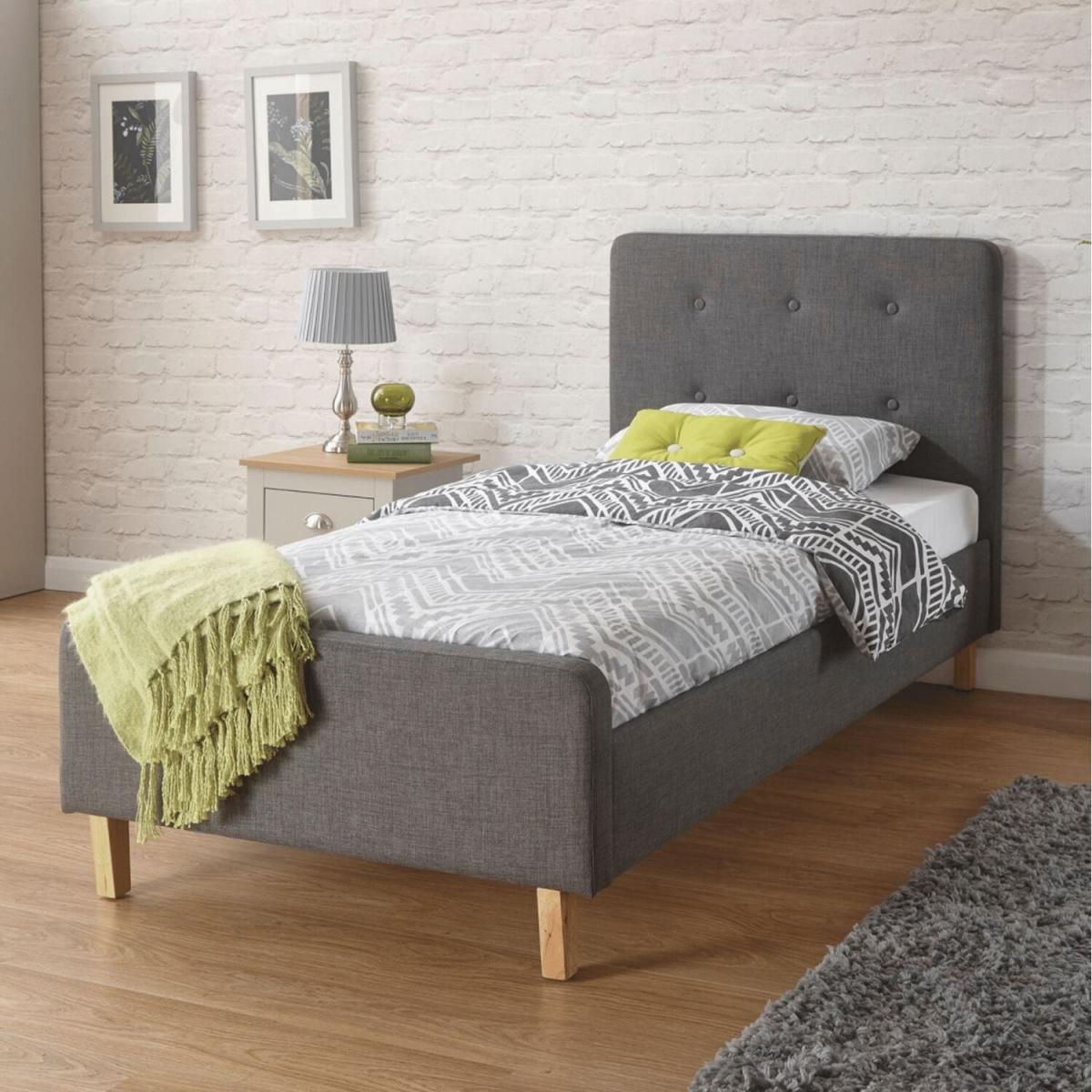Ideal for a contemporary home, this retro-inspired bedframe embodies effortless chic. Its simple padded structure stands on pale wooden legs and is adorned with a sophisticated Grey hopsack fabric. The tidy, buttoned and padded headboard exemplifies modern elegance. It's well-suited for a minimalist setting and can be complemented with vibrant fabrics and linens. Featuring low foot ends and slender, sturdy legs, the Ashbourne bed is constructed from premium steel and MDF. Durable by design, this bedframe's contemporary style fits seamlessly into both modern and traditional homes.