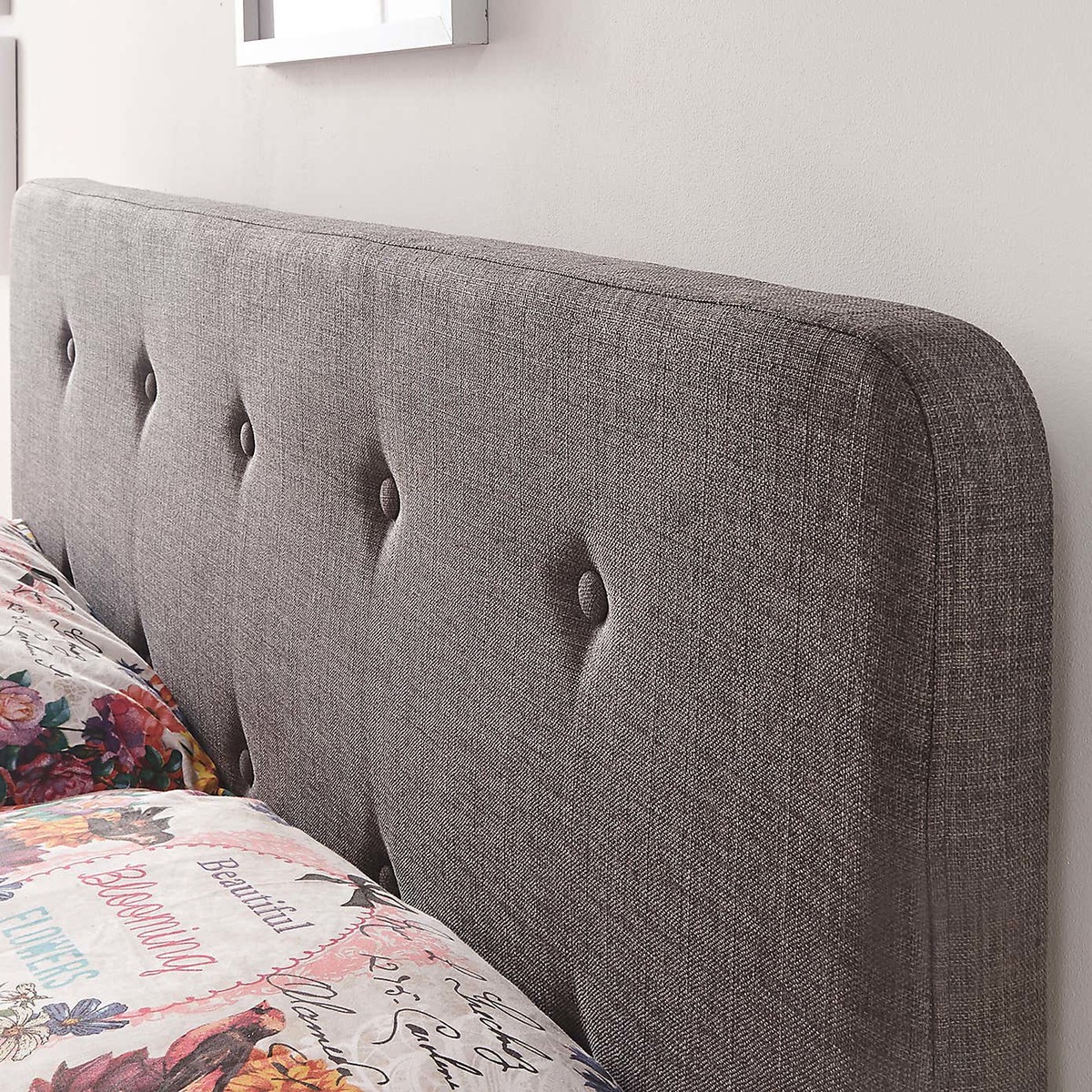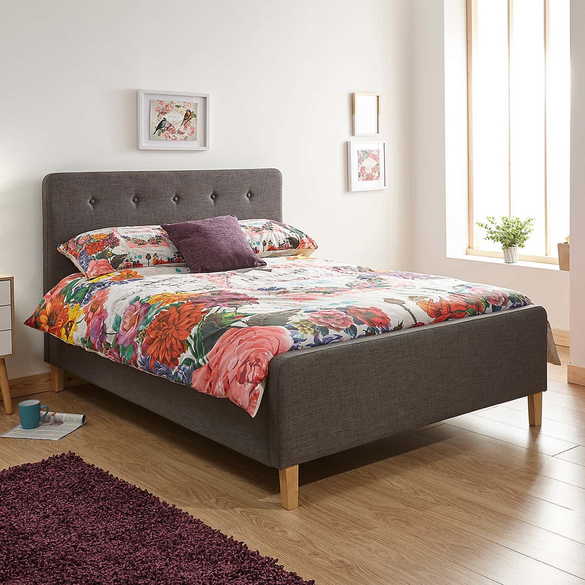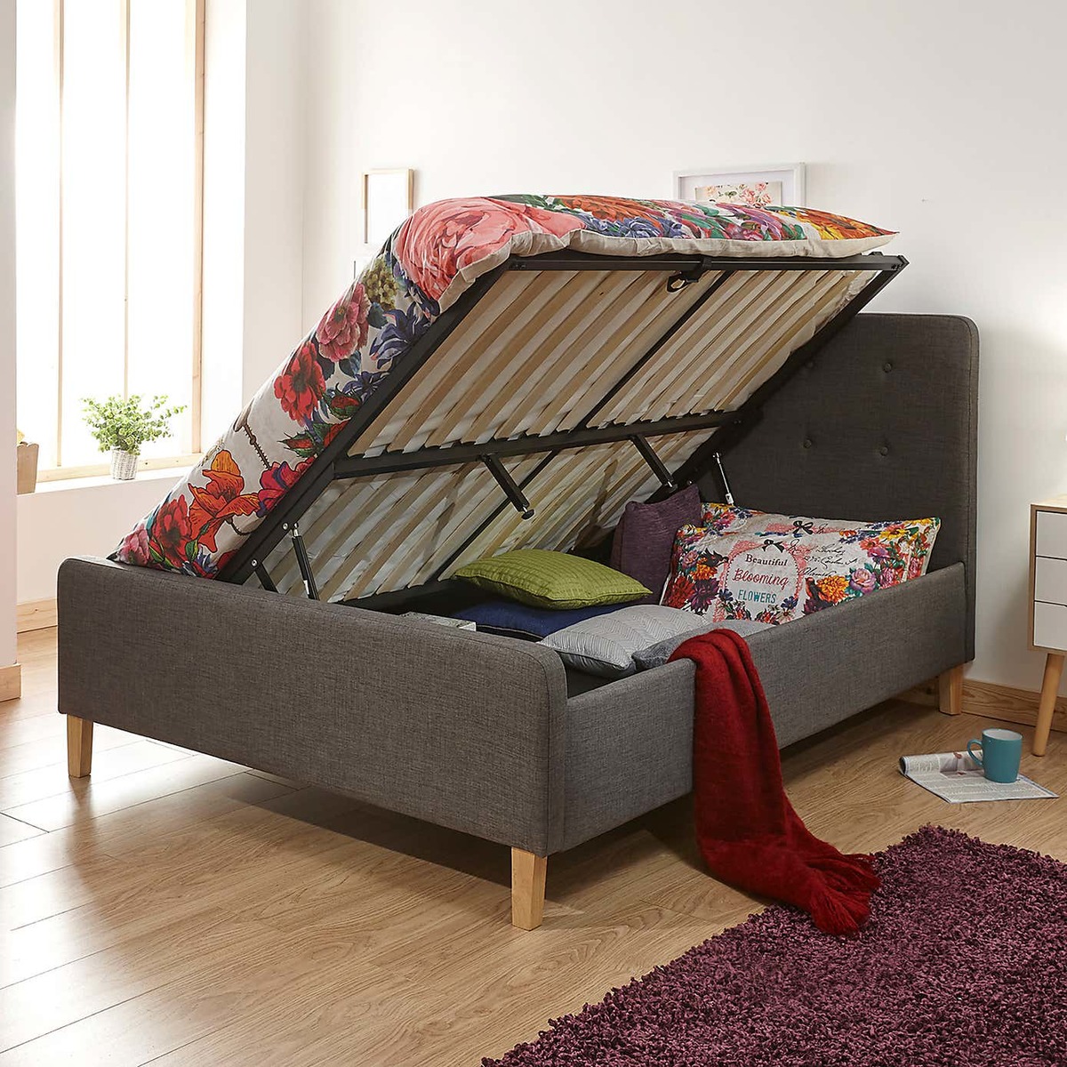 The Ashbourne Fabric Ottoman Bed is a lovely and functional addition to any contemporary bedroom. This retro-style bed frame features generous storage space beneath the sprung slatted base and the sleek, padded frame is upholstered in a smart, yet restrained hopsack fabric. Pale wooden legs provide an effective contrast to the dark grey finish and a comfortable, buttoned headboard adds a stylish boutique look. Please note: Price is for bed frame only and does not include mattress. Please note, unfortunately we cannot deliver this item to the Channel Islands.