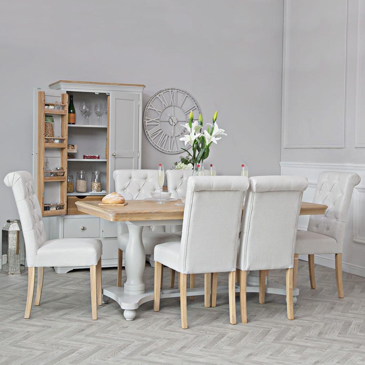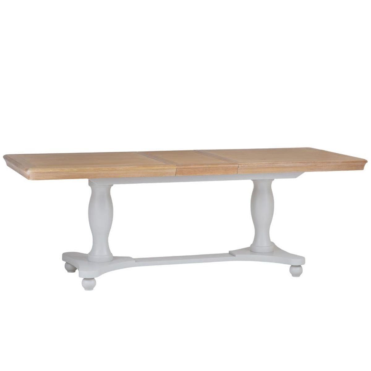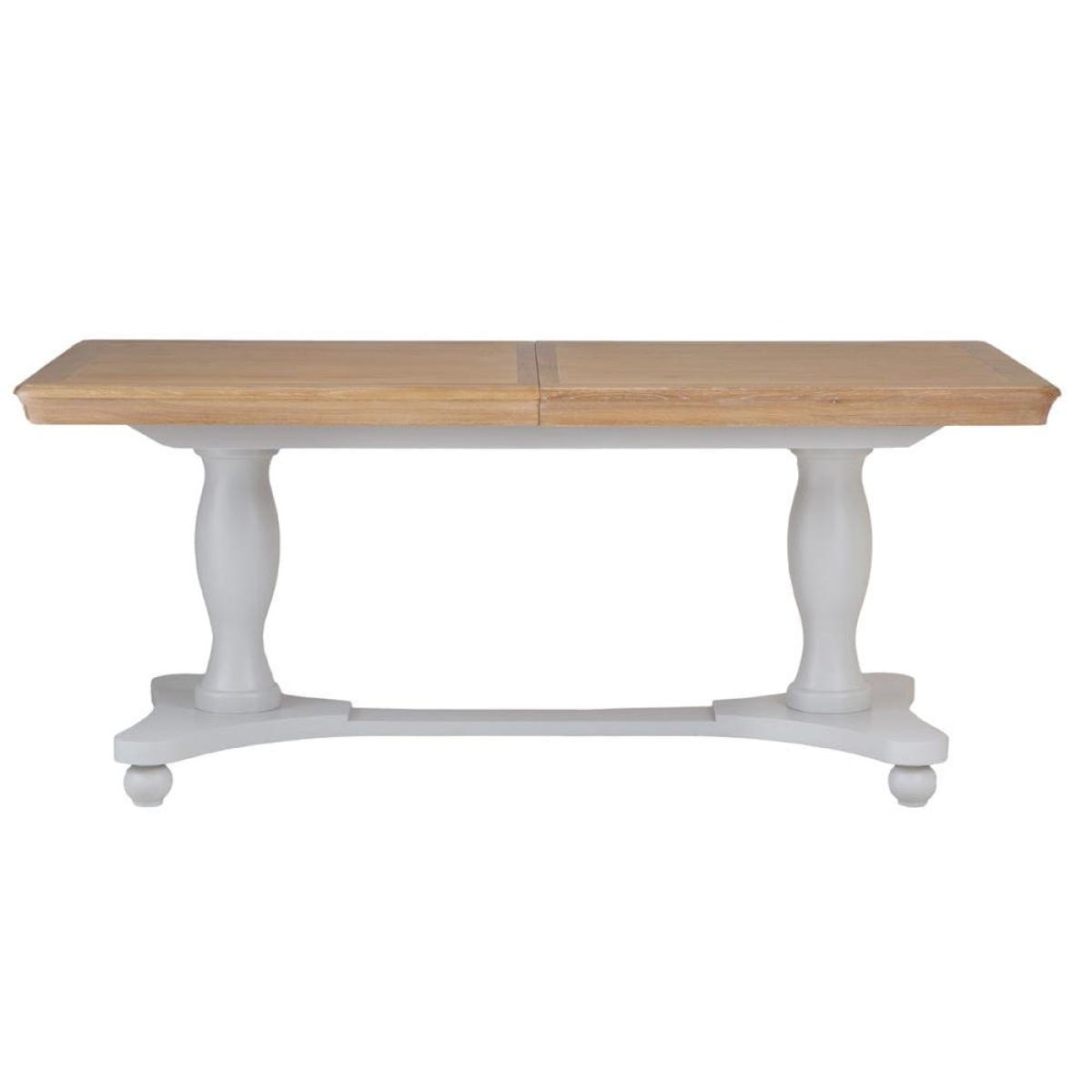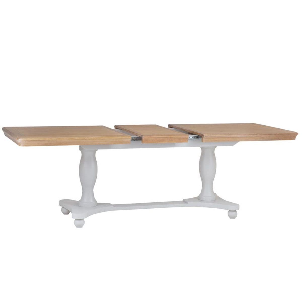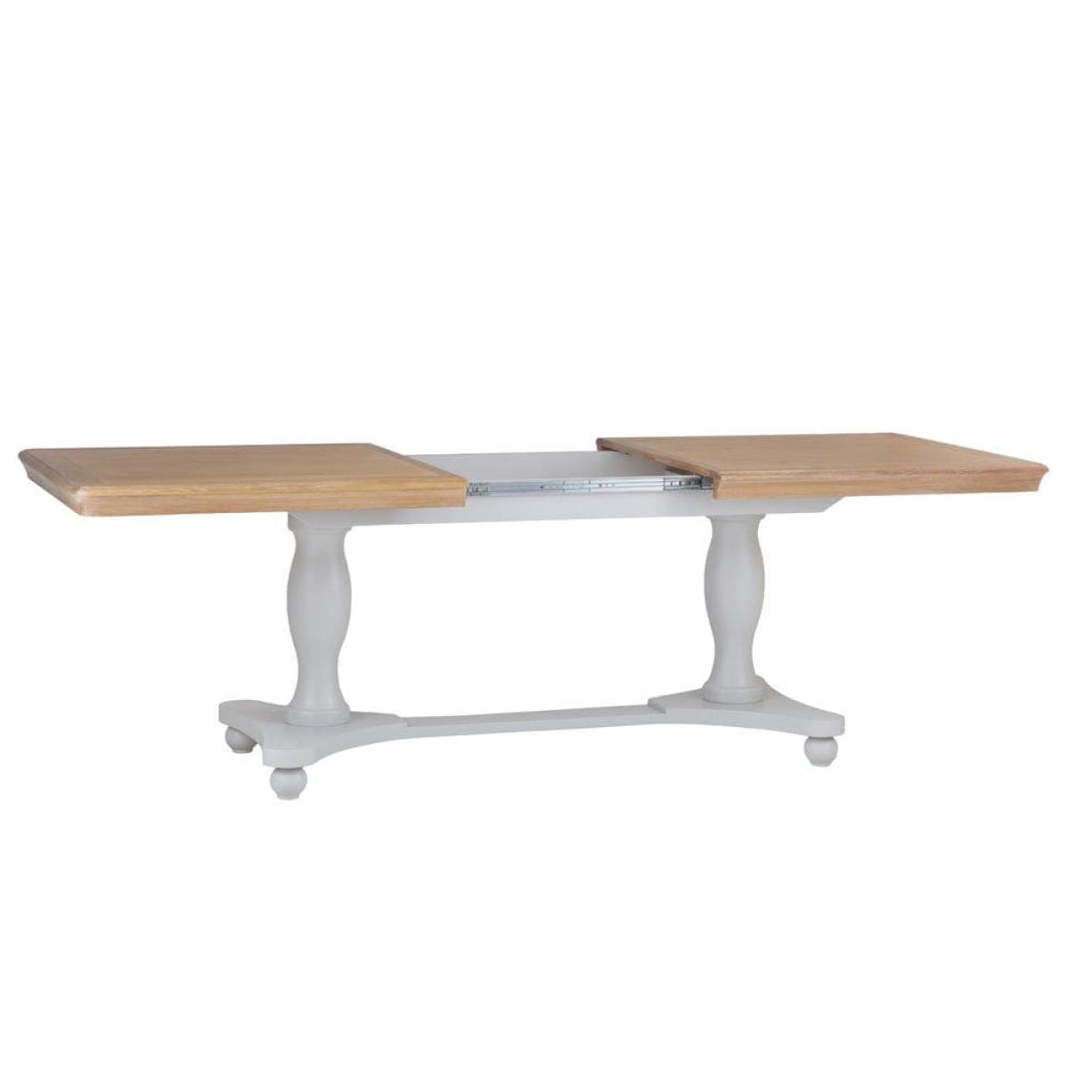 The gorgeous design of the Ashbourne grey painted 1. 8m double pedestal extending dining table means setting out a few extra places at the table is easy. There’ll be no elbow bashing at your next dinner party – guests will be spoilt for space once this extending dining table reaches its full length. The stunning table top is supported by two elegantly curving pedestals, perfect for creating a quietly grand aesthetic. Set a candle or two on top of this dining table to complete the sophisticated look. Finished in a fabulously subtle grey paint, this table will add neutral tones to any interior.