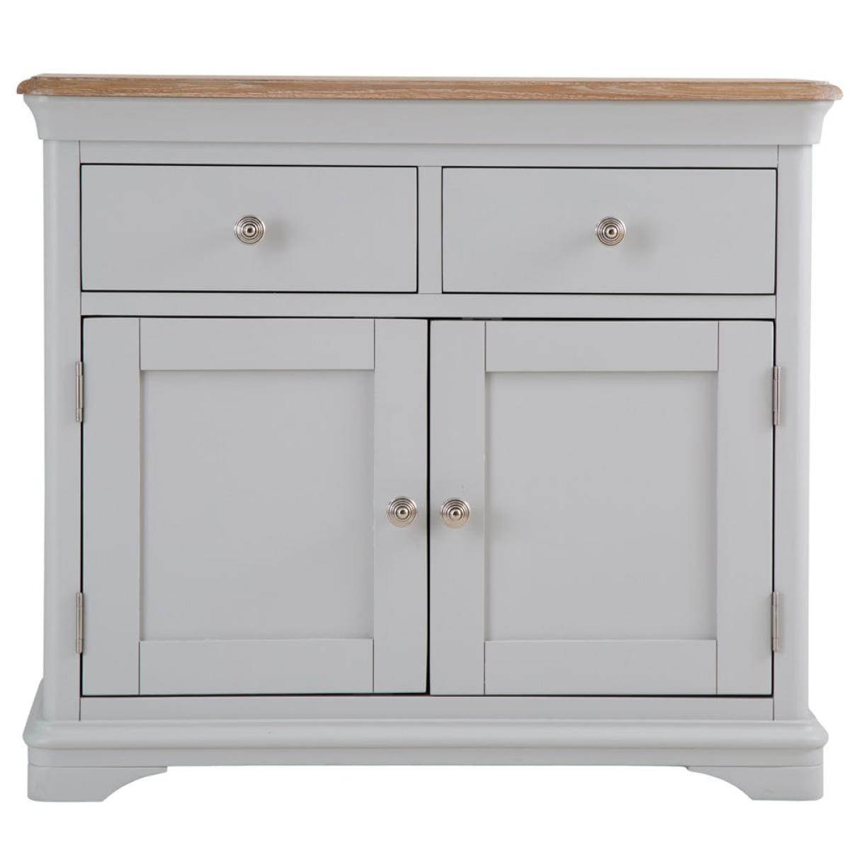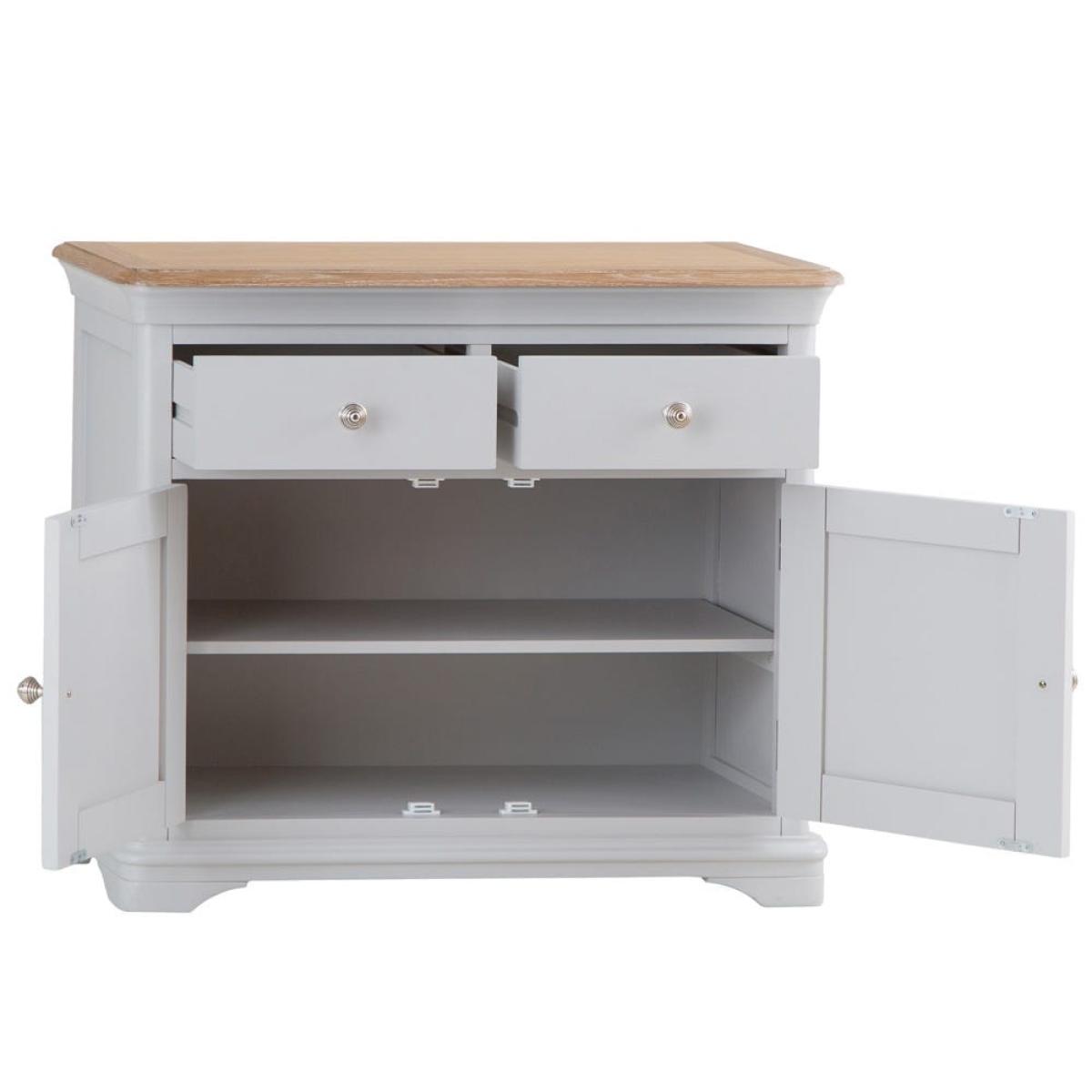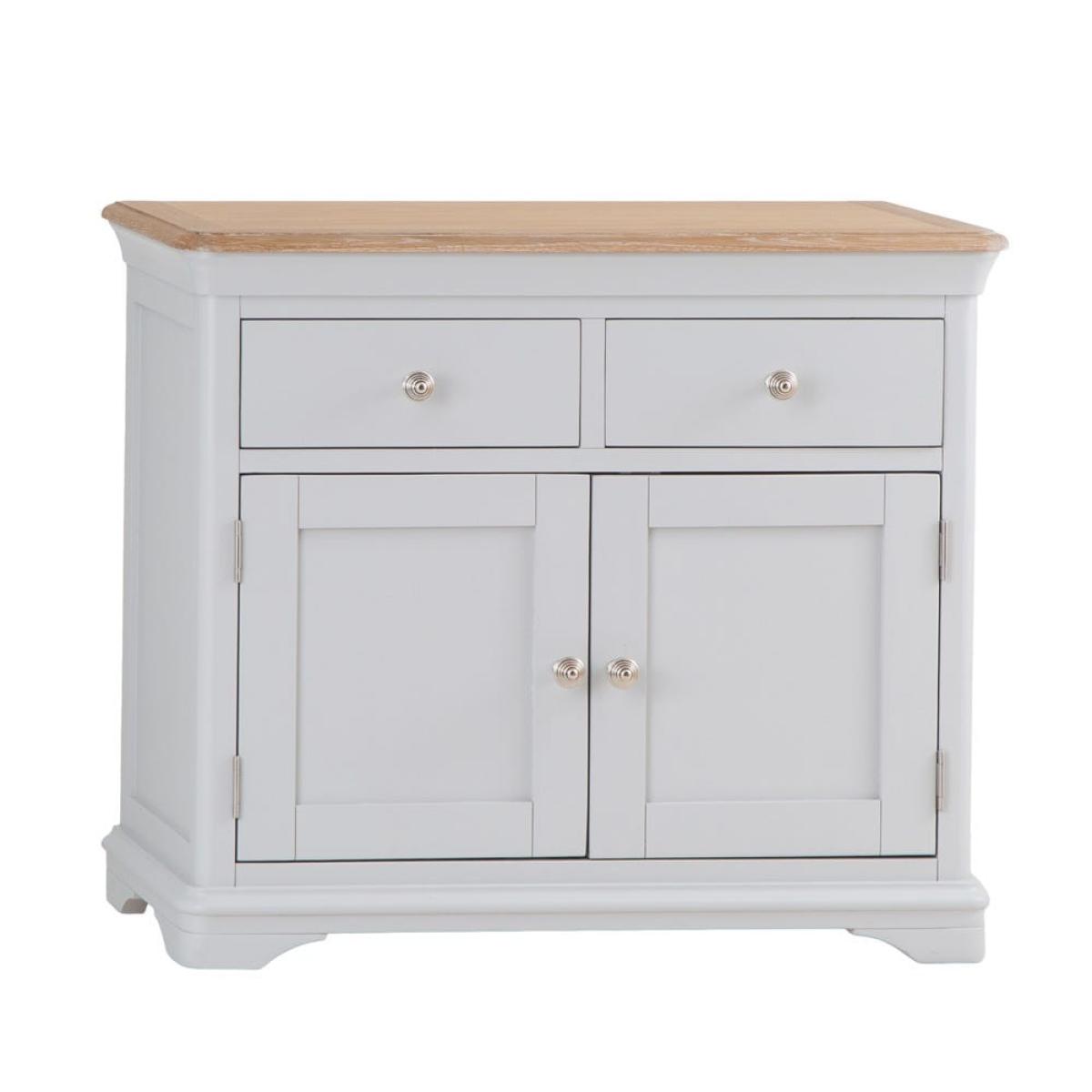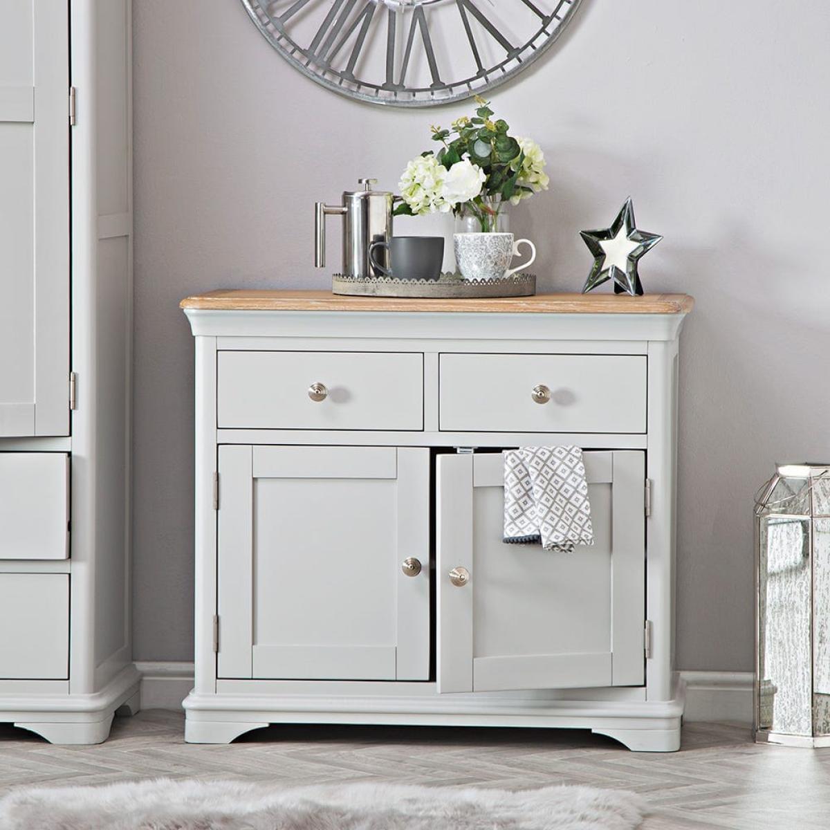 A practical storage unit and a super-handy sideboard all rolled into one, the Ashbourne grey painted 2 door small sideboard makes a welcome addition to your home furnishings. Finished in soft grey paint, this small sideboard sits quietly at the side of the room (the clue is in the name), blending effortlessly into many interior design styles. Its elegant oak top surface and sleek French-inspired bracket feet whisper of a quiet sophistication. This sideboard serenely complements both neutral tones and brighter interior design styles – it adds storage whilst making the room feel complete.
