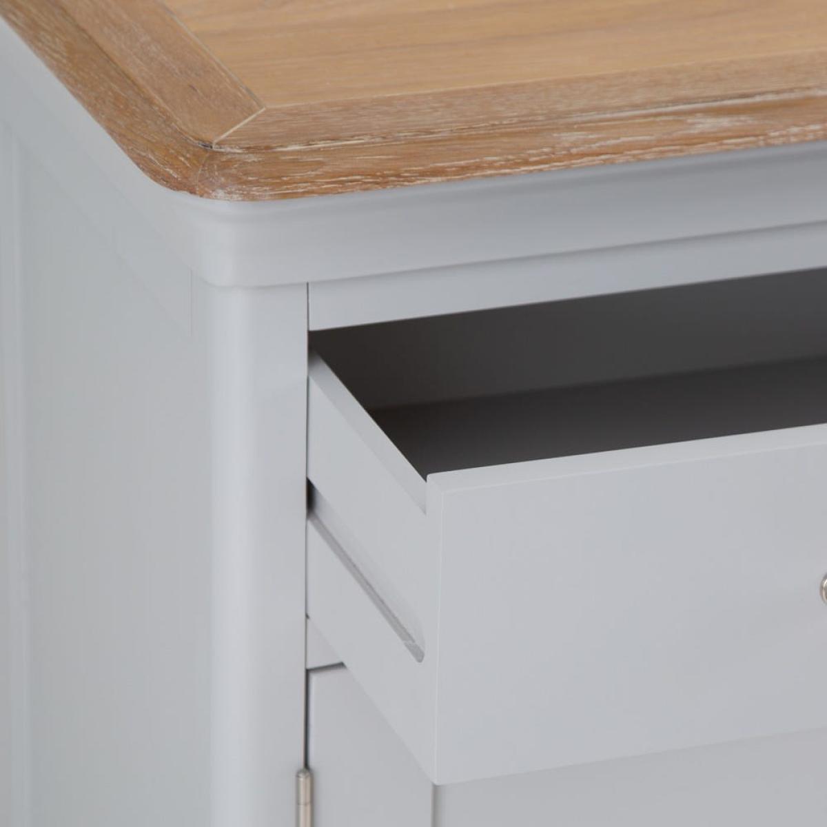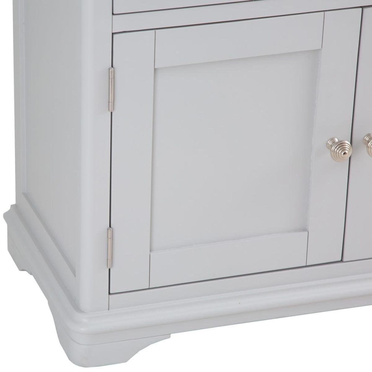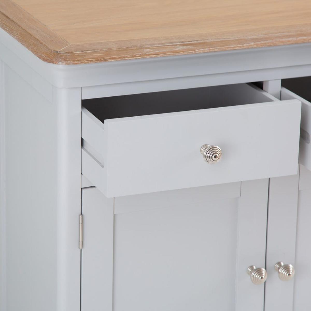 A practical storage unit and a super-handy sideboard all rolled into one, the Ashbourne grey painted 2 door small sideboard makes a welcome addition to your home furnishings. Finished in soft grey paint, this small sideboard sits quietly at the side of the room (the clue is in the name), blending effortlessly into many interior design styles. Its elegant oak top surface and sleek French-inspired bracket feet whisper of a quiet sophistication. This sideboard serenely complements both neutral tones and brighter interior design styles – it adds storage whilst making the room feel complete.
