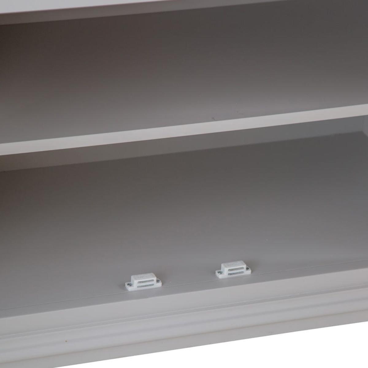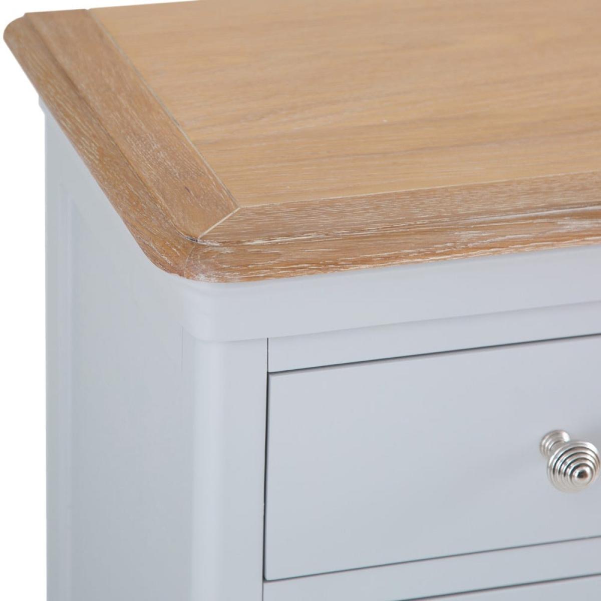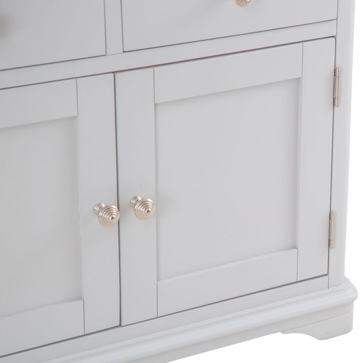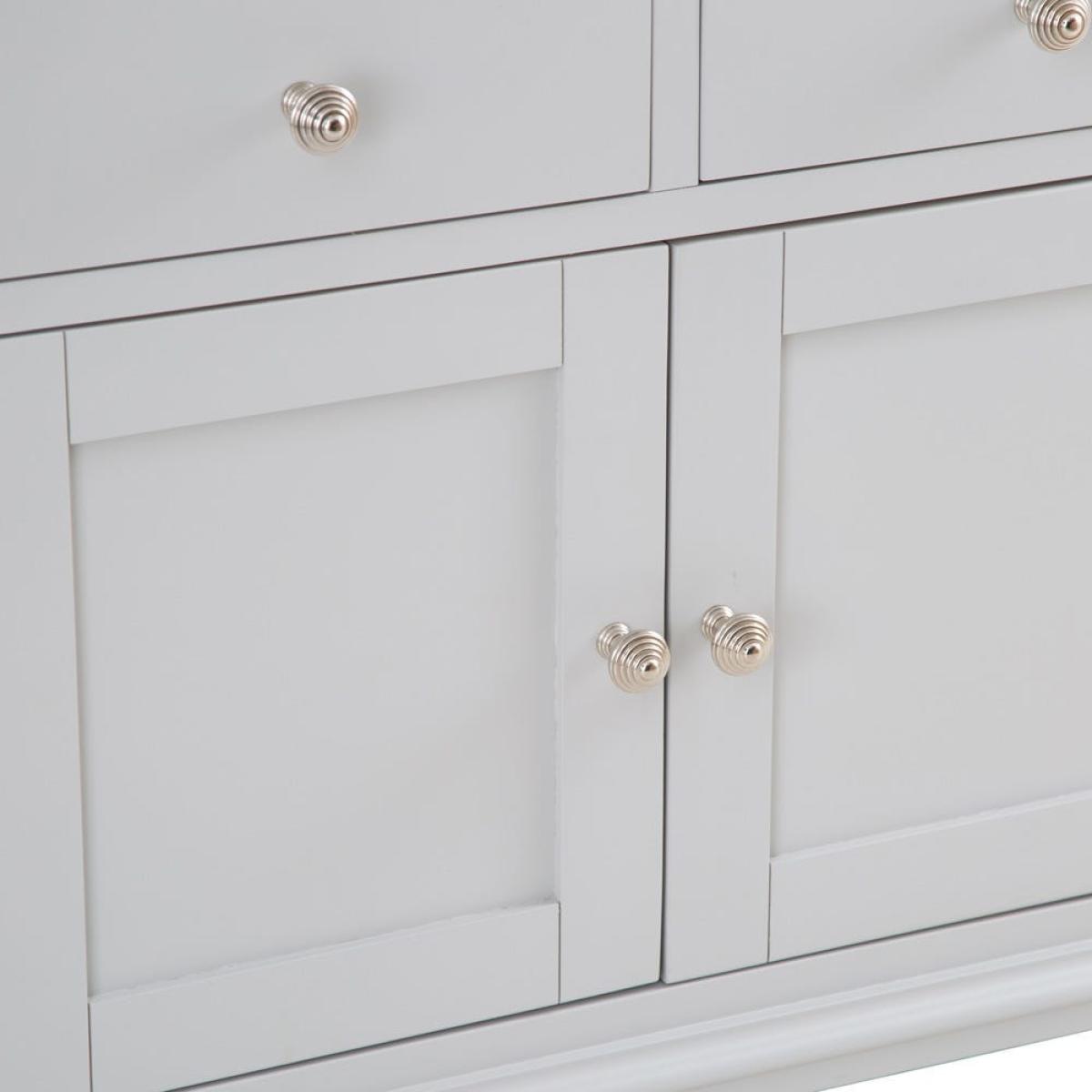 A practical storage unit and a super-handy sideboard all rolled into one, the Ashbourne grey painted 2 door small sideboard makes a welcome addition to your home furnishings. Finished in soft grey paint, this small sideboard sits quietly at the side of the room (the clue is in the name), blending effortlessly into many interior design styles. Its elegant oak top surface and sleek French-inspired bracket feet whisper of a quiet sophistication. This sideboard serenely complements both neutral tones and brighter interior design styles – it adds storage whilst making the room feel complete.