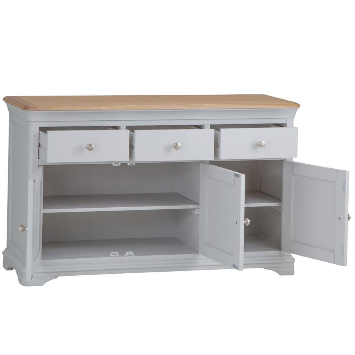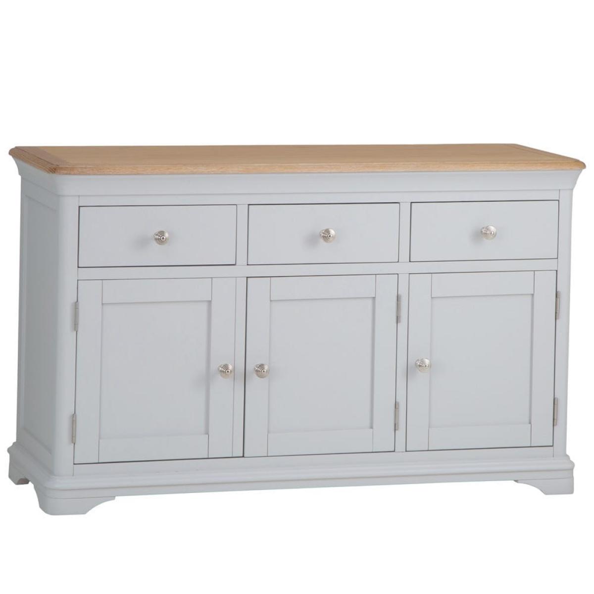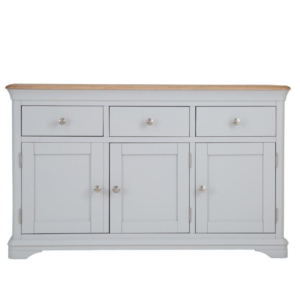 You’ll have more storage space than you’ll know what to do with when you purchase the Ashbourne grey painted 3 door large sideboard. Who knew a simple sideboard could make such a statement?. Stack the shelves with all that surplus glassware you’ve been struggling to find a home for and arrange the oak top with all your favourite vases and ornaments. Despite its impressive size, the subtle grey finish of this sturdy unit blends in seamlessly with neutral white tones or bright, vibrant decors. Whatever look you’re going for, this sideboard will add surface space, storage solutions and style.