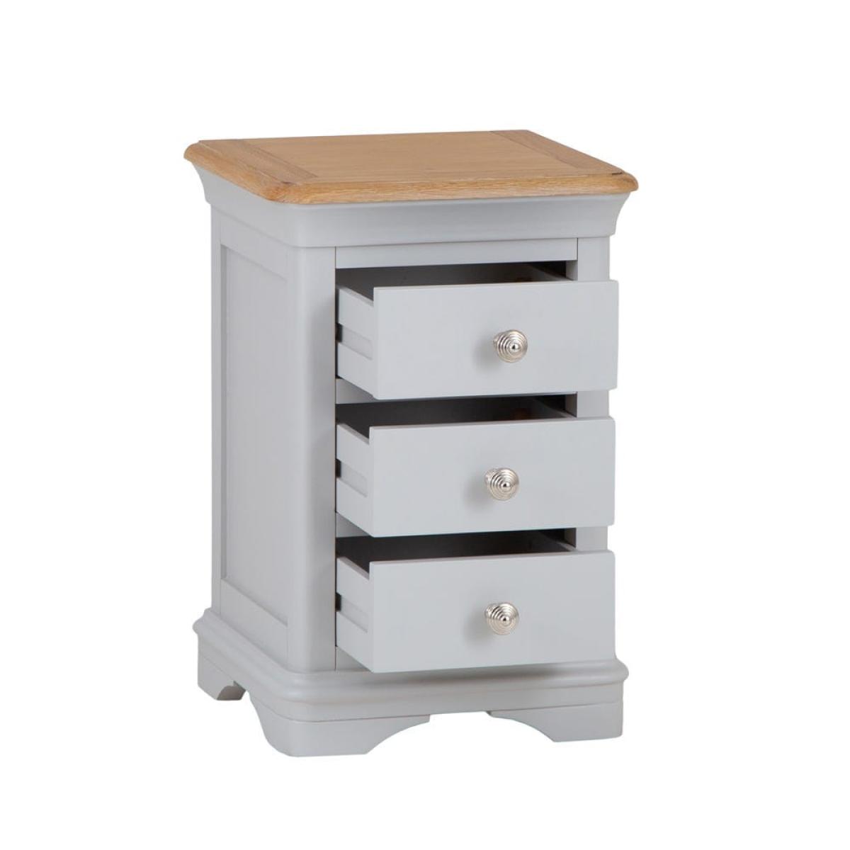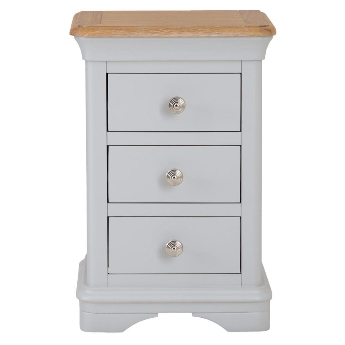Neat, demure and oh-so subtle, this dainty bedside table is just 40cm wide – ideal for bookending your bed without taking up too much precious floorspace. The Ashbourne Grey painted 3 drawer narrow bedside table also offers convenient storage for all your bedroom bits and pieces. Out of sight, out of mind (but within easy reach when you need to grab them). Finished in subtle grey offset by chrome drawer handles, this table looks especially lovely with a bedside lamp perched upon it to read by. Set down your favourite paperback after you’ve read a few pages and feel yourself drifting to the land of nod.