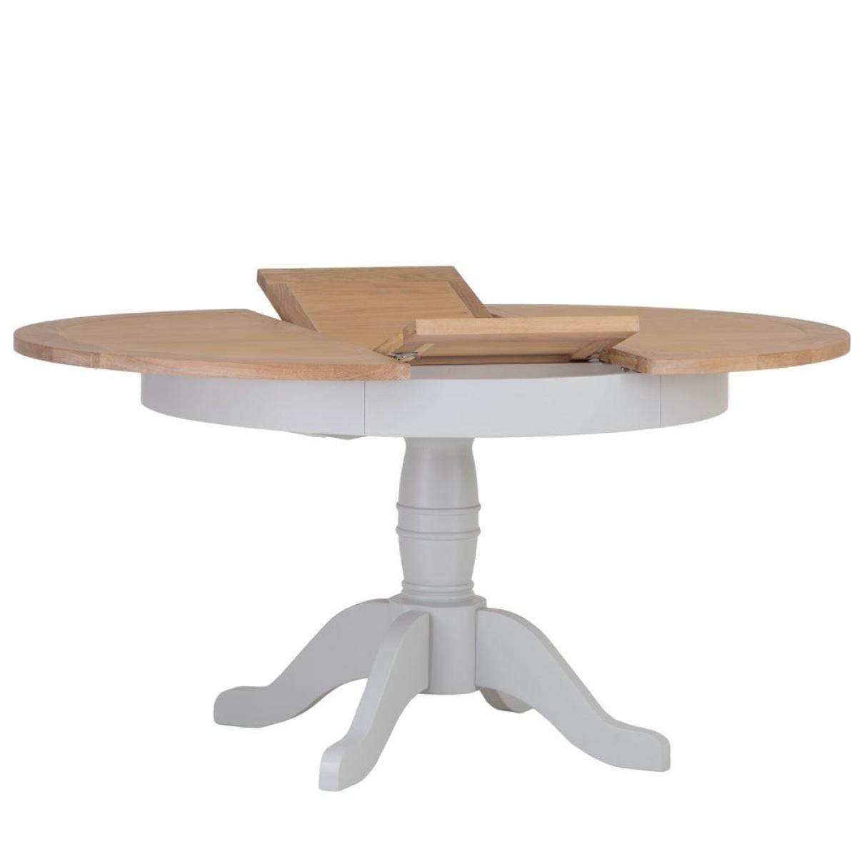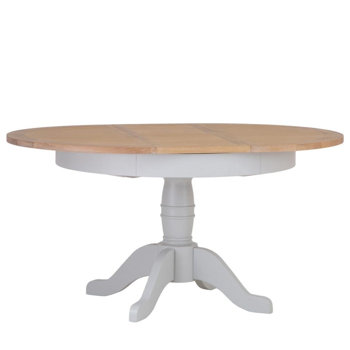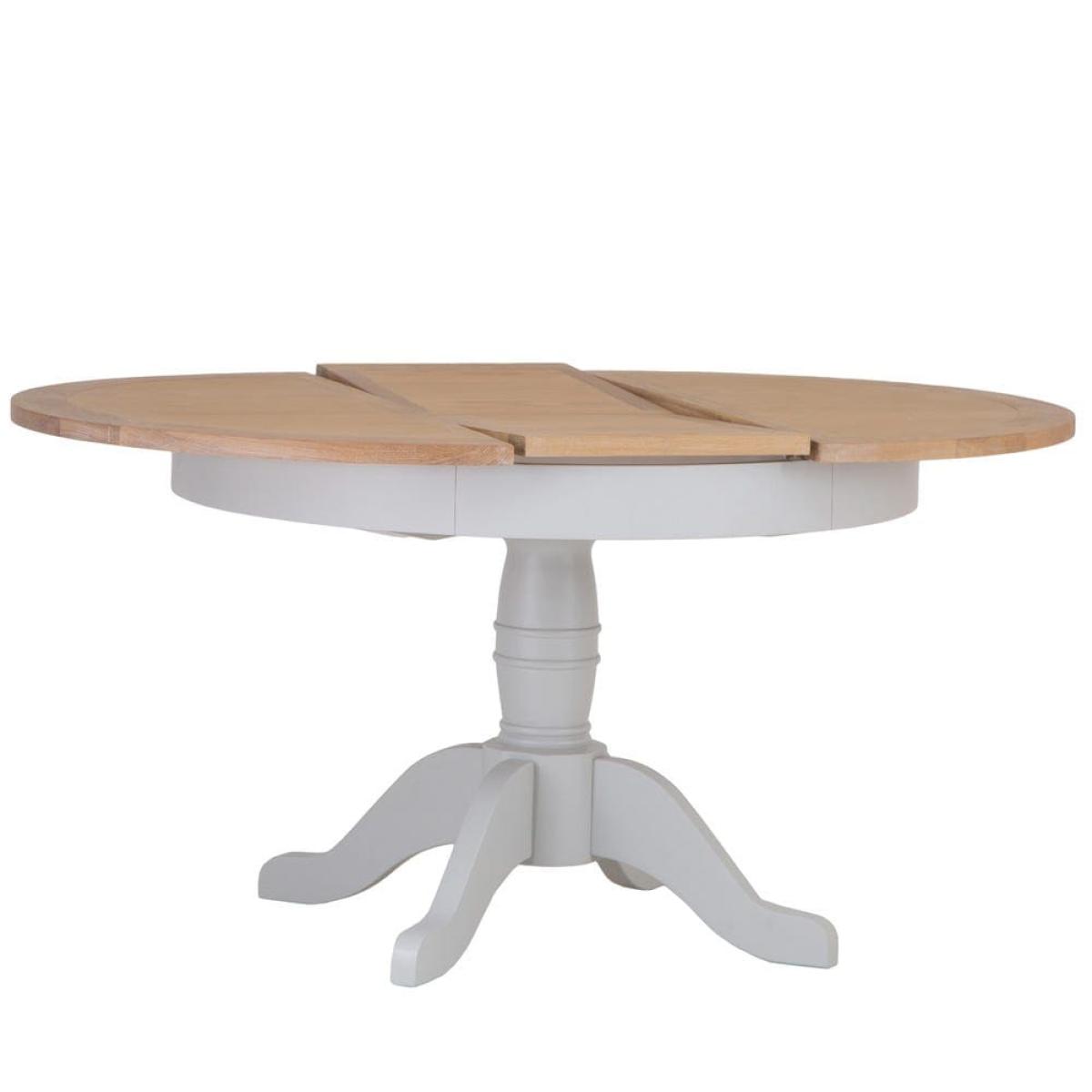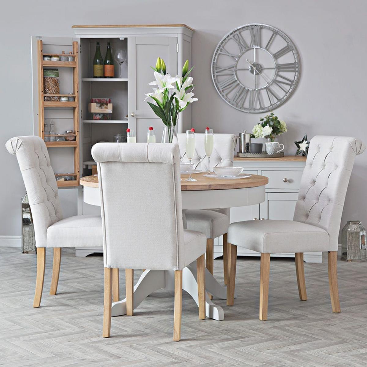 When dinner is served, there’s nothing quite as sociable as a round table. The Ashbourne grey painted round pedestal extending dining table is a sleek and stylish addition to any kitchen or dining space. From waking up over breakfast with that first tea of the day, to a cosy dinner on a chilly winter’s evening, this table caters to all needs. Its sturdy pine frame means it’ll last, and the soft grey finish fits in fabulously with even the most brightly patterned cushioned chairs. The smooth oak tabletop catches the light beautifully and will help make your dining space shine.