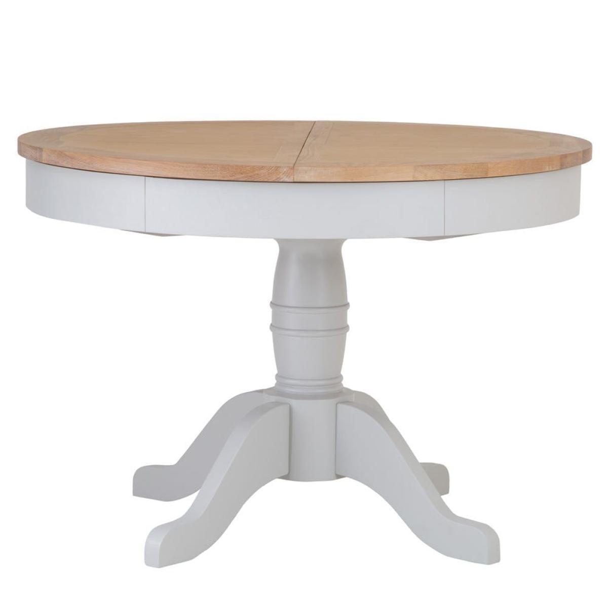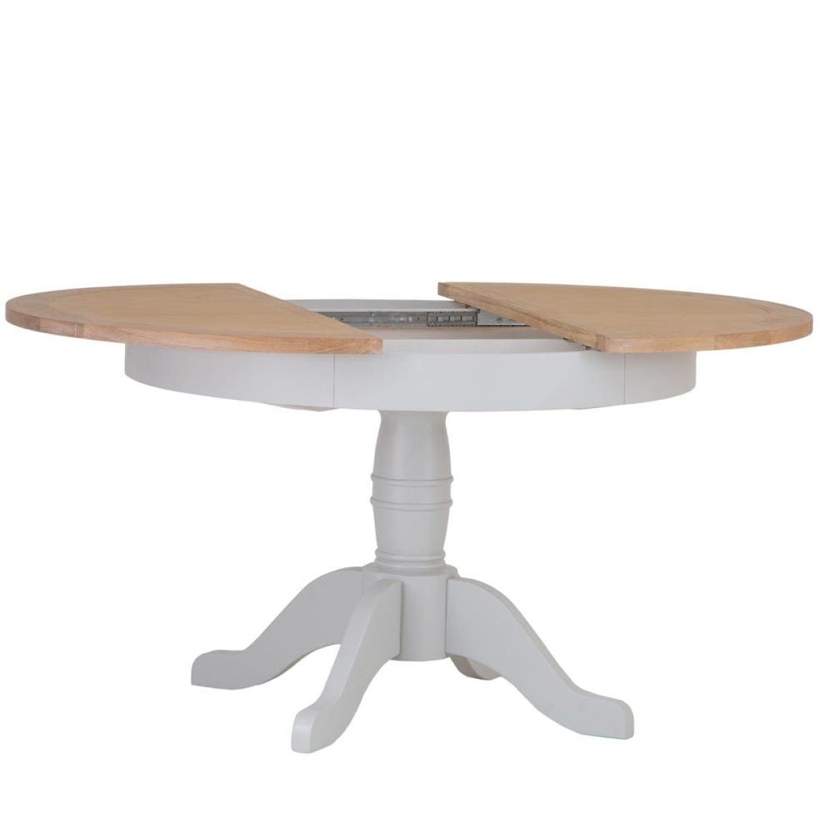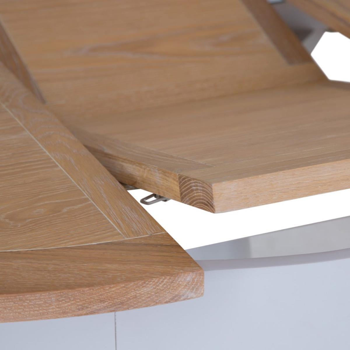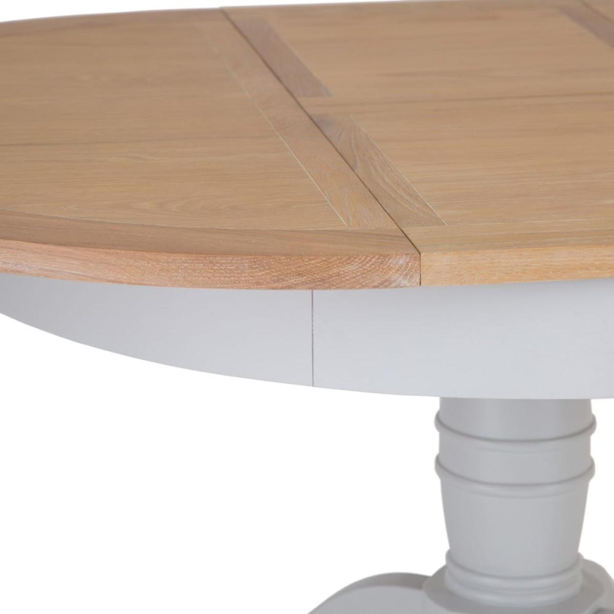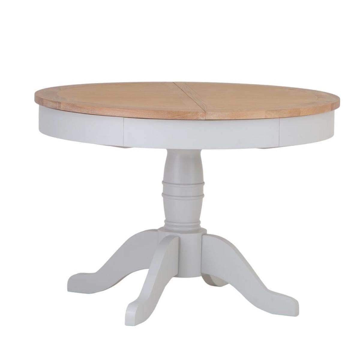 When dinner is served, there’s nothing quite as sociable as a round table. The Ashbourne grey painted round pedestal extending dining table is a sleek and stylish addition to any kitchen or dining space. From waking up over breakfast with that first tea of the day, to a cosy dinner on a chilly winter’s evening, this table caters to all needs. Its sturdy pine frame means it’ll last, and the soft grey finish fits in fabulously with even the most brightly patterned cushioned chairs. The smooth oak tabletop catches the light beautifully and will help make your dining space shine.