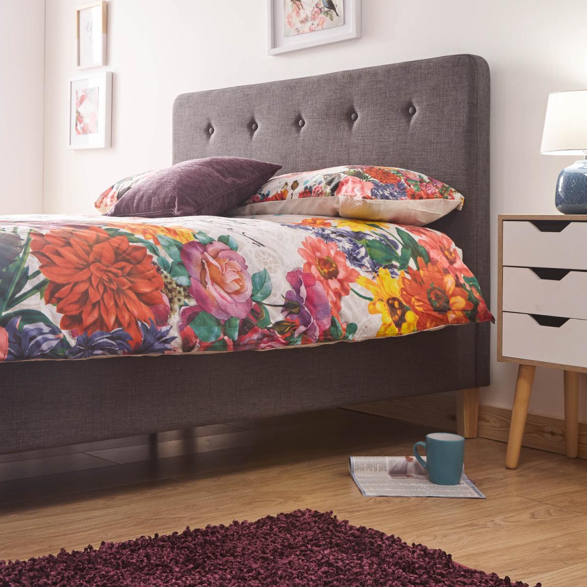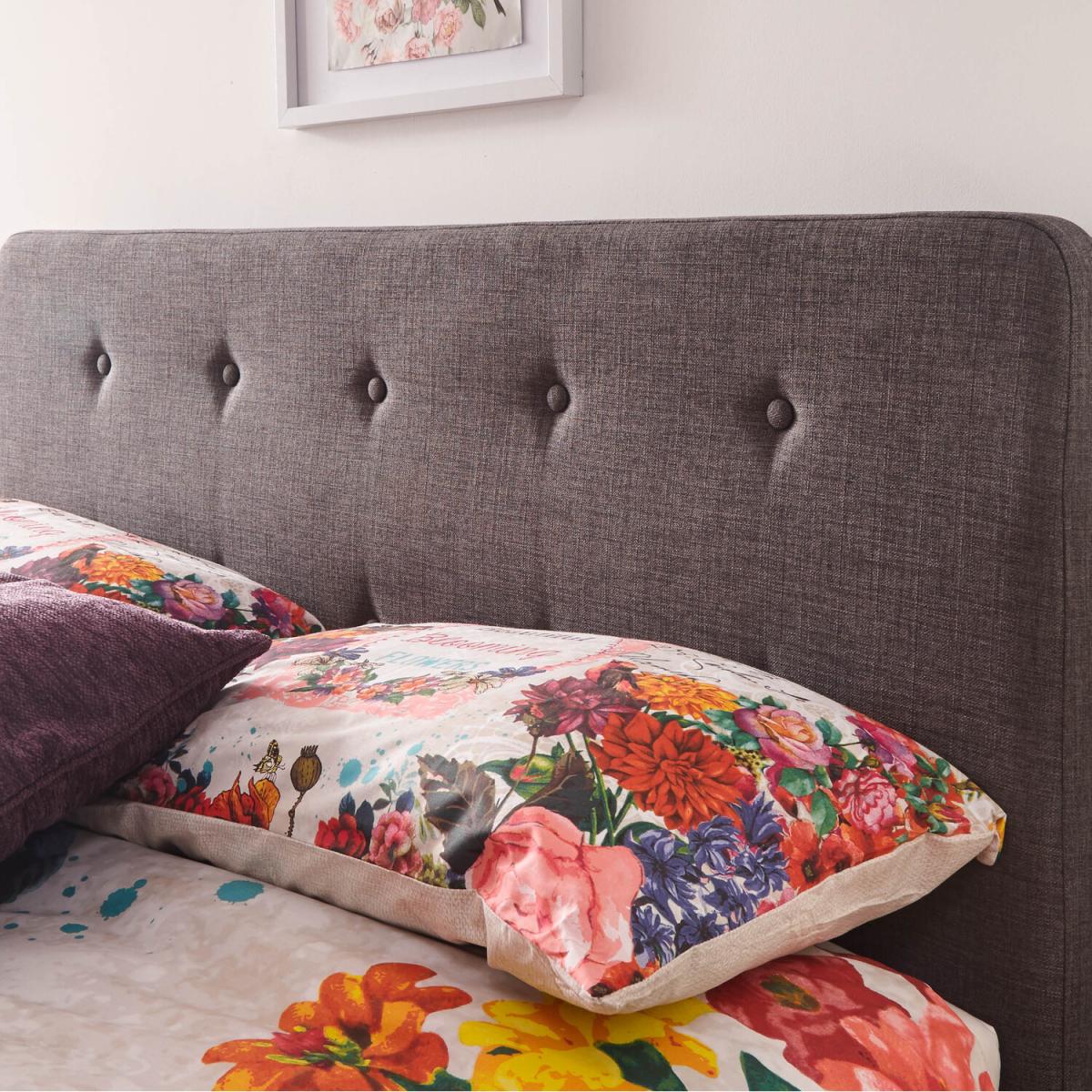 A lovely - and super-practical - addition to any contemporary home, this retro-style bedframe based on our existing Ashbourne bedstead features a fantastic raised storage area with a solid base. The sleek padded frame is upholstered in a smart, yet restrained hopsack in dark grey, with pale wooden legs providing effective contrast. A comfortable buttoned headboard provides a stylish boutique nish. Ashbourne makes a great partner for a chic, understated bedroom and is a good match for modern colour schemes.