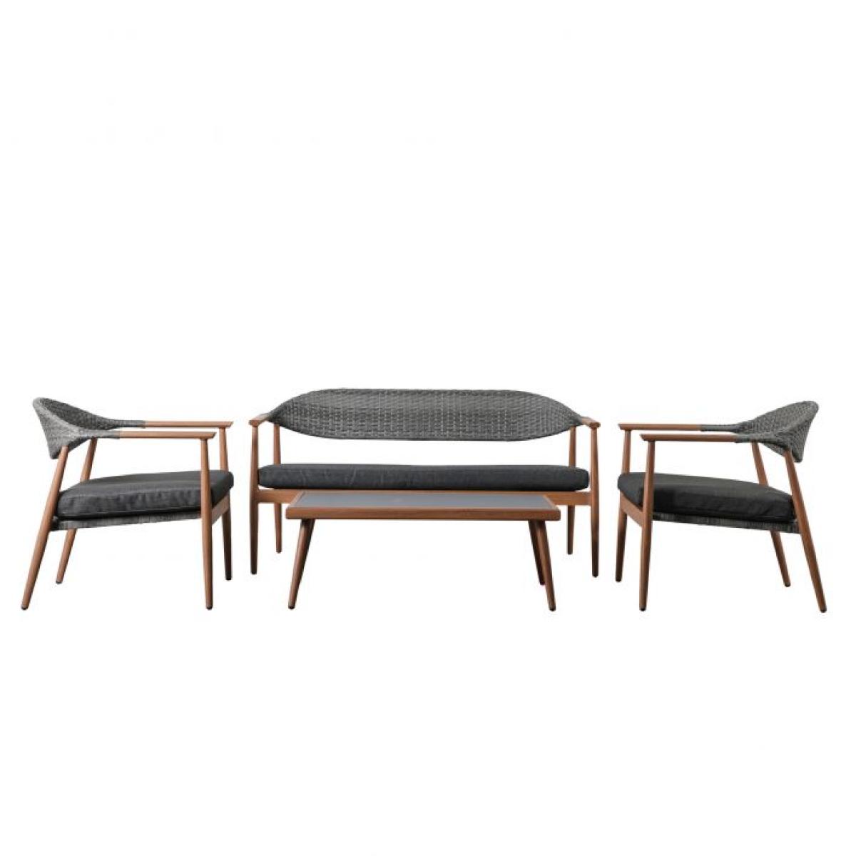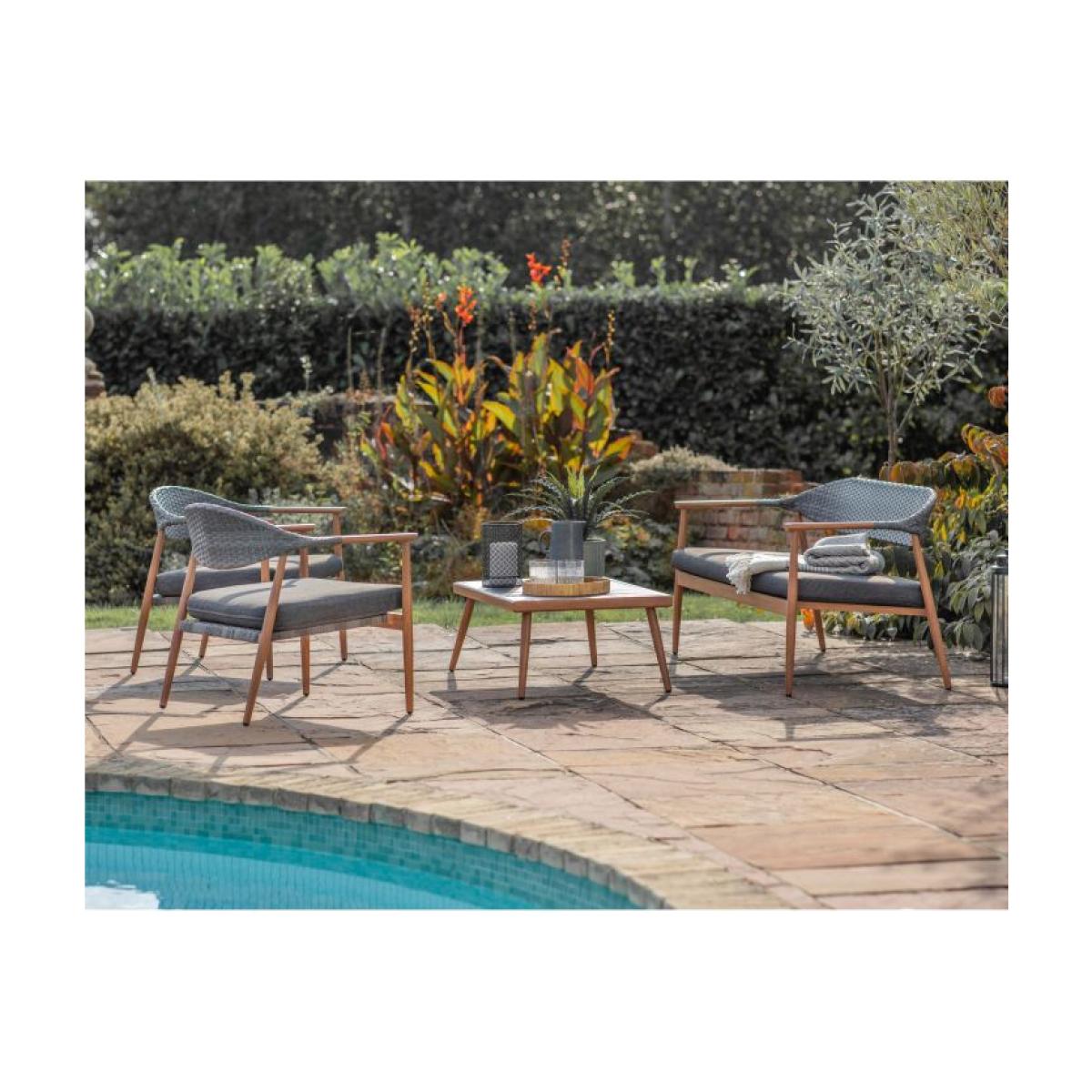 This contemporary Lounge Set offers two armchairs, a 2-seater sofa and a coffee table. The set features a stylish combination of wooden effect vinyl wrapped aluminium and all weather rattan in a double ribbed half-round weave, with a frosted glass top on the table. The chairs have showerproof scandi-style seat cushions. A matching dining set and bistro set are available. Material: Aluminium. Colour: Grey.