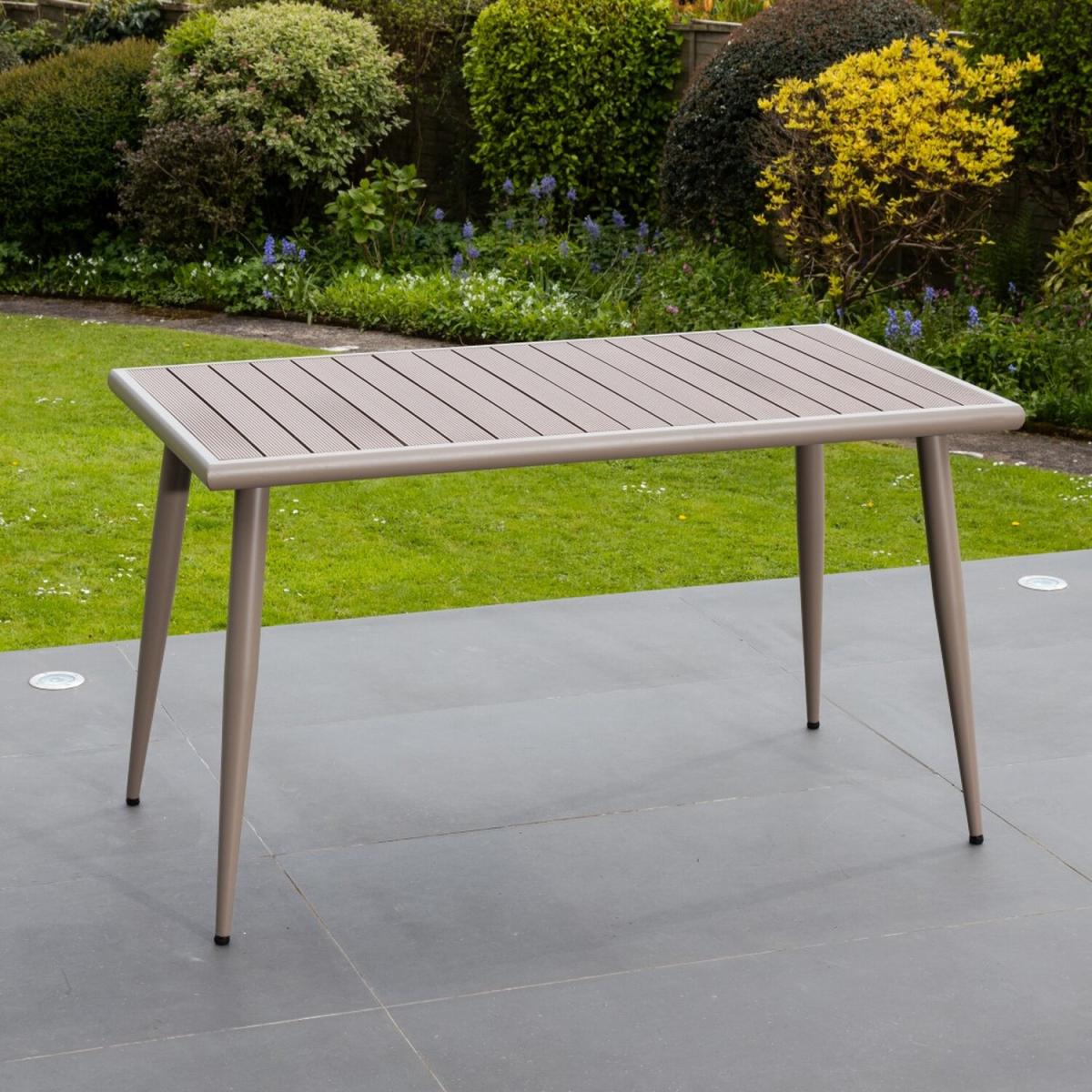 Elevate your outdoor dining experience with the Ashdown Outdoor Dining Table. Measuring 130 x 70cm and standing at a comfortable height of 75cm, this rectangular table provides ample space for hosting outdoor gatherings, ensuring everyone can gather around comfortably. Crafted with durability and style in mind, this option includes the table only, allowing you the flexibility to customize your outdoor seating arrangement according to your preferences and space. Constructed with a sturdy metal frame, the Ashdown Outdoor Dining Table offers stability and longevity, making it ideal for outdoor use in various weather conditions. Its solid PS wood effect plastic top and seats add a touch of elegance to your outdoor space while offering easy maintenance and cleaning, ensuring hassle-free upkeep for years to come. Whether you're hosting a barbecue, enjoying an alfresco meal, or simply relaxing outdoors, this table provides the perfect setting for all your outdoor entertaining needs. Designed for convenience, the Ashdown Outdoor Dining Table is easy to assemble with simple self-assembly instructions included, allowing you to set it up quickly and effortlessly. With our commitment to quick and efficient delivery, you can have your table delivered straight to your doorstep, ensuring prompt access to your new outdoor dining centerpiece. Enhance your outdoor space with the Ashdown Outdoor Dining Table and create memorable moments with friends and family in the comfort of your own backyard.